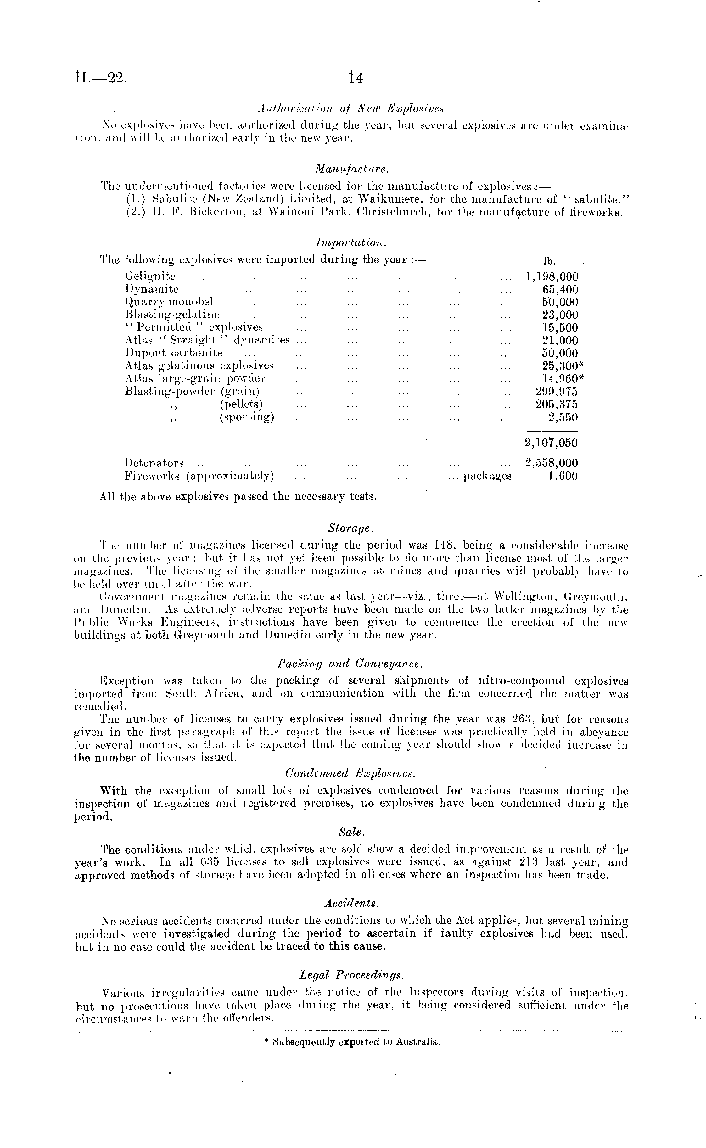 Authorization of New Explosives. No explosives have been authorized during the year, but several explosives are uudei examination, and will be authorized early in the new year. Manufacture. The undermentioned factories were licensed for the manufacture of explosives^— (1.) Sabulite (New Zealand) Limited, at Waikumete, for the manufacture of " sabulite." (2.) H. F. Bickerton, at Wainoni Park, Christchurrh, for the manufacture of fireworks. Importation. The following exjilosives were imported during the year : — lb. Gelignite ... ... ... ... ... ... ... 1,198,000 Dynamite ... ... ... ... ... ... ... 65,400 Quarry monobel ... ... ... ... ... ... 50,000 Blasting-gelatine ... ... ... ... ... ... 23,000 " Permitted " explosives ... ... ... ... ... 15,500 Atlas " Straight, " dynamites ... ... ... ... ... 21,000 Dupont carbonite ... ... ... ... ... ... 50,000 Atlas gelatinous explosives ... ... ... ... ... 25,300* Atlas large-grain powder ... ... ... ... ... 14,950* Blasting-powder (grain) ... ... ... ... ... 299,975 (pellets) ... ... ... ... ... 205,375 ~ (sporting) ... ... ... ... ... 2,550 2,107,050 Detonators ... ... ... ... ... ... ... 2,558,000 Fireworks (approximately) ... ... ... ...packages 1,600 All the above explosives passed the necessary tests. Storage. The number of magazines licensed during the period was 148, being a considerable increase on the previous year; but it has not yet been possible to do more than license most of the larger magazines. The licensing of the smaller magazines at mines and quarries will probably have to be held over until after the war. Government magazines remain the same as last year—viz., three—at Wellington, Grey mouth, and Dunedin. As extremely adverse reports have been made on the two latter magazines by the Public Works Engineers, instructions have been given to commence the erection of the new buildings at both Greymouth and Dunedin early in the new year. Packing and Conveyance. Fxception was taken to the packing of several shipments of nitro-conipouiid explosives imported from South Africa, and on communication with the firm concerned (he matter was remedied. The number of licenses to carry explosives issued during the year was 263, but for reasons given in the first paragraph of this report the issue of licenses was practically held in abeyance for several months, so that it is expected that the coming year should show a decided increase in the number of licenses issued. Condemned Explosives. With the exception of small lots of explosives condemned for various reasons during the inspection of magazines and registered premises, no explosives have been condemned during the period. Sale. The conditions under which explosives are sold show a decided improvement as a result of the year's work. In all 635 licenses to sell explosives were issued, as against 213 last year, and approved methods of storage have been adopted in all cases where an inspection has been made. Accidents. No serious accidents occurred under the conditions to which the Act applies, but several mining accidents were investigated during the period to ascertain if faulty explosives had been used, but in no case could the accident be traced to this cause. Legal Proceedings. Various irregularities came under the notice of the Inspectors during visits of inspection, but no prosecutions have taken place during the year, it, being considered sufficient under the circumstances to warn the offenders.
