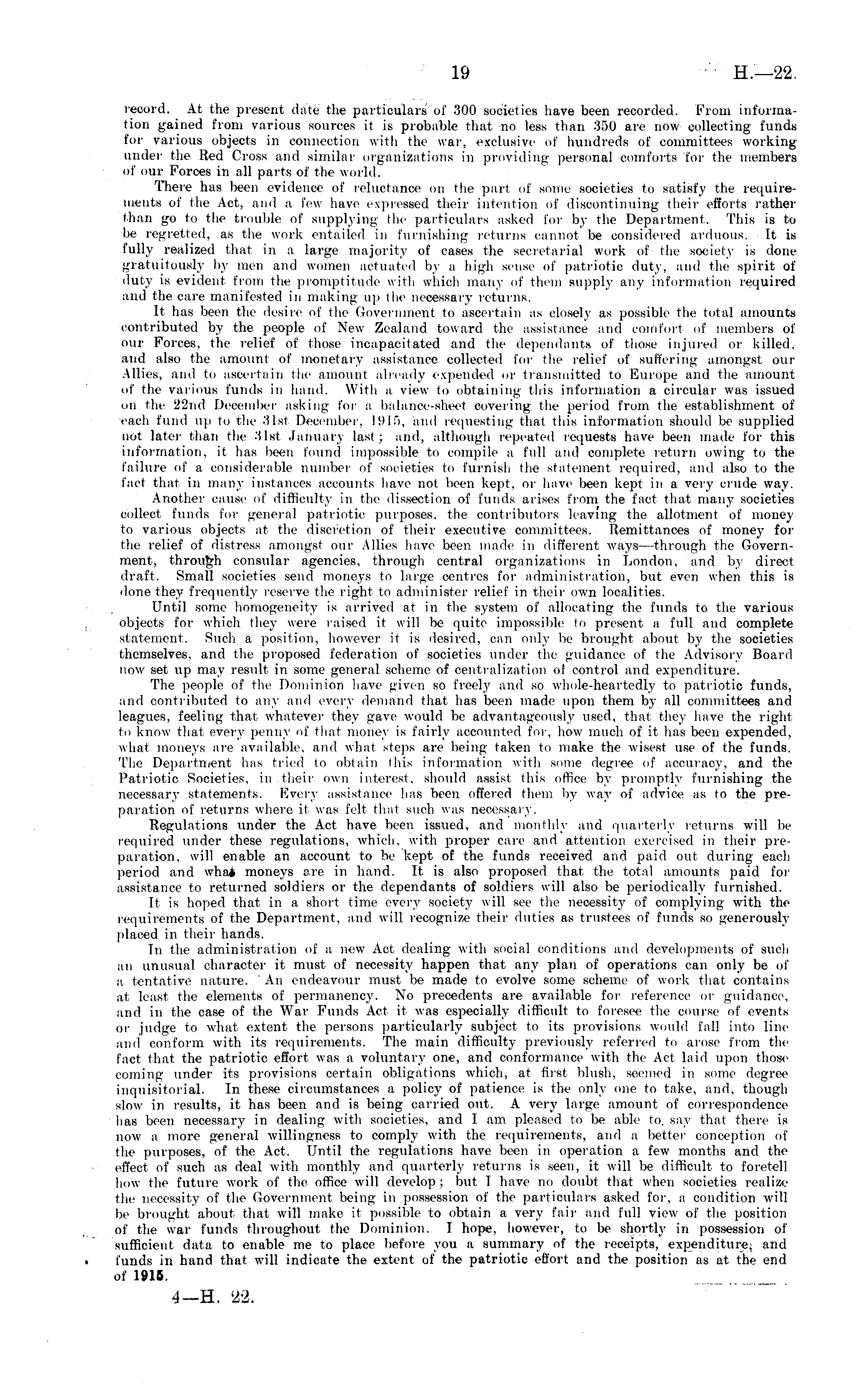 record. At the present date the particulars' of 300 societies have been recorded. From information gained from various sources it is probable that no less than 350 are now collecting funds for various objects in connection with the war, exclusive of hundreds of committees working under the Red Cross and similar organizations in providing personal comforts for the members of our Forces in all parts of the world. There has been evidence of reluctance on the part of some societies to satisfy the requirements of the Act, and a few have expressed their intention of discontinuing their efforts rather than go to the trouble of supplying the particulars asked for by the Department. This is to be regretted, as the work entailed in furnishing returns cannot be considered arduous. It is fully realized that, in a large majority of cases the secretarial work of the society is done gratuitously by men and women actuated by a high sense of patriotic duty, and the spirit of duty is evident from the promptitude with which many of them supply any information required and the care manifested in making up the necessary returns. It has been the desire of the Government to ascertain as closely as possible the total amounts contributed by the people of New Zealand toward the assistance and comfort of members of our Forces, the relief of those incapacitated and the dependants of those injured or killed, and also the amount of monetary assistance collected for the relief of suffering amongst our Allies, and to ascertain the amount already expended or transmitted to Europe and the amount of the various funds in hand. With a view to obtaining this information a circular was issued on the 22nd December asking for a balance-sheet covering the period from the establishment of each fund up to the 31st December, 1915, and requesting that this information should be supplied not later than the 31st January last; and, although repeated requests have been made for this information, it has been found impossible to compile a full and complete return owing to the failure of a considerable number of societies to furnish the statement required, and also to the fact that in many instances accounts have not been kept, or have been kept in a very crude way. Another cause of difficulty in the dissection of funds arises from the fact that many societies collect funds for general patriotic purposes, the contributors leaving the allotment of money to various objects at the discretion of their executive committees. Remittances of money for the relief of distress amongst our Allies have been made in different ways —through the Government, through consular agencies, through central organizations in London, and by direct draft. Smali societies send moneys to large centres for administration, but even when this is done they frequently reserve the right to administer relief in their own localities. Until some homogeneity is arrived at in the system of allocating the funds to the various objects for which they were raised it will be quite impossible to present a full and complete statement. Such a position, however it is desired, can only be brought about by the societies themselves, and the proposed federation of societies under the guidance of the Advisory Board now set up may result in some general scheme of centralization of control and expenditure. The people of the Dominion have given so freely and so whole-heartedly to patriotic funds, and contributed to any and every demand that has been made upon them by all committees and leagues, feeling that whatever they gave would be advantageously used, that they have the right to know that every penny of that money is fairly accounted for, how much of it has been expended, what moneys are available, and what steps are being taken to make the wisest use of the funds. The Department has tried to obtain this information with some degree of accuracy, and the •; Patriotic Societies, in their own interest, should assist this office by promptly furnishing the necessary statements. Every assistance has been offered them by way of advice as to the preparation of returns where it was felt that such was necessary. Regulations under the Act have been issued, and monthly and quarterly returns will be required under these regulations, which, with proper care and attention exercised in their preparation, will enable an account to be kept of the funds received and paid out during each period and whai moneys are in hand. It is also proposed that the total amounts paid for assistance to returned soldiers or the dependants of soldiers will also be periodically furnished. It is hoped that in a short time every society will see the necessity of complying with the requirements of the Department, and will recognize their duties as trustees of funds so generously placed in their hands. In the administration of a new Act dealing with social conditions and developments of such an unusual character it must of necessity happen that any plan of operations can only be of a tentative nature. ' An endeavour must be made to evolve some scheme of work that contains at least the elements of permanency. No precedents are available for reference or guidance, and in the case of the War Funds Act, it was especially difficult to foresee the course of events oi- judge to what extent the persons particularly subject to its provisions would fall into line and conform with its requirements. The main difficulty previously referred to arose from the fact that the patriotic effort was a voluntary one, and conformance with the Act laid upon those coming under its provisions certain obligations which, at first blush, seemed in some degree inquisitorial. In these circumstances a policy of patience is the only one to take, and, though slow in results, it has been and is being carried out. A very large amount of correspondence has been necessary in dealing with societies, and I am pleased to be able to. say that there is now a more general