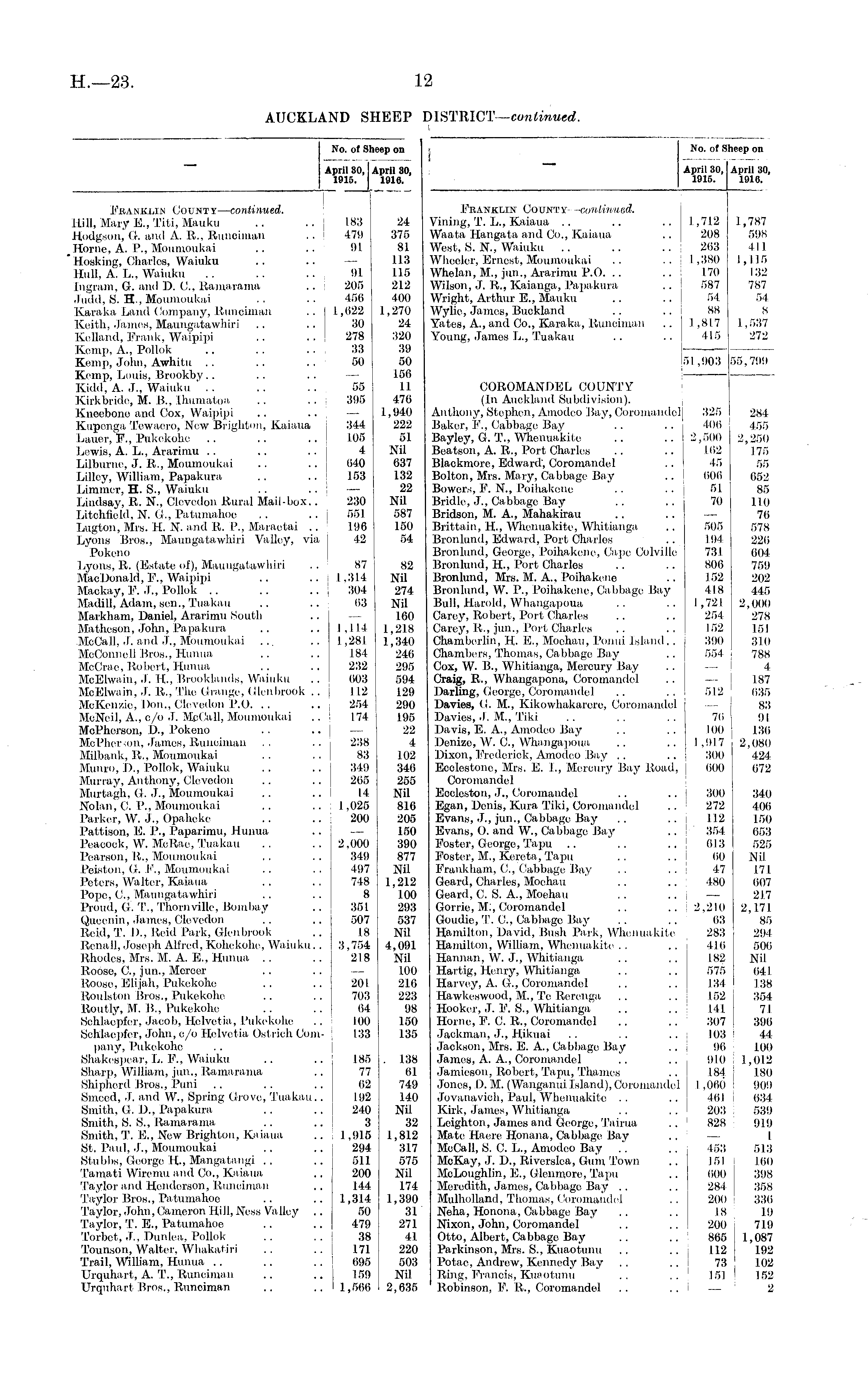 I No. of SI | April 30, j 1915. heep on April 30, 1916. | No. of SI April 30, 1915. heep on April 30, 1916. Fbakklin County— continued. Hill, Mary E., Titi, Mauku .. ... - 183 Hodgson, G. and A. R., Runciman .. 470 Home, A. P., Moumoukai .. .. 91 Hosking, Charles, Waiuku .. .. ! Hull, A. L, Waiuku .. .. .. 91 Ingram, G. and D. ft, Ramarama .. 205 Judd, S. H-, Moumoukai .. .. 456 Karaka Land Company, Runciman .. 1,022 Keith, James, Maungatawhiri .. .. 30 Kelland, Frank, Waipipi .. .. 278 Kemp, A., Pollok .. .. .. 33 Kemp, John, Awhitu .. .. .. 50 Kemp, Louis, Brookby Kidd, A. J., Waiuku .. .. .. 55 Kirkbride, M. B., Ihumatoa .. .. 395 Kueebone and Cox, Waipipi Kupenga Tewaero, New Brighton, Kaiaua 344 Laucr, P., Pukekohe .. .. .. 105 Lewis, A. L., Ararimu .. .. .. 4 Lilburne, J. R., Moumoukai .. .. 040 Lilley, William, Papakura .. .. 153 Limmer, H. S., Waiuku . . .. — Lindsay, R. N., Clevedon Rural Mail-box.. 230 Litchfield, N. G., Patumahoe .. .. 551 Lugton, Mrs. "H. N. and R. P., Maraetai .. ' 196 Lyons Bros., Maungatawhiri Valley, via I 42 Pokeno Lyons, R. (Estate of), Maungatawhiri . . 87 MacDonald, F., Waipipi .. .. 1,314 Mackay, F. J., Pollok .. .. .. 304 Madill, Adam, sen., Tuakau .. .. 03 Markham, Daniel, Ararimu South Matheson, John, Papakura .. .. 1,114 McCall, J. and, J., Moumoukai ... .. I ,281 McConnell Bros., Hunua .. .. .184 McCrae, Robert, Hunua .. .. 232 McElwain, J. IL, Brooklands, Waiuku .. 003 McElwain, J. R., The Grange, Glenbrook .. 112 McKenzie, Don., Clevedon P.O. .. .. 254 McNeil, A., c/o J. MeCall, Moumoukai .. 174 McPherson, D., Pokeno .. .. — McPherson, James, Runciman . . .. 238 Milbank, R., Moumoukai . . .. 83 Munro, D., Pollok, Waiuku . . .. 349 Murray, Anthony, Clevedon .. .. 205 Murtagh, G. J., Moumoukai .. .. 14 Nolan, ft P., Moumoukai .. .. 1,025 Parker, W. J., Opaheke .. .. 200 Pattison, E. P., Paparimu, Hunua Peacock, W. McRae, Tuakau .. .. 2,000 Pearson, R., Moumoukai . . . . .34!) Peiston, G. F., Moumoukai .. . . 407 Peters, Walter, Kaiaua . . . . 748 Pope, ft, Maungatawhiri .. .. 8 Proud, G. T-.i Tliornville, Bombay .. 351 Quoenin, James, Clevedon .. .. 507 Reid, T. 1)., Reid Park, Glenbrook .. 18 RcnaII, Joseph Alfred, Kohckohe, Wainku.. 3,754 Rhodes, Mrs. M. A. E., Hunua .. .. 218 Roose, ft, jun., Morcer Roose, Elijah, Pukekohe .. .. 201 Roulston Bros., Pukekohe .. .. 703 Routly, M. B„ Pukekohe .. .. 04 Schlaepfer, Jacob, Helvetia, Pukekohe .. 100 Schlaopfcr, John, e/o Helvetia Ostrich Com- 133 pany, Pukekohe Shakcspcar, L. P., Waiuku .. ... 185 Sharp, William, jun., Ramarama .. 77 Shiphcrd Bros., Puni .. . . .. 02 Smced, J. and W., Spring Grove, Tuakau.. 192 Smith, G. D., Papakura .. .. 240 Smith, S. S., Ramarama .. .. 3 Smith, T. E., New Brighton, Kaiaua .. 1,915 St. Paul, J., Moumoukai .. .. 294 Stubbs, George H., Mangatangi .. .. 511 Tainati Wiremu and Co., Kaiaua .. 200 Taylor and Henderson, Runciman .. 144 Taylor Bros., Patumahoe .. .. 1,314 Taylor, John, Cameron Hill, Ness Valley .. 50 Taylor, T. E., Patumahoe .. .. 479 T'orbet, J., Dunlea, Pollok .. .. 38 Tounson, Walter, Whakatiri .. .. 171 Trail, William, Hunua .. .. .. I 095 Urquhart, A. T., Runciman .. .. 159 Urquhart Bros., Runciman .. .. 1,506 24 375 81 113 115 212 400 1,270 24 320 39 50 156 11 476 1,940 222 51 Nil 037 132 22 Nil 587 150 54 82 Nil 274 Nil 160 1,218 1,340 246 295 594 129 290 195 22 4 102 340 255 Nil 816 205 150 390 877 Nil 1,212 100 293 537 NU 4,091 Nil 100 216 223 98 150 135 Franklin County— continued. Vining, T. L., Kaiaua .. Waata Hangata and Co., Kaiaua West, S. N., Waiuku Wheeler, Ernest, Moumoukai Whelan, M., jun., Ararimu P.O. Wilson, J. R., Kaianga, Papakura Wright, Arthur E., Mauku Wylic, James, Buckland Yates, A., and Co., Karaka, Runciman Young, James L., Tuakau COROMANDEL COUNTY (In Auckland Subdivision). Anthony, Stephen, Amodeo Bay, Coromandel Baker, P., Cabbage Bay Bayley, G. T., Whenuakite Beatson, A. R., Port Charles Blackmore, Edward', Coromandel Bolton, Mrs. Mary, Cabbage Bay Bowers, F. N., Poihakene Bridle, J., Cabbage Bay Bridson, M. A., Mahakirau Brittain, EC, Whenuakite, Whitianga Bronlund, Edward, Port Charles Bronlund, George, Poihakene, Cape Colvillc Bronlund, EL, Port Charles Bronlund, Mrs. M. A., Poihakene Bronlund, W. P., Poihakene, Cabbage Bay Bull, Harold, Whangapoua Carey, Robert, Port Charles Carey, R., jun., Port Charles Chamberlin, H. E., Moehau, Ponui Island . . Chambers, Thomas, Cabbage Bay Cox, W. B., Whitianga, Mercury Bay Craig, R., Whaugapona, Coromandel Darling, George, Coromandel Davies, G. M., Kikowhakarerc, Coromandel Davies, J. M., Tiki Davis, E. A., Amodeo Bay Denize, W. ft, Whangapoua Dixon, Frederick, Amodeo Bay Ecclcstonc, Mrs. E. I., Mercury Bay Road, Coromandel Eccleston, J., Coromandel Egan, Denis, Kura Tiki, Coromandel Evans,.)., jun., Cabbage Bay Evans, O. and W., Cabbage Bay Poster, George, Tapu Foster, M., Kereta, Tapu Prankham, ft, Cabbage Bay Geard, Charles, Moehau Geard, C. S. A., Moehau Gorrie, Ml, Coromandel Goudie, T. ft, Cabbage Bay Hamilton, David, Bush Park, Whenuakite Hamilton, William, Whenuakite Hannan, W. J., Whitianga Hartig, Henry, Whitianga Harvey, A. G., Coromandel Hawkeswood, M., To Rcrciiga Hooker, J. P. S., Whitianga Home, F. C. R., Coromandel Jaokman, J., Hikuai Jackson, Mrs. E. A., Cabbage Bay James, A. A., Coromandel Jamieson, Robert, Tapu, 'Thames Jones, D. M. (Wanganui Island), Coromandel Jovanavieli, Paul, Whenuakite Kirk, James, Whitianga Leighton, James and George, Tairua Mate Haere Honana, Cabbage Bay McCall, S. C. L., Amodeo Bay .. McKay, J. D., Riverslea, Gum Town McLoughlin, E., Glenmore, Tapu Meredith, James, Cabbage Bay Mulholland, Thomas, Coromandel Neha, Honona, Cabbage Bay Nixon, John, Coromandel Otto, Albert, Cabbage Bay Parkinson, Mrs. S., Kuaotunu Potae, Andrew, Kennedy Bay Ring, Francis, Kuaotunu Robinson, P. R., Coromandel 1,712 1,787 208 598 203 411 1,380 1,115 170 132 587 787 54 54 88 S 1,817 1,537 415 272 51,903 55,799 325 284 406 455 2,500 2,250 162 175 45 