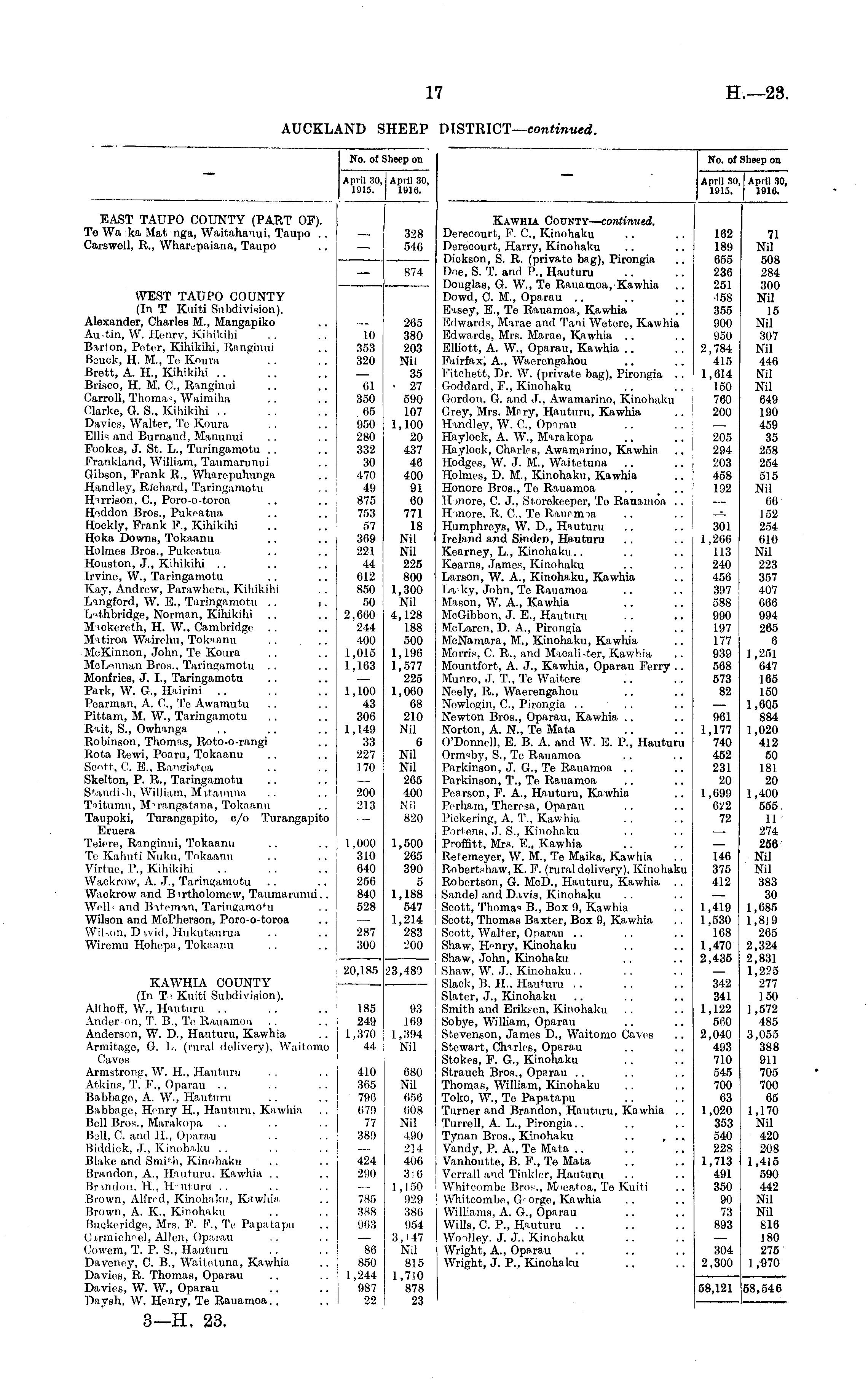 No. of Sheep on April 30, April 3C 1915. 1910. No. of Sheep on April 30, April 30, 1915. 1916. April 30, 1910. EAST TAUPO COUNTY (PART OF). Te Wa ka Mat nga, Waitahanui, Taupo .. Carswell, R., Wharepaiana, Taupo 328 540 Kawhia County— continued. Derecourt, F. G, Kinohaku Derecourt, Harry, Kinohaku Dickson, S. R. (private bag), Pirongia Doe, S. T. and P., Hauturu Douglas, G. W., To Rauamoa, Kawhia Dowd, C. M., Oparau Eisey, E., Te Rauamoa, Kawhia Edwards, Marae and Tani Wetcre, Kawhia Edwards, Mrs. Marae, Kawhia Elliott, A. W., Oparau, Kawhia Fairfax, A., Waerc.ngahou Fitohett, Dr. W. (private bag), Pirongia .. Goddard, P., Kinohaku Gordon, G. and J., Awamariuo, Kinohaku Grey, Mrs. Mnry, Hauturu, Kawhia Handley, W. ft, Oparau Haylock, A. W., Marakopa Haylock, Charles, Awamarino, Kawhia Hodges, W. J. M., Waitetuna Holmes, D. M., Kinohaku, Kawhia Honore Bros., Te Rauamoa II more, C. J., Storekeeper, To Rauamoa .. H more, R. ft. Te Raurmia Humphreys, W. D., Hauturu Ireland and Sindcn, Hauturu Kearney, L., Kinohaku.. Kearns, Jamos, Kinohaku Larson, W. A., Kinohaku, Kawhia La ky, John, To Rauamoa Mason, W. A., Kawhia McGibbon, J. E., Hauturu McLaren, D. A., Pirongia McNamara, M., Kinohaku, Kawhia Morris, C. R., and Maoalister, Kawhia Mountfort, A. J., Kawhia, Oparau Ferry .. Munro, J. T., Te Waiters Neely, R., Waerengahou Ncwlegin, ft, Pirongia Newton Bros., Oparau, Kawhia .. Norton, A. N., Te Mata O'Donnell, E. B. A. and W. E. P., Hauturu Ormsby, S., Te Rauamoa Parkinson, J. G., Te Rauamoa Parkinson, T., Te Rauamoa Pearson, F. A., Hauturu, Kawhia Pcrham, Theresa, Oparau Pickering, A. T., Kawhia Portens. J. S.. Kinohaku Proffitt, Mrs. E., Kawhia Retemeyer, W. M., To Maika, Kawhia Robertshaw,K. F. (rural delivery), Kinohaku Robertson, G. McD, Hauturu, Kawhia .. Sandel and D.ivis, Kinohaku Scott, Thomas B., Box 9, Kawhia Scott, Thomas Baxter, Box 9, Kawhia Scott, Walter, Oparau Shaw, Hmry, Kinohaku Shaw, John, Kinohaku Shaw, W. J.. Kinohaku.. Slack, B. H.. Hauturu Slater, J., Kinohaku Smith and Eriksen, Kinohaku Sobye, William, Oparau Stevenson, James D>, Waitomo Caves Stewart, Charles, Oparau Stokes, F. G., Kinohaku Strauch Bros., Opnran .. Thomas, William, Kinohaku Toko, W., Te Papatapu Turner and Brandon, Hauturu, Kawhia .. Turrell, A. L., Pirongia.. Tynan Bros., Kinohaku .. ... Vandy, P. A., Te Mata Vanhoutte, B. F., To Mata Verrall and Tinkler, Hautum Whitcombe Bros., Moeatoa, Te Kuiti Whitcombe, G' orge, Kawhia Williams, A. G., Oparau Wills, G P., Hauturu .. Wo-)lley. J. J.. Kinohaku Wright, A., Oparau Wright, J. P., Kinohaku 162 189 655 236 251 ■158 355 900 950 2,784 415 1,614 150 760 200 71 Nil 508 284 300 Nil 15 Nil 307 Nil 446 Nil Nil 649 190 459 35 258 254 515 Nil 06 152 254 610 Nil 223 357 407 006 994 265 0 1,251 647 165 150 1,605 884 1,020 412 50 181 20 1,400 555 11 274 256 Nil Nil 383 30 1,085 1,819 265 2,324 2,831 1,225 277 150 1,572 485 3,055 388 911 705 700 65 1,170 Nil 420 208 1,415 590 442 Nil Nil 816 180 275 1 ,970 WEST TAUPO COUNTY (In T Kuiti Subdivision). Alexander, Charles M., Mangapiko Au.tin, W. Henrv, Kihikihi Barton, Peter, Kihikihi, Ranginui Bouck, H. M., Te Koura Brett, A. H., Kihikihi .. Brisco, H. M. ft, Ranginui Carroll, Waimiha Clarke, G. S., Kihikihi Davies, Walter, Te Koura Ellis and Burnanil, Manunui Fookes, J. St. L., Turingamotu Frankland, William, Taumarunui Gibson, Frank R., Wharepuhunga Handley, Richard, Taringamotu Harrison, ft, Poro-o-toroa Heddon Bros., Pukeatua Hockly, Frank P., Kihikihi Hoka Downs, Tokaanu Holmes Bros., Pukeatua Houston, J., Kihikihi .. Irvine, W., Taringamotu Kay, Andrew, Parawhcra, Kihikihi Langford, W. E., Taringamotu .. ,. Lethbridge, Norman, Kihikihi Mackereth, H. W., Cambridge Matiroa Wairchu, Toknanu McKinnon, John, Te Koura McLinnan Bros., Taringamotu Monfries, J. I., Taringamotu Park, W. G., Hairini Poarman, A. G, Te Awamutu Pittam, M. W., Taringamotu Rait, S., Owhanga Robinson, Thomas, Roto-o-rangi Rota Rewi, Poaru, Tokaanu Scott, C. E., Ransiatoa Skelton, P. R., Taringamotu Standi-h, William, Mitaiuma Tiitumu, MTangatana, Tokaanu Taupoki, Turangapito, c/o Turangapito Eruera Teiere, Ranginui, Tokaanu Te Kahuti Nuku, Tokaanu Virtue, P., Kihikihi Wackrow, A. J., Taringamotu Wackrow and Birtholomow, Taumarunui.. Well- and Baseman, Taringamo f u WUson and McPherson, Poro-o-toroa WiEon, Divid, Hukutaurua Wiremu Hohepa, Tokaanu 874 10 353 320 01 350 05 950 280 332 30 470 49 875 753 57 309 221 44 612 850 50 2,660 244 400 1,0.15 1,103 205 380 203 Nil 35 27 590 107 1,100 20 437 46 400 91 60 771 18 Nil Nil 225 800 1,300 Nil 4,128 188 500 1,190 1,577 225 1,000 68 210 Nil 6 NU Nil 265 400 Nil 820 205 294 203 458 192 301 1,206 113 240 456 397 588 990 197 177 939 568 573 82 1,100 43 300 1,149 33 227 170 961 1,177 740 452 231 20 1,099 622 72 200 213 1,000 310 640 256 840 528 1,500 265 390 5 1,188 547 1,214 283 200 146 375 412 287 300 1,419 1,530 168 1,470 2,435 KAWHIA COUNTY (In To Kuiti Subdivision). Althoff, W., Hauturu Anderson, T. B., Te Rauamoa Anderson, W. D., Hauturu, Kawhia Armitage, G. L. (rural delivery), Waitomo Caves Armstrong, W. H., Hauturu Atkins, T. F., Oparau Babbage, A. W., Hauturu Babbage, Henry IL, Hauturu, Kawhia Bell Bros., Marakopa Bell, C. and H., Oparau Biddick, J., Kinohaku .. Blake and Smith, Kinohaku ' .. Brandon, A., Hauturu, Kawhia Br',ndon. H., Hnturu Brown, Alfred, Kinohaku, Kawhia Brown, A. K, Kinohaku Buokeridge, Mrs. F. F., Te Papatapu Cirmichael, Allen, Oparau Cowem, T, P. S., Hauturu Davcney, C. B., Waitetuna, Kawhia Davies, R. Thomas, Oparau Davies, W. W., Oparau Daysh, W. Henry, Te Rauamoa., 20,185 23,489 342 341 1,122 560 2,040 493 710 545 700 03 1,020 353 540 228 1,713 491 350 90 73 893 185 249 1,370 44 93 109 1,394 Nil 410 305 796 079 77 389 080 Nil 050 008 Nil 490 214 406 3:6 1,150 929 380 954 3,147 Nil 815 1,710 878 23 424 290 785 388 903 86 850 1,244 987 22 304 2,300 58,121 58,546