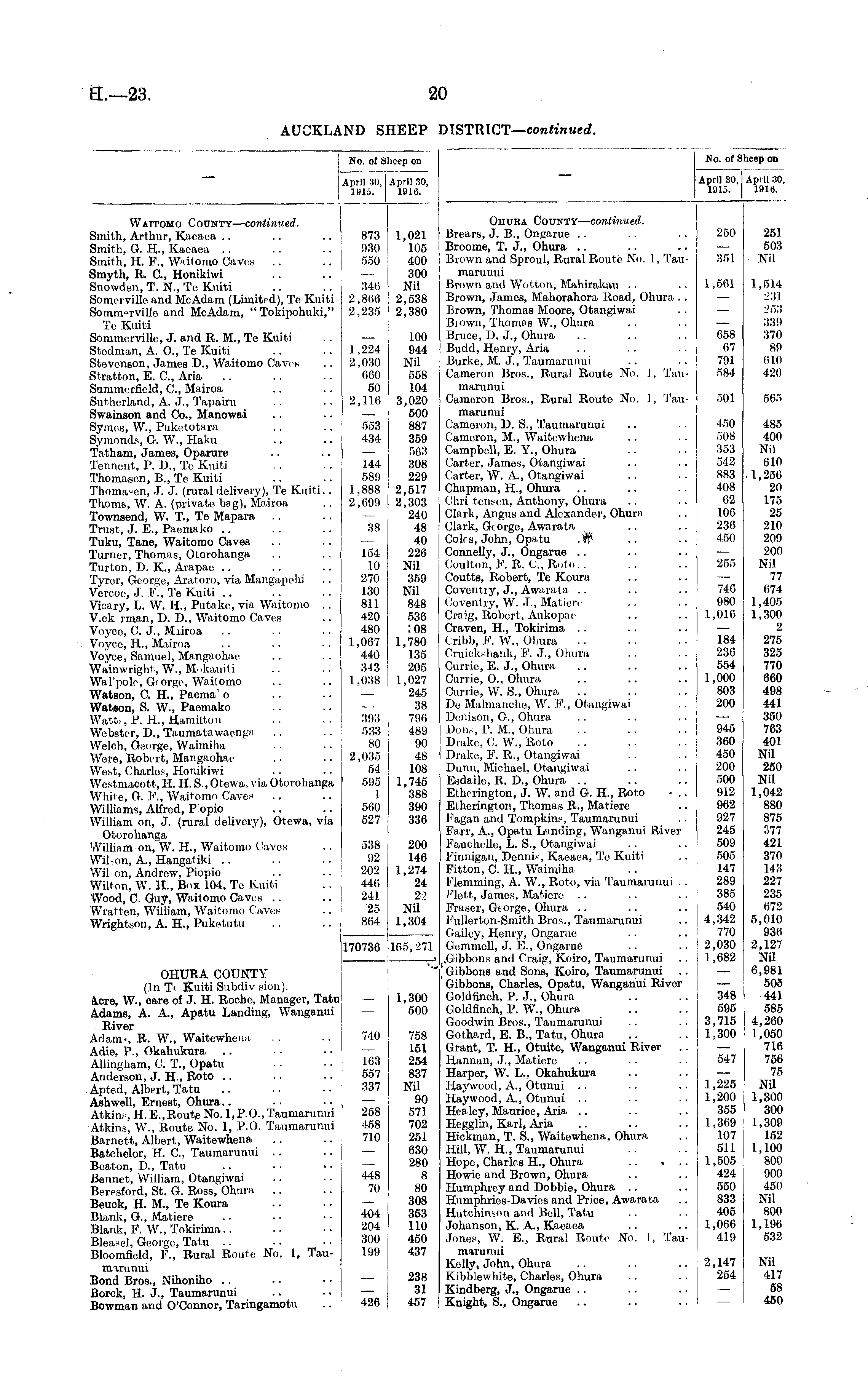 No. of Sheep on April 30, j April 30, 1915. 1916. No. of Sheep on April 30,1 April 30, 1915. | 1916. Waitomo County— continued. Smith, Arthur, Kaeaea Smith, G. IL, Kaeaea . . Smi(h, IL E\, Waitomo Caves Smyth, R. ft, Honikiwi Snowden.T. N.,Tc Kuiti Som'-rville and McAdam (Limited), Te Kuiti Somnv-rviUe and McAdam, " Tokipohuki," To Kuiti Sommerville, J. and R. M., Te Kuiti Stcdman, A. O., Te Kuiti Stevenson, James D., Waitomo Caves Stratton, E. ft, Aria Summerfield, ft, Mairoa Sutherland, A. J., Tapairu Swainson and Co., Manowai Symes, W., Puketotara Symonds, G. W., Haku Tatham, James, Oparure Tennent, P. D., To Kuiti Thomasen, B., Te Kuiti Thomasen, J. J. (rural delivery), Te Kuiti.. Thorns, W. A. (private bag), Mairoa Townsend, W. T, Te Mapara Trust, J. E., Paemako Tuku, Tane, Waitomo Caves Turner, Thomas, Otorohanga Turton, D. K, Arapae Tyrer, George, Aratoro, via Mangapehi Vereoe, J. F., Te Kuiti .. Visary, L. W. IL, Putake, via Waitomo .. V.ck rman, D. D., Waitomo Caves Voyce, C. J., Mairoa Voyco, H., Mairoa Voyce, Samuel, Mangaohae Wainwright, W., M-ikauiti Wal'pole, Gi orge, Waitomo Watson, C. H., Paema' o Watson, S. W., Paemako Watt,, P. H., Hamilton Webster, D., Taumatawaenga Welch, George, Waimiha Were, Robert, Mangaohae West, Charles, Honikiwi Westmacott, H. H. S., Otewa, via Otorohanga White, G. P., Waitomo Caves Williams, AUred, P'opio William on, J. (rural delivery), Otewa, via Otorohanga William on, W. H., Waitomo Caves Wil-on, A., HangaUki .. Wil on, Andrew, Piopio Wilton, W. H., Box 104, Te Kuiti Wood, C. Guy, Waitomo Caves Wratt en, William, Waitomo Caves Wrightson, A. H., Puke tutu 873 930 550 340 2,800 2,235 1,224 2,030 660 50 2,116 553 434 144 589 1,888 2,099 38 154 10 270 130 811 420 480 1,007 440 3-13 1,038 393 533 80 2,035 54 595 1 500 527 1,021 105 400 300 Nil 2,538 2,380 100 944 Nil 558 104 3,020 500 887 359 503 308 229 2,517 2,303 240 48 40 226 NU 359 Nil 848 536 :08 1,780 135 205 1,027 245 38 796 489 90 48 108 1,745 388 390 336 Ohura County— continued. Brears, J. B., Ongarue Broome, T. J., Ohura Brown and Sproul, Rural Route No. I, Taumarunui Brown and Wotton, Mahirakau Brown, James, Mahorahora Road, Ohura .. Brown, Thomas Moore, Otangiwai Biown, Thomas W., Ohura Bruce, D. J., Ohura Build, Henry, Aria Burke, M. J., Taumarunui Cameron Bros., Rural Route No. I, Taumamnui Cameron Bros., Rural Route No. 1, 'Taumarunui Cameron, D. S., Taumarunui Cameron, M., Waitewhena Campbell, E. Y., Ohura Carter, James, Otangiwai Carter, W. A., Otangiwai Chapman, H., Ohura Chri tensen, Anthony, Ohura Clark, Angus and Alexander, Ohura Clark, George, Awarata Coles, John, Opatu .W ConneUy, J., Ongarue Coulton, F. R. ft, Roto.. Courts, Robert, Te Koura Coventry, J., Awarata Coventry, W. J., Matiere Craig, Robert, Aukopae Craven, H., Tokirima ( ribb, F. W., Ohura Cruickshank, F. J., Ohura Currie, E. J., Ohura Currie, 0., Ohura Currie, W. S., Ohura De Malmanche, W. F., Otangiwai Denison, G., Ohura Dons, P. M., Ohura Drake, ft W., Roto Drake, F. R., Otangiwai Dunn, Michael, Otangiwai Esdaile, R. D., Ohura Etherington, J. W. and G. H., Roto • .. Etherington, Thomas R., Matiere Fagan and Tompkins, Taumarunui Farr, A., Opatu Landing, Wanganui River FauchcUe, L. S., Otangiwai Finnigan, Dennis Kaeaea, Te Kuiti Fitton. C. H., Waimiha Flemming, A. W., Roto, via Taumaranui .. Flett, Jamos, Matiere Fraser, George, Ohura E'ullerton-Smith Bros., Taumaranui Gailey, Henry, Ongarue Gemmell, J. E., Ongarue .Gibbons and Craig, Koiro, Taumarunui , Gibbons and Sons, Koiro, Taumarunui Gibbons, Charles, Opatu, Wanganui River Goldfinch, P. J., Ohura Goldfinch, P. W., Ohura Goodwin Bros., Taumarunui Gothard, E. B., Tatu, Ohura. Grant, T. H., Otuite, Wanganui River Hannan, J., Matiere Harper, W. L., Okahukura Haywood, A., Otunui Haywood, A., Otunui .. Healey, Maurice, Aria Hegglin, Karl, Aria Hickman, T. S., Waitewhena, Ohura Hill, W. H., Taumarunui Hope, Charles H., Ohura Howie and Brown, Ohura Humphrey and Dobbie, Ohura Humphries-Davies and Price, Awarata Hutchinson and Bell, Tatu Johanson, K. A., Kaeaea Jones, W. E., Rural Route No. I, Taumaranui Kelly, John, Ohura Kibblewhite, Charles, Ohura Kindberg, J., Ongarue Knight, S., Ongarue 250 351 1,561 658 67 791 584 501 450 508 353 542 883 408 02 100 236 450 255 740 980 1,010 184 236 554 1,000 803 200 945 300 450 200 500 912 962 927 245 509 505 147 289 385 540 4,342 770 2,030 1,082 251 503 Nil 1,514 231 253 339 370 89 610 420 565 485 400 Nil 610 .1,256 20 175 25 210 209 200 Nil 77 674 1,405 1,300 2 275 325 770 660 498 441 350 763 401 Nil 250 Nil 1,042 880 875 377 421 370 143 227 235 672 5,010 936 2,127 Nil 0,981 505 441 585 4,260 1,050 716 756 75 Nil 1,300 300 1,309 152 1,100 800 900 450 Nil 800 1,196 532 538 92 202 440 241 25 804 200 146 1,274 24 22 Nil 1,304 170736 165,271 OHURA COUNTY (In Ti Kuiti Subdiv sion). acre, W., oare of J. H. Roche, Manager, Tatu Adams, A. A., Apatu Landing, Wanganui River Adam<, R. W., Waitewhena Adie, P., Okahukura AUiughain, C. T., Opatu Anderson, J. H-, Roto Apted, Albert, Tatu Ash well, Ernest, Ohura.. Atkins, H.E.,RouteNo. 1,P.O.,Taumarunui Atkins, W., Route No. 1, P.O. Taumarunui Barnett, Albert, Waitewhena Batchelor, H. ft, Taumarunui Beaton, D., Tatu Bennet, William, Otangiwai Beresford, St. G. Ross, Ohura Beuek, H. M., Te Koura Blank, G., Matiere Blank, F. W., Tokirima.. Bleasel, George, Tatu Bloomfield, P., Rural Route No. 1, Taumaranui Bond Bros., Nihoniho Borck, H. J., Taumarunui Bowman and O'Connor, Taringamotu 740 163 557 337 258 458 710 1,300 500 758 151 254 837 Nil 90 571 702 251 630 280 8 80 308 353 110 450 437 348 595 3,715 1,300 547 1,225 1,200 355 1,309 107 511 1,505 424 550 833 405 1,000 419 448 70 404 204 300 199 238 31 457 2,147 254 Nil 417 58 450 426