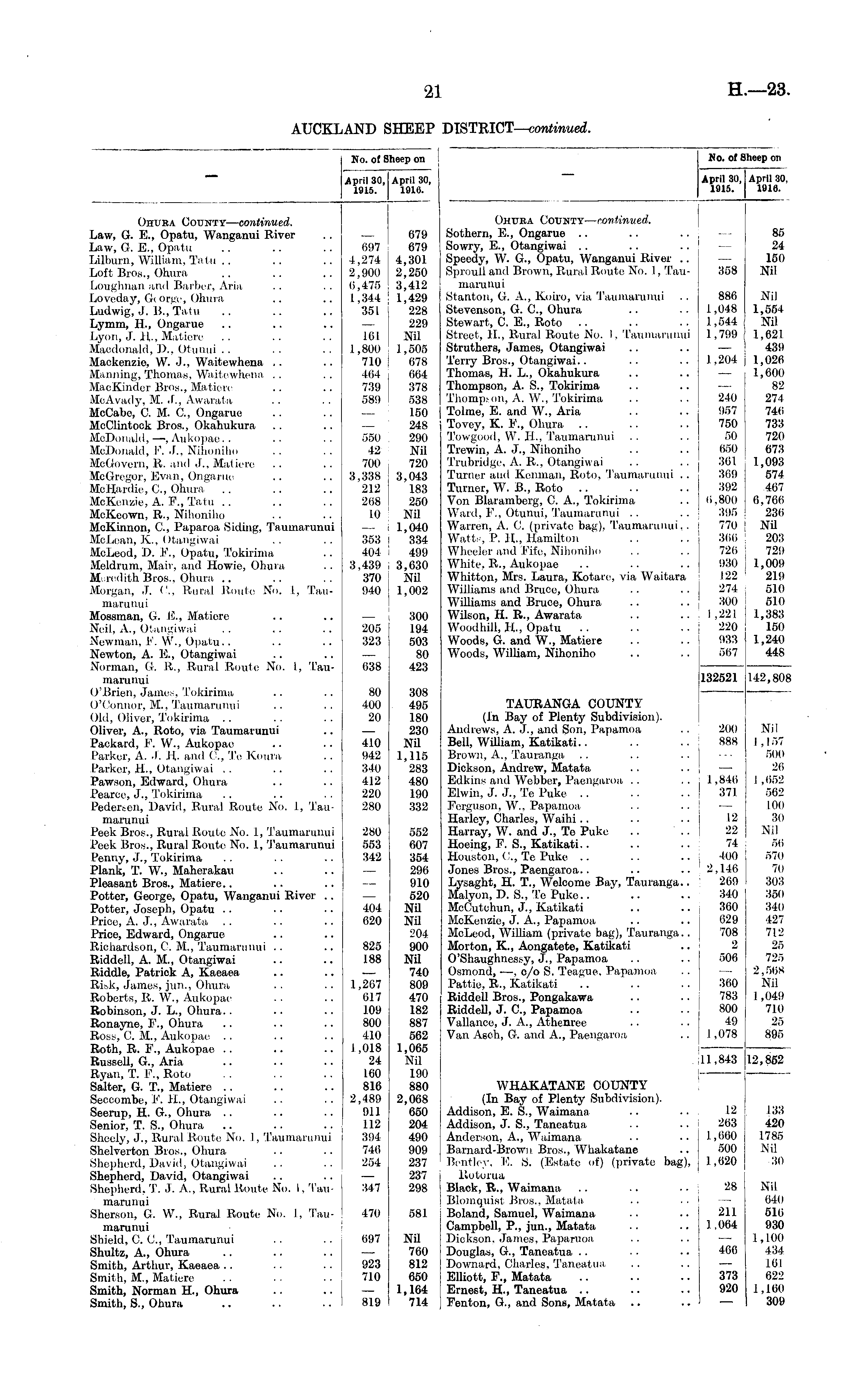 April 30, April 30, 1915. 1916. No. of Sheep on No. of Sheep on April 30, April 3( 1915. 1916. April 30, 1916. Ohura County— continued. Law, G. E., Opatu, Wanganui River Law, G. E., Opatu Lilburn, William, Tatu Loft Bros., Ohura liOughnan and Barber, Aria Loveday, Giorge, Ohura Ludwig, J. B., Tatu Lymm, H., Ongarue Lyon, J. H-, Matiere .. Macdonald, D., Otunui Mackenzie, W. J., Waitewhena .. Manning, Thomas, Waitewhena MacKindcr Bros., Matiere McAvady, M. J., Awarata McCabe, C. M. G, Ongarue McClintock Bros., Okahukura McDonald, —, Aukopae.. McDonald, F. J., Nihoniho MeGovern, R. and J., Matiere McGregor, Evan, Ongarue McIIardie, ft, Ohura .. McKenzie, A. F., Tatu McKeown, R., Nihoniho McKinnon, G, Paparoa Siding, Taumarunui McLean, K., Otangiwai McLeod, D. P., Opatu, Tokirima Meldrum, Mair, and Howie, Ohura Meredith Bros,, Ohura .. Morgan, J. ('., Rural Route No. 1, Taumarunui Mossman, G. E., Matiere Neil, A., Otangiwai Newman, E'. W., Opatu.. Newton, A. E., Otangiwai Norman, G. R., Rural Route No. I, Taumaranui O'Brien, James, 'Tokirima O'Connor, M., Taumarunui Old, Oliver, Tokirima Oliver, A., Roto, via Taumarunui Packard, if. W., Aukopae Parker, A. J. H. and ft, 'Te Koura Parker, H., Otangiwai Pawson, Edward, Ohura Pearce, J., Tokirima Pedersen, David, Rural Route No. 1, Taumarunui Peek Bros., Rural Route No. 1, Taumarunui Peek Bros., Rural Route No. 1, 'Taumarunui Penny, J., Tokirima Plank, T. W., Maherakau Pleasant Bros., Matiere.. Potter, George, Opatu, Wanganui River .. Potter, Joseph, Opatu Price, A. J., Awarata Price, Edward, Ongarue Richardson, ft M., 'Taumarunui .. Riddell, A. M., Otangiwai Riddle, Patrick A, Kaeaea Risk, James, jun., Ohura Roberts, R. W., Aukopae Robinson, J. L., Ohura. . Ronayne, I'., Ohura Ross, 0. M., Aukopae Roth, R. F., Aukopae RusseU, G., Aria Ryan, T. P., Roto Salter, G. T, Matiere Seccombe, F. IL, Otangiwai Seerup, H. G., Ohura Senior, T. S., Ohura Shcely, J., Rural Route No. 1, Taumarunui Shelverton Bros., Ohura Shepherd, David, Otangiwai Shepherd, David, Otangiwai Shepherd, T. J. A., Rural Route No. I, Taumarunui Sherson, G. W., Rural Route No. I, Taumaranui Shield, C. ft, Taumarunui Shultz, A., Ohura Smith, Arthur, Kaeaea Smith, M., Matiere Smith, Norman H., Ohura Smith, S., Ohura 697 4,274 2,900 0,475 1,344 i 351 161 1,800 710 464 739 589 550 42-1 700 3,338 212 208 10 353 404 : 3,439 ; 370 940 679 679 4,301 2,250 3,412 1,429 228 229 Nil 1,505 678 664 378 538 150 248 290 NU 720 3,043 183 250 NU 1,040 334 499 3,030 NU 1,002 Ohuea County— continued. Sothern, E., Ongarue Sowry, E., Otangiwai Speedy, W. G., Opatu, Wanganui River .. Sproull and Brown, Rural Route No. 1, Taumaranui Stanton, G. A., Koiro, via Tauniaruuui Stevenson, G. G, Ohura Stewart, C. E., Roto Street, II., Rural Route No. I. Taumarunui Struthers, James, Otangiwai Terry Bros., Otangiwai.. Thomas, H. L., Okahukura Thompson, A. S., Tokirima Thompson, A. W., Tokirima Tolme, E. and W., Aria Tovey, K. P., Ohura Towgood, W. H., Taumarunui Trewin, A. J., Nihoniho Trubridge, A. R., Otangiwai Turner and Konman, Roto, 'Taumarunui . . Turner, W. B., Roto Von Blaramberg, C. A., Tokirima Ward, P., Otunui, Taumarunui Warren, A. C. (private bag). Taumarunui.. Watts P. 11., Hamilton Wheeler and Fife, Nihoniho White, R., Aukopae Whitton, Mrs. Laura, Kotare, via Waitara Williams and Bruce, Ohura Williams and Bruce, Ohura Wilson, H. R., Awarata Woodhill, H., Opatu Woods, G. and W., Matiere Woods, WilUam, Nihoniho 358 886 1,048 1,544 1,799 1,204 240 957 750 50 650 301 309 392 0,800 395 770 300 720 930 122 274 300 1,221 220 933 507 85 24 150 Nil Nil 1,554 NU 1,621 43!) 1,020 1,000 82 274 740 733 720 673 1,093 574 467 0,760 230 NU 203 72!) 1,009 219 510 610 1,383 150 1,240 448 205 323 638 300 194 503 80 423 132521 142,808 80 400 20 410 942 340 412 220 280 280 553 342 404 620 825 188 1,207 617 109 800 410 1,018 24 160 816 2,489 911 112 394 746 254 347 308 495 180 230 Nil 1,115 283 480 190 332 552 607 354 296 910 520 NU NU 204 900 NU 740 809 470 182 887 562 1,065 NU 190 880 2,068 650 204 490 909 237 237 298 TAURANGA COUNTY (In Bay of Plenty Subdivision). Andrews, A. J., and Son, Papamoa Bell, WiUiam, Katikati.. Brown, A., Tauranga Dickson, Andrew, Matata Edkins and Webber, Paengaroa Elwin, J. J., Te Puke Ferguson, W., Papamoa Harley, Charles, Waihi Harray, W. and J., Te Puke Hoeing, F. S., Katikati.. Houston, C.,Te Puke .. Jones Bros., Paengaroa.. Lysaght, H. T., Welcome Bay, Tauranga.. Malyon, D. S., Te Puke.. McCutehun, J., Katikati McKenzie, J. A., Papamoa McLeod, William (private bag), Tauranga.. Morton, K., Aongatete, Katikati O'Shaughnessy, J., Papamoa Osmond, —, o/o S. Teague, Papamoa Pattie, R., Katikati RiddeU Bros., Pongakawa RiddeU, J. ft, Papamoa VaUanco, J. A., Athenree Van Asch, G. and A., Paengaroa 200 888 1,840 371 12 22 74 400 2,146 269 340 360 029 708 2 506 Nil 1,157 500 20 I ,052 562 100 30 Nil 50 570 70 303 350 340 427 712 25 725 2,508 NU 1 ,040 710 25 895 360 783 800 49 I ,078 WHAKATANE COUNTY (In Bay of Plenty Subdivision). Addison, E. S., Waimana Addison, J. S., Taneatua Anderson, A., Waimana Barnard-Brown Bros., Whakatane Bentley, E. S. (Estate of) (private bag), Rotorua Black, R., Waimana Bloniqiiist Bros.. Matata Boland, Samuel, Waimana Campbell, P., jun., Matata Dickson, James, Paparuoa Douglas, G., Taneatua Downard, Charles, 'Taneatua Elliott, P., Matata Ernest, H., Taneatua Fenton, G., and Sons, Matata 11,843 12,852 12 203 1,000 500 1,020 133 420 1785 Nil 30 470 097 923 710 819 581 NU 760 812 650 1,164 714 28 211 1,064 466 Nil 640 510 930 1,100 434 161 622 1,160 300 373 920