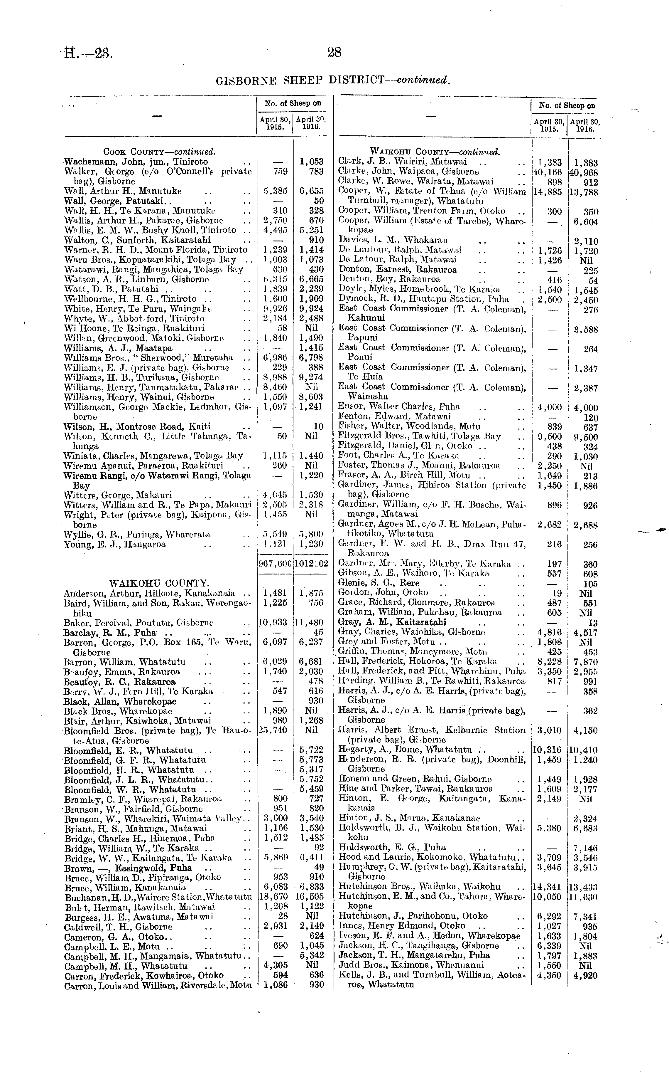 No. of Sheep on April 30,1 April 30, 1915. 1916. So. of Sheep on April 30, April 30, 1915. 1910. Cook County— continued. Waohsmann, John, jun., Tiniroto Walker, Gi orge (c/o O'ConneU's private bag), Gisborne Wa 11, Arthur H., Manutuke WaU, George, Patutaki.. Wall, H. H., Te Karana, Manutuke Wallis, Arthur H., Pakarae, Gisborne Wallis, E. M. W., Bushy Knoll, Tiniroto .. Walton, ft, Sunforth, Kaitaratahi Warner, R. IT. D., Mount Florida, Tiniroto Waru Bros., Kopuatarakihi, Tolaga Bay .. Watarawi, Rangi, Mangahiea, Tolaga Bay Watson, A. R., Lin burn, Gisborne Watt, D. B., Patutahi WeUbourne, H. H. G., Tiniroto White, Henry, Te Puru, Waingake Whyte, W., Abbot, ford, Tiniroto Wi Hoone, Te Reinga, Ruakituri Willan, Greenwood, Matoki, Gisborne Williams, A. J., Maatapa Williams Bros., " Sherwood," Muretaha .. E. J. (private bag), Gisborne Williams, H. B., Turihaua, Gisborne Williams, Henry, Taumatukatu, Pakarae .. Williams, Henry, Wainui, Gisborne Williamson, George Mackie, Ledmhor, Gisborne Wilson, H., Montrose Road, Kaiti WiEon, Kenneth G, Little Tahunga, Tahunga Winiata, Charles, Mangarewa, Tolaga Bay Wiremu Apanui, Paraeroa, Ruakituri Wiremu Rangi, c/o Watarawi Rangi, Tolaga Bay Witters, George, Makauri Witters, WiUiam and R., Te Papa, Makauri Wright, Peter (private bag), Kaipona, Gisborne Wyllie, G. R., Puringa, Wharerata Young, E. J., Hangaroa 907,006 759 5,385 3.10 2,750 4,495 1 ,239 1 ,003 030 0,315 I ,839 1,000 9,920 2,184 58 1,840 6', 986 229 8,988 8,400 1,550 1,007 50 1,115 260 4,045 2,505 1,455 5,549 1,121 1,053 783 6,655 50 328 670 5,251 910 1,414 1,073 430 0,005 2,239 1,909 9,924 2,488 Nil 1,490 1,415 6,798 388 9,274 Nil 8,603 1,241 10 Nil 1,440 Nil 1,220 1,530 2,318 Nil 5,800 1,230 1012,02 Waikohu County— continued. Clark, J. B., Wairiri, Matawai Clarke, John, Waipaoa, Gisborne Clarke, W. Rowc, Wairata, Matawai Cooper, W., Estate of Tehua (e/o William Turnbull, manager), Whatatutu Cooper, William, Trenton Farm, Otoko Cooper, William (Esta + e of Tarehe), Wharekopae Davies, L. M., Whakarau De Lautour, Ralph, Matawai De Latour, Ralph, Matawai Denton, Earnest, Rakauroa Denton, Roy, Rakauroa Doyle, Myle's, Homebrook, Te Karaka Dymook, R. D., Hautapu Station, Puha .. East Coast Commissioner (T. A. Coleman), Kahunui East Coast Commissioner (T. A. Coleman), Papuni East Coast Commissioner (T. A. Coleman), Ponui East Coast Commissioner (T. A. Coleman), Te Huia East Coast Commissioner (T. A. Coleman), Waimaha Ensor, Walter Charles, Puha Fenton, Edward, Matawai Fisher, Walter, Woodlands, Motu Fitzgerald Bros., Tawhiti, Tolaga Bay Fitzgerald, Daniel, Gl< n, Otoko Foot, Charles A., Te Karaka Foster, Thomas J., Moanui, Rakauroa Fraser, A. A., Birch Hill, Motu Gardiner, James, Hihiroa Station (private bag), Gisborne Gardiner, William, c/o F. H. Busche, Waimanga, Matawai Gardner, Agnes M„ e/o J. H. McLean, Puhatikotiko, Whatatutu Gardner, F. W. and H. B., Drax Run 47, Rakauroa Gardner, Mr;-. Mary, Ellerby, Te Karaka - - Gibson, A. E., Waihoro, To Karaka Glenie, S. G., Rere .. Gordon, John, Otoko Grace, Richard, Clonmorc, Rakauroa. Graham, William, Pukehau, Rakauroa Gray, A. M., Kaitaratahi Gray, Charles, Waiohika, Gisborne Grey and Fostor, Motu Griffin, Thomas, Moneymore, Motu Hall, Frederick, Hokoroa, Te Karaka Hall, Frederick, and Pitt, Wharchinu, Puha H'rding, William B., Te Rawhiti, Rakauroa Harris, A. J., o/o A. E. Harris, (private bag), Gisborne Harris, A. J., c/o A. E. Harris (private bag), Gisborne Harris, Albert Ernest, Kolburnie Station (private bag), Gi-borne Hegarty, A., Dome, Whatatutu Henderson, R. R. (private bag), Doonhill, Gisborne Honson and Green, Rahul, Gisborne Hine and Parker, Tawai, Raukauroa Hinton, E. George, Kaitangata, Kanakanaia Hinton, J. S., Marua, Kanakanae Holdsworth, B. J., Waikohu Station, Waikohu Holdsworth, El G., Puha Hood and Laurie, Kokomoko, Whatatutu.. Humphrey, G. W. (private bag), Kaitaratahi, Gisborne Hutchinson Bros., Waihuka, Waikohu Hutchinson, E. M., and Co., Tahora, Wharekopae Hutchinson, J., Parihohonu, Otoko Innes, Henry Edniond, Otoko Iveson, E. F. and A., Hedon, Wharekopae Jackson, H. ft, Tangihanga, Gisborne Jackson, T. IL, Mangatarehu, Puha Judd Bros., Kaimona, Whenuanui Kells, J. B., and Turnbull, William, Aotearoa, Whatatutu 1,383 40,100 898 1.4,885 3,00 1,720 1,426 410 1,540 2,500 4,000 839 9,500 438 290 2,250 1,049 1,450 890 2,682 21.0 197 557 1,383 40,968 912 13,788 350 6,004 2,110 1,720 NU 225 54 1,545 2,450 276 3,588 204 | 1,347 2,387 4,000 120 637 9,500 324 1,030 Nil 213 1,886 926 2,088 256 360 608 105 NU 551 NU 13 4,517 NU 453 7,870 2,955 991 358 WAIKOHU COUNTY. Anderson, Arthur, Hillcote, Kanakanaia . . Baird, William, and Son, Rakau, Werengaohiku Baker, Percival, Poututu, Gisborne Barclay, R. M., Puha .. .,, Barion, George, P.O. Box 165, Te Waru, Gisborne Barron, William, Whatatutu B-aufoy, Emma, Rakauroa Beaufoy, R. ft, Rakauroa Berrv, W. J., Fern Hill, 'Te Karaka Black, AUan, Wharekopae Black Bros., Wharekopae Blair, Arthur, Kaiwhoka, Matawai Bloomfield Bros, (private bag), Te Hau-o-te-Atua, Gisborne Bloomfield, E. R., Whatatutu . . ... Bloomfield, G. F. R., Whatatutu Bloomfield, H. R., Whatatutu Bloomfield, J. L. R., Whatatutu. . Bloomfield, W. R., Whatatutu . . Bramky, C. F., Wharepai, Rakauroa Branson, W., E'airfield, Gisborne Branson, W., Wharekiri, Waimata Valley. . Briant, H. S., Mahunga, Matawai Bridge, Charles H., Hinemoa, Puha Bridge, William W., Te Karaka, Bridge, W. W., Kaitangata, Te Karaka Brown, —, Easingwold, Puha Bruce, William D., Pipiranga, Otoko Bruce, William, Kanakanaia Buchanan,H.D.,Wairere Station, Whatatutu Bult, Herman, Rawitsch, Matawai Burgess, H. E., Awatuna, Matawai Caldwell, T. H., Gisborne Cameron, G. A., Otoko.. Campbell, L. E., Motu .. Campbell, M. H-, Mangamaia, Whatatutu.. CampbeU, M. H., Whatatutu Carron, Frederick, Kowhairoa, Otoko Carron, Louis and WiUiam, Riversdale, Motu 1,481 1,225 10,933 0,097 0,029 1,740 547 1,890 980 25,740 i,8?5 750 11,480 45 0,237 6,681 2,030 478 616 930 Nil 1
