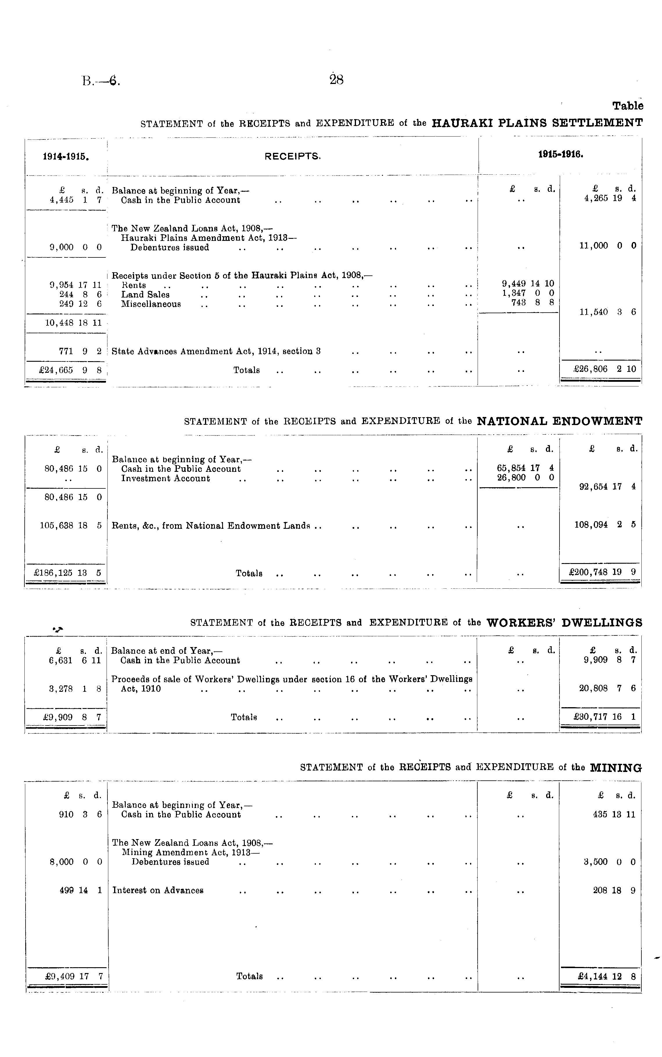 1914-1915. RECEIPTS. 1915-1915-1916. ■1916. i i __ £ s. d. Balance at beginning of Year, — 4,445 1 7 Cash in the Publio Account .. .. .. .. £ s. d. £ s. d. £ s. d. 4,265 19 4 £ s. d. 4,265 19 4 The New Zealand Loans Act, 1908, — Hauraki Plains Amendment Act, 1913— 9,000 0 0 Debentures issued 11,000 0 0 11,000 0 0 Receipts under Section 5 of the Hauraki Plains Aot, 1908, — 9,954 17 11 Rents 244 8 6 I Land Sales 249 12 6 Miscellaneous 9,449 14 10 1,347 0 0 743 8 8 9,449 14 10 1,347 0 0 743 8 8 11.540 3 6 11,540 3 6 10,448 18 11 | 11,04U O O 771 9 2 | State Advances Amendment Act, 1914, section 3 £24,665 9 8 \ Totals 1 £26,806 2 10 £26,806 2 10 STATEMENT of the RECEIPTS and EXPENDITURE of tho NATIONAL E fATIONAL ENDOWMEN' INDOWMENT £ s. d. Balanoo at beginning of Year, — 80,486 15 0 Cash in the Public Aocount Investment Account 80,486 15 0 £ s. d. £ s. d. £ s. d. £ s. d 65,854 17 4 26,800 0 0 92,654 17 4 £ s. d. 80,486 15 0 65,854 17 4 26,800 0 0 92,654 17 4 105,638 18 5 Rents, &c, from National Endowment Lands .. 80,486 15 0 108,094 2 5 105,638 18 5 108,094 2 5 £186,125 13 5 Totals .. £200,748 19 9 £200,748 19 9 £186,125 13 5 STATEMENT of the RECEIPTS and EXPENDITURE of thi le WORKERS' DWELLING £ s. d. Balance at end of Year, — 6,631 6 11 Cash in the Public Account £ s. d. 6,631 6 11 £ s. d. £ s. d 9,909 8 7 £ s. d. £ s. d. 9,909 8 7 3,278 1 8 Proceeds of sale of Workers' Dwellings under seotion 16 of the Workers' Dwellings 3,278 1 8 Aot, 1910 20,808 7 6 20,808 7 6 £9,909 8 7 Totals £9,909 8 7 £30,717 16 1 £30,717 16 1 STATEMENT of the RECEIPTS and ! STATEMENT of the RECEIPTS and E2 EXPENDITURE XPENDITURE of the MININ( of the MINING £ s. d. Balance at beginning of Year, — 910 3 6 Cash in the Public Account £ s. d. £ b. d. £ s. d. 435 13 11 £ s. d. £ s. d. 910 3 6 435 13 11 8,000 0 0 The New Zealand Loans Act, 1908,— Mining Amendment Act, 1913— 8,000 0 0 Debentures issued 3,500 0 0 3,500 0 0 499 14 1 Interest on Advances 499 14 1 208 18 9 208 18 9 £9,409 17 7 Totals .. — £4,144 12 8 £9,409 17 7 £4,144 12 8 i — i
