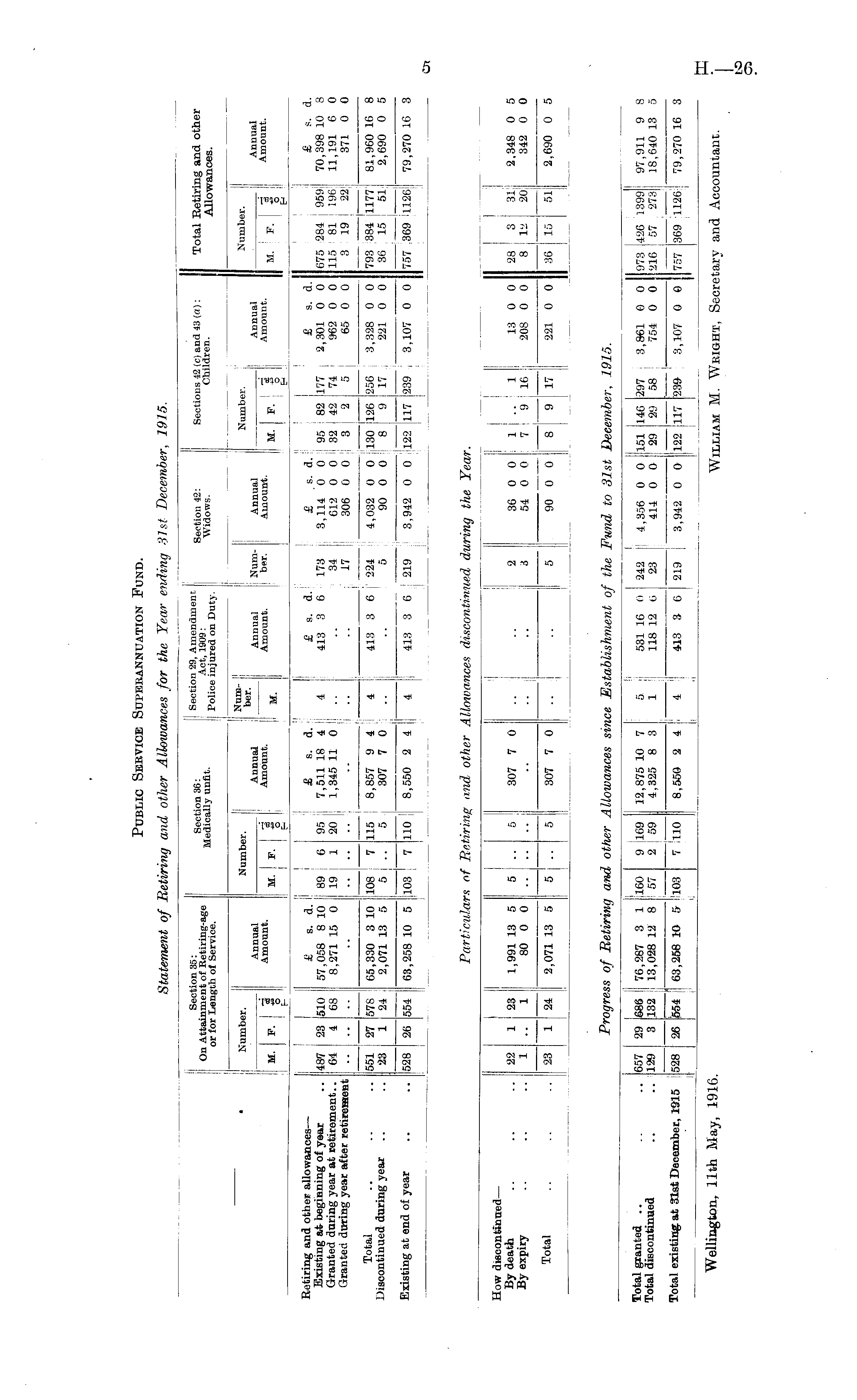 Section 35: On Attainment of Retiring-age or for Length of Service. Section 36: Medically unfit. Section 29, Amendment Act, 1909: Police injured on Duty. Section 42: Widows. Sections 42 (c) and 43 (o): Children. Total Retiring and other Allowances. • ir. i o rNumber. M. F. 3 j I g Annual Amount. ; Number. Annual Amount. Number. Annual Amount. Number. M. F. J IH Annual Amount. Nurab. Numbi ir. I Eh I Annual Amount. : M. P. Amount. M. F. Retiring and other allowances — Existing at beginning of year Granted during year at retirement.. Granted during year after retirement 487 64 23 4 U„ 510 68 57S 24 £ s. d. 57,058 8 10 : 8,271 15 0 II I 89 6 19 I 1 108 7 5 .. 95 20 ll £ s. d. 7,511 18 4 1,345 11 0 I 4 £ s. d. 413 3 6 £ s. d. 173 ; 3,114 0 0 95 82 34 612 0 0 32 42 17 306 0 0 3 2 £ s. A. 177 2,301 0 0 74 962 0 0 5 65 0 0 I I £ 8. d. 675 284 959j 70,398 10 8 115 81 196 ! 11,191 6 0 3 19 22] 371 0 0 ■• ■ • Total Discontinued during year ! 1 551 23 I— 27 1 65,330 3 10 2,071 13 5 115 5 i . 8,857 9 4 I i 307 7 0 I] .. 8,857 9 4 307 7 0 4 " 413 3 6 i 224 4,032 0 0 130 126 5 90 0 0 8 9 413 3 6 | 224 5 256 3,328 0 0 17 221 0 0 793 384 1177 81,960 16 8 36 15 51; 2,690 0 5 Existing at end of year 528 26 554 63,258 10 5 |103 7 110 8,550 2 4 4 8,550 2 4 4 413 3 6 219 3,942 0 0 122 117 239 3,107 0 0 757 369 1126 79,270 16 3 i Particula: r .i of Be, ? and, other Allowon ices discontinued during the Year. tirin' How discontinued — By death By expiry 22 1 1 ! II 23 1 1,991 13 5 80 0 0 5 .. 5 307 7 0 i 2 6 36 0 0 54 0 0 . 1 .. 1 7 9 16 I 13 0 0 208 0 0 28 3 12 _. . _ 31 2,348 0 5 20 342 0 0 51 2,690 0 5 " .. Total — 23 1 24 2,071 13 5 5 307 7 0 8 221 0 0 36 15 5 90 0 0 5 8 9 17 I 1 I li ll__. L 1_ i 1 i I I Progress of Betiring ai Uowances si; ,ce Establishment of the Fund io 31st December, 1 US. other Total granted .. .. .. 657 29 686 76,287 3 1 160 Total discontinued .. ..129 3 132 13,028 12 8 57 Total existing at 31st December, 1915 528 26 554 63,258 10 5 103 ; i[ j , 9 169 2 i 59 7 1110 12,875 10 7 4,325 8 3 5 531 16 fl 242 | 4,856 0 0 151 146 297 3,861 0 0 973 426 1399 97,911 9 8 1 118 12 G 23 414 0 0 29 29 58 754 0 0 216 57 273 18,640 13 5 4 413 3 6 219 3,942 0 0 122 117 239 3,107 0 0 I 757 369 1126 79,270 16 3 I I I 1 ; 8,550 2 4 369 1126] 79,270 16 3 " ■ I Wellington, 11th May, 1916. William M. Weight, Secretary and Accountant.