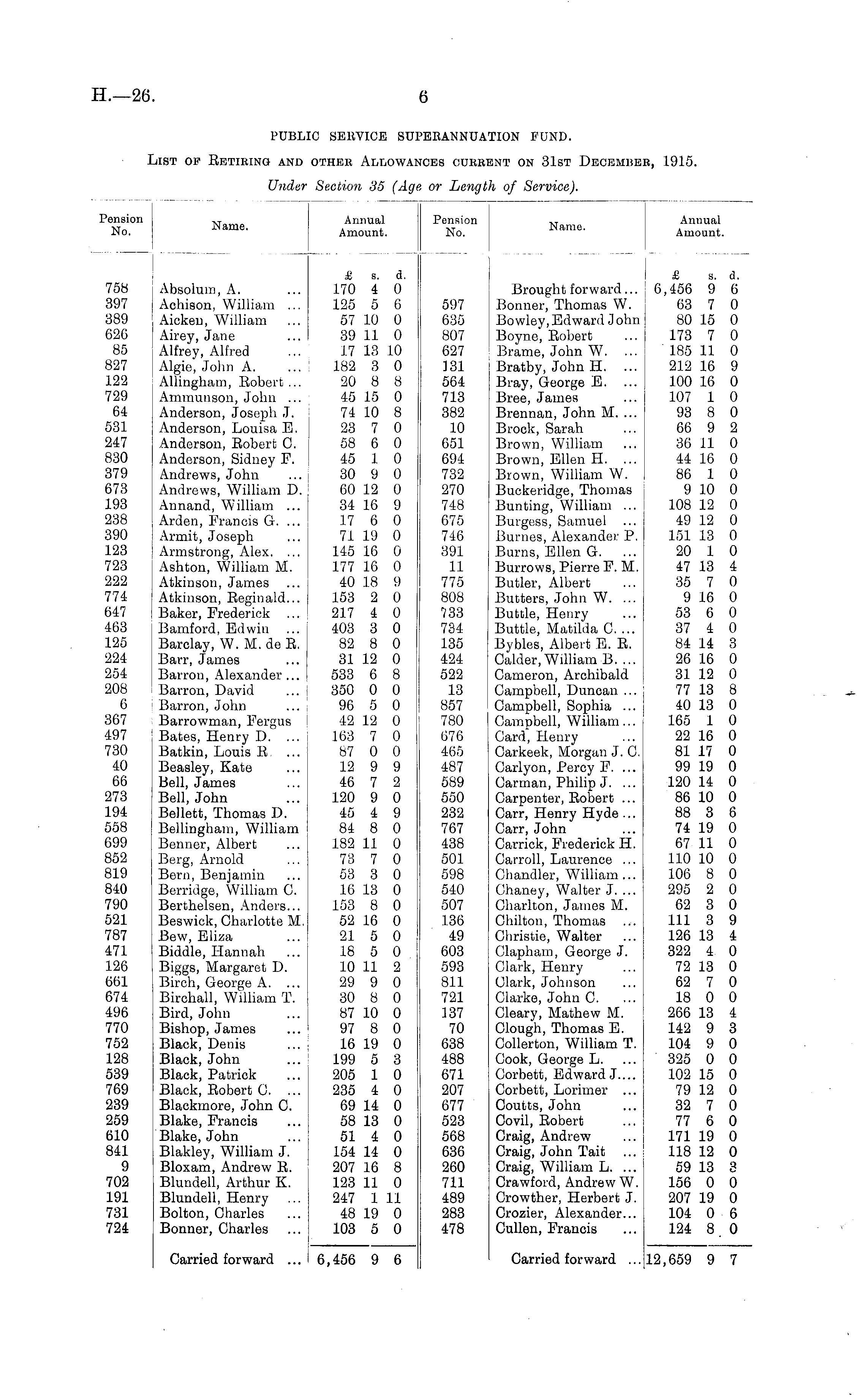 PUBLIC SERVICE SUPERANNUATION FUND. List of Retiring and other Allowances current on 31st December, 1915. Under Section 35 (Age or Length of Service).