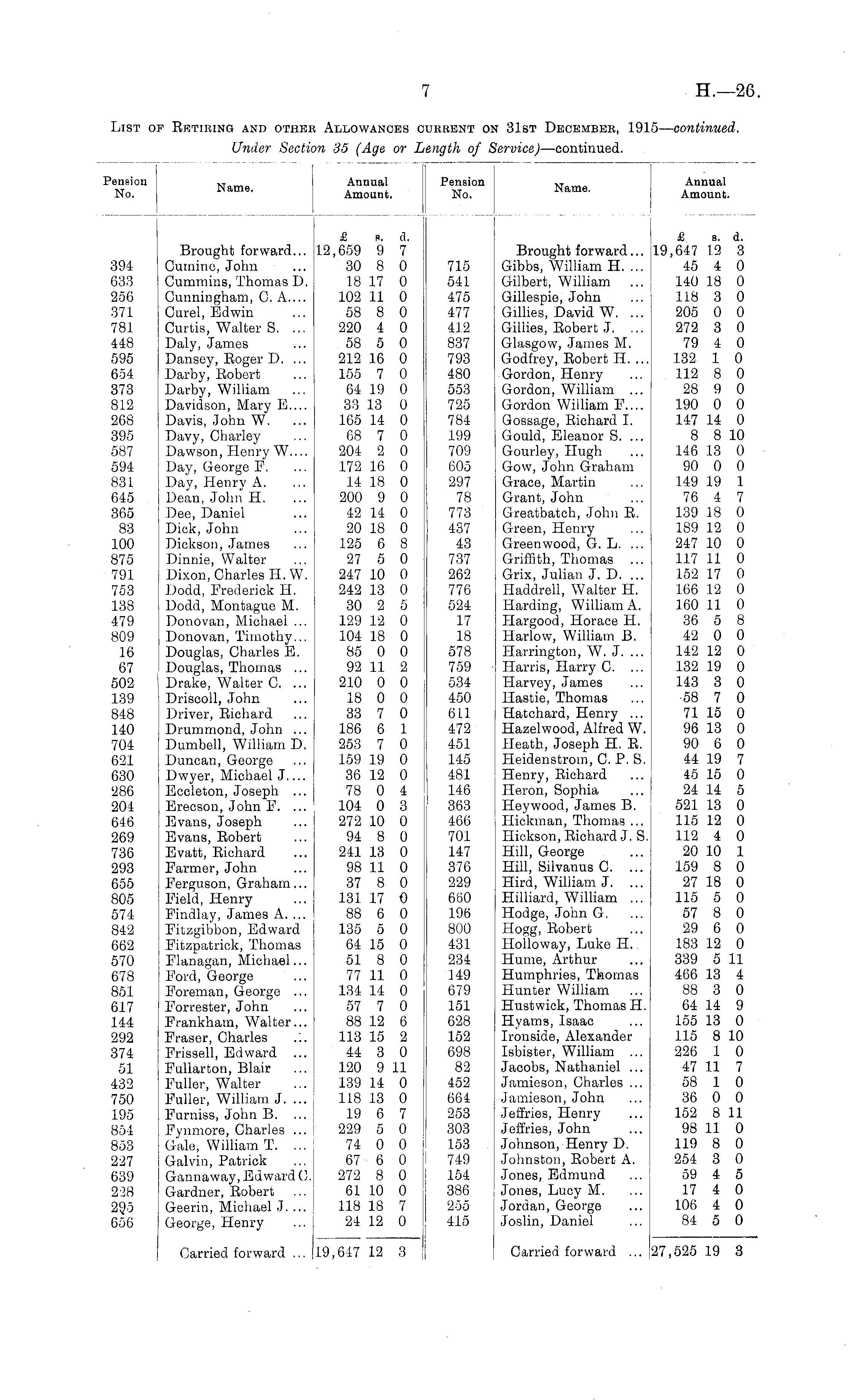 'ension No. Name. Annual Amount. Pension No. Name. Annual Amount. 394 633 256 371 781 448 595 654 373 812 268 395 587 594 831 645 365 83 100 875 791 753 138 479 809 16 67 502 139 848 140 704 621 630 286 204 646 269 736 293 655 805 574 842 662 570 678 851 617 144 292 374 51 432 750 195 854 853 227 639 2-28 29.5 656 Brought forward... Cumine, John Cummins, Thomas D. Cunningham, C. A.... Curel, Edwin Curtis, Walter S. ... Daly, James Dansey, Roger D. ... Darby, Robert Darby, William Davidson, Mary E.... Davis, John W. Davy, Charley Dawson, Henry W.... Day, George F. Day, Henry A. Dean, John H. Dee, Daniel Dick, John Dickson, James Dinnie, Walter Dixon, Charles II. W. Dodd, Frederick H. Dodd, Montague M. Donovan, Michael ... Donovan, Timothy... Douglas, Charles E. Douglas, Thomas ... Drake, Walter C. ... Driscoll, John Driver, Richard. Drummond, John ... Dumbell, William D. Duncan, George Dwyer, Michael J Eccleton, Joseph ... Erecson, John F. ... Evans, Joseph Evans, Robert Evatt, Richard Farmer, John Ferguson, Graham... Field, Henry Findlay, James A. ... Fitzgibbon, Edward Fitzpatrick, Thomas Flanagan, Michael... Ford, George Foreman, George ... Forrester, John Frankham, Walter... Fraser, Charles Frissell, Edward ... Fullarcon, Blair Fuller, Walter Fuller, William J. ... Furniss, John B. ... Fynmore, Charles ... Gale, William T. ... Galvin, Patrick Gannaway, Edward C. Gardner, Robert Geerin, Michael J. ... George, Henry £ fl. A. 12,659 9 7 30 8 0 18 17 0 102 11 0 58 8 0 220 4 0 58 5 0 212 16 0 155 7 0 64 19 0 33 13 0 165 14 0 68 7 0 204 2 0 172 16 0 14 18 0 200 9 0 42 14 0 20 18 0 125 6 8 27 5 0 247 10 0 242 13 0 30 2 5 129 12 0 104 18 0 85 0 0 92 11 2 210 0 0 18 0 0 33 7 0 186 6 1 253 7 0 159 19 0 36 12 0 78 0 4 104 0 3 272 10 0 94 8 0 241 13 0 98 11 0 37 8 0 131 17 0 88 6 0 135 5 0 64 15 0 51 8 0 77 11 0 134 14 0 57 7 0 88 12 6 113 15 2 44 3 0 120 9 11 139 14 0 118 13 0 19 6 7 229 5 0 74 0 0 67 6 0 272 8 0 61 10 0 118 18 7 24 12 0 715 541 475 477 412 837 793 480 553 725 784 199 709 605 297 78 773 437 43 737 262 776 524 17 18 578 759 534 450 611 472 451 145 481 146 363 466 701 147 376 229 660 106 800 431 234 149 679 151 628 152 698 82 452 664 253 303 153 749 154 386 255 415 Brought forward... Gibbs, William H. ... Gilbert, William ... Gillespie, John Gillies, David W. ... Gillies, Robert J. ... Glasgow, James M. Godfrey, Robert H. ... Gordon, Henry Gordon, William ... Gordon William F.... Gossage, Richard I. Gould, Eleanor S. ... Gourley, Hugh Gow, John Graham Grace, Martin Grant, John Greatbatch, John R. Green, Henry Greenwood, G. L. ... Griffith, Thomas Grix, Julian J. D. ... Haddrell, Walter II. Harding, William A. Hargood, Horace II. Harlow, William B. Harrington, W. J. ... Harris, Harry C. ... Harvey, James Hastie, Thomas Hatchard, Henry ... Hazelwood, Alfred W. Heath, Joseph H. R. Heidenstrom, C. P. S. Henry, Richard Heron, Sophia Heywood, James B. Hickman, Thomas ... Hickson, Richard J. S. Hill, George Hill, Silvanus C. Hird, William J. Hilliard, William ... Hodge, John G, Hogg, Robert Holloway, Luke H. Hume, Arthur Humphries, Thomas Hunter William Hustwick, Thomas H. Hyams, Isaac Ironside, Alexander Isbister, William ... Jacobs, Nathaniel ... Jamieson, Charles ... Jamieson, John Jeffries, Henry Jeffries, John Johnson, Henry D. Johnston, Robert A. Jones, Edmund Jones, Lucy M. ... I Jordan, George ... Joslin, Daniel £ s. d. 19,647 12 3 45 4 0 140 18 0 118 3 0 205 0 0 272 3 0 79 4 0 132 1 0 112 8 0 28 9 0 190 0 0 147 14 0 8 8 10 146 13 0 90 0 0 149 19 1 76 4 7 139 18 0 189 12 0 247 10 0 117 11 0 152 17 0 166 12 0 160 11 0 36 5 8 42 0 0 142 12 0 132 19 0 143 3 0 58 7 0 71 15 0 96 13 0 90 6 0 44 19 7 45 15 0 24 14 5 521 13 0 115 12 0 112 4 0 20 10 1 159 8 0 27 18 0 115 5 0 57 8 0 29 6 0 183 12 0 339 5 11 466 13 4 88 3 0 64 14 9 155 13 0 115 8 10 226 1 0 47 11 7 58 1 0 36 0 0 152 8 11 98 11 0 119 8 0 254 3 0 59 4 5 17 4 0 106 4 0 84 5 0 Carried forward ... 19,647 12 3 Carried forward ... 27,525 19 3