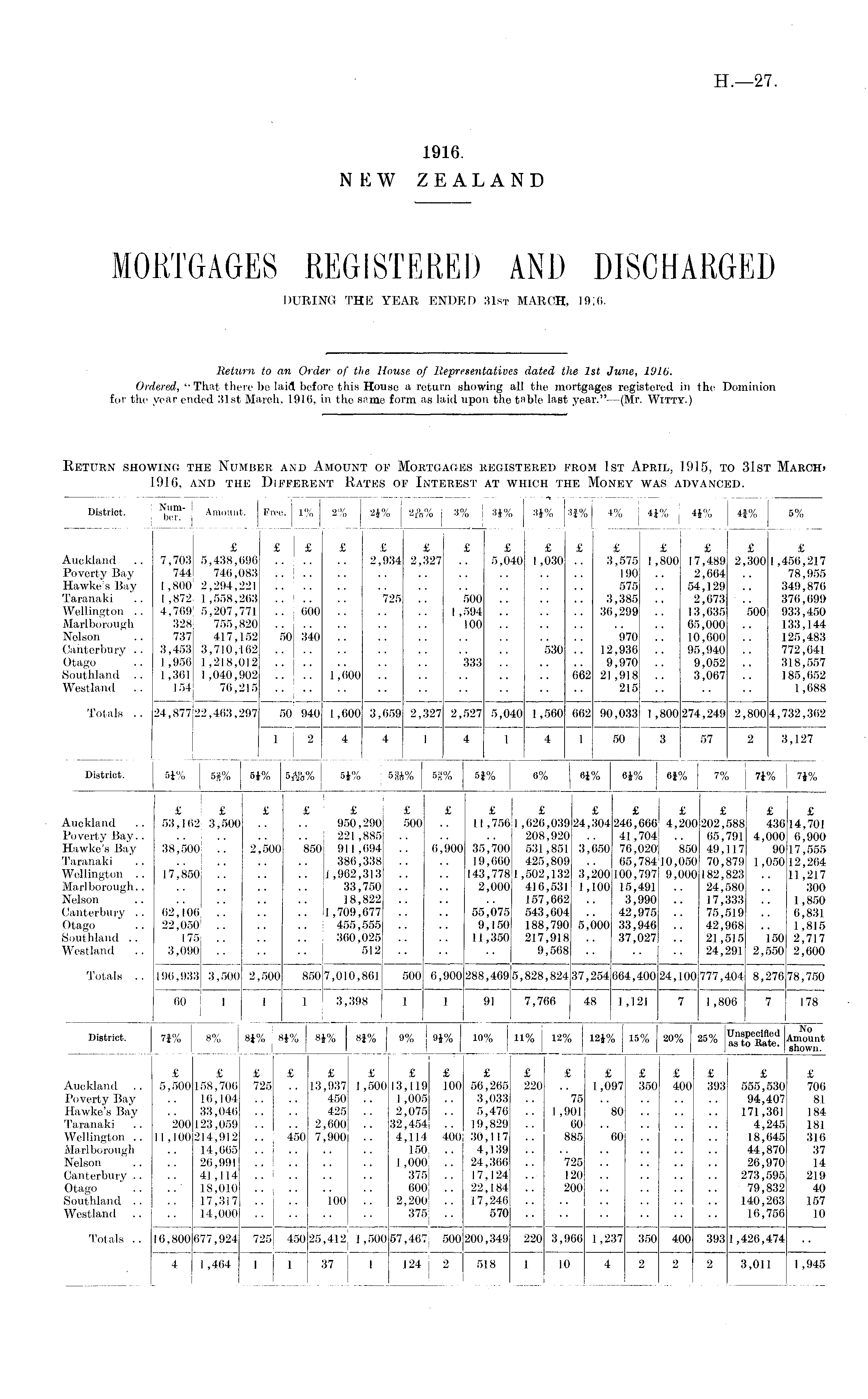 Return to an Order of the House of Representatives dated the Ist June, 191b. Ordered, "That there be laid before this House a return showing all the mortgages registered in the Dominion for the year ended 31st March, 1916, in tho same form as laid upon the table last year."—(Mr. Witty.)