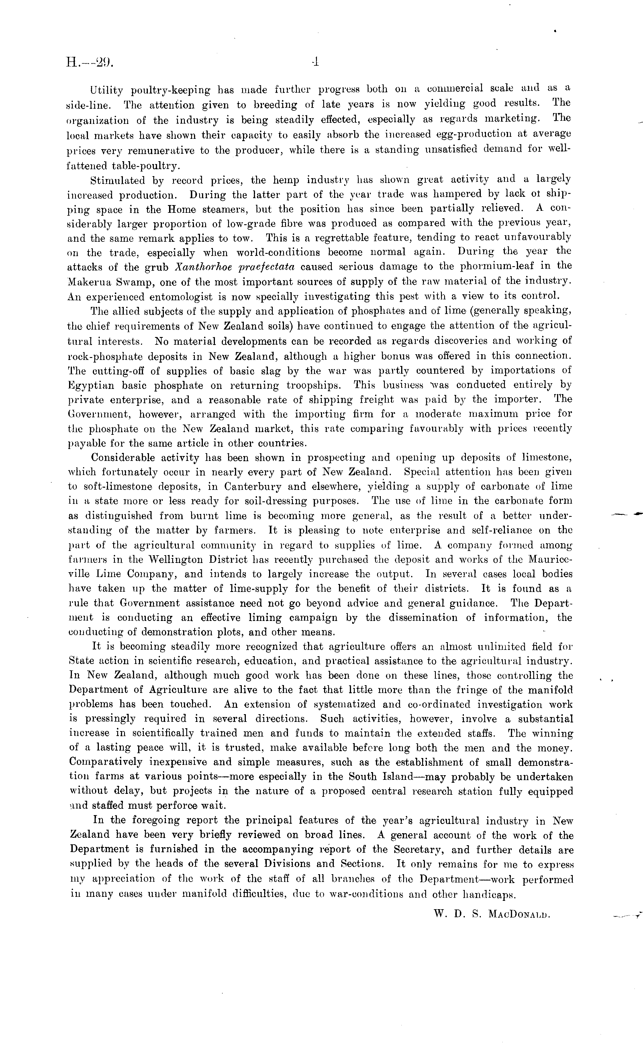 Utility poultry-keeping has made further progress both on a commercial scale and as a side-line. The attention given to breeding of late years is now yielding good results. The organization of the industry is being steadily effected, especially as regards marketing. The local markets have shown their capacity to easily absorb the increased egg-production at average prices very remunerative to the producer, while there is a standing unsatisfied demand for wellfattened table-poultry. Stimulated by record prices, the hemp industry has shown great activity and a largely increased production. During the latter part of the year trade was hampered by lack ot shipping space in the Home steamers, but the position has since been partially relieved. A considerably larger proportion of low-grade fibre was produced as compared with the previous year, and the same remark applies to tow. This is a regrettable feature, tending to react unfavourably on the trade, especially when world-conditions become normal again. During the year the attacks of the grub Xanthorhoe praefeetata caused serious damage to the phormium-leaf in the Makerua Swamp, one of the most important sources of supply of the raw material of the industry. An experienced entomologist is now specially investigating this pest with a view to its control. The allied subjects of the supply and application of phosphates and of lime (generally speaking, the chief requirements of New Zealand soils) have continued to engage the attention of the agricultural interests. No material developments can be recorded as regards discoveries and working of rock-phosphate deposits in New Zealand, although a higher bonus was offered in this connection. The cutting-off of supplies of basic slag by the war was partly countered by importations of Egyptian basic phosphate on returning troopships. This business Avas conducted entirely by private enterprise, and a reasonable rate of shipping freight was paid by the importer. The Government, however, arranged with the importing firm for a moderate maximum price for the phosphate on the New Zealand market, this rate comparing favourably with prices recently payable for the same article in other countries. Considerable activity has been shown in prospecting and opening up deposits of limestone, which fortunately occur in nearly every part of New Zealand. Special attention has been given to soft-limestone deposits, in Canterbury and elsewhere, yielding a, supply of carbonate of lime in a state more or less ready for soil-dressing purposes. The use of lime in the carbonate form as distinguished from burnt lime is becoming more general, as the result of a better understanding of the matter by farmers. It is pleasing to note enterprise and self-reliance on the part of the agricultural community in regard to supplies of lime. A company formed among farmers in the Wellington District has recently purchased the deposit and works of the Mauriceville Lime Company, and intends to largely increase the output. In several cases local bodies have taken up the matter of lime-supply for the benefit of their districts. It is found as a rule that Government assistance need not go beyond advice and general guidance. The Department is conducting an effective liming campaign by the dissemination of information, the conducting of demonstration plots, and other means. It is becoming steadily more recognized that agriculture offers an almost unlimited field for State action in. scientific research, education, and practical assistance to the agricultural industry. In New Zealand, although much good work has been done on these lines, those controlling the Department of Agriculture are alive to the fact that little more than the fringe of the manifold problems has been touched. An extension of systematized and co-ordinated investigation work is pressingly required in several directions. Such activities, however, involve a substantial increase in scientifically trained men and funds to maintain the extended staffs. The winning of a lasting peace will, it is trusted, make available before long both the men and the money. Comparatively inexpensive and simple measures, such as the establishment of small demonstration farms at various points—more especially in the South Island—may probably be undertaken without delay, but projects in the nature of a proposed central research station fully equipped and staffed must perforce wait. In the foregoing report the principal features of the year's agricultural industry in New Zealand have been very briefly reviewed on broad lines. A general account of the work of the Department is furnished in the accompanying report of the Secretary, and further details are supplied by the heads of the several Divisions and Sections. It only remains for me to express my appreciation of the work of the staff of all branches of the Department—work performed in many cases under manifold difficulties, due to war-conditions and other handicaps. W. D. S. MaoDonald.