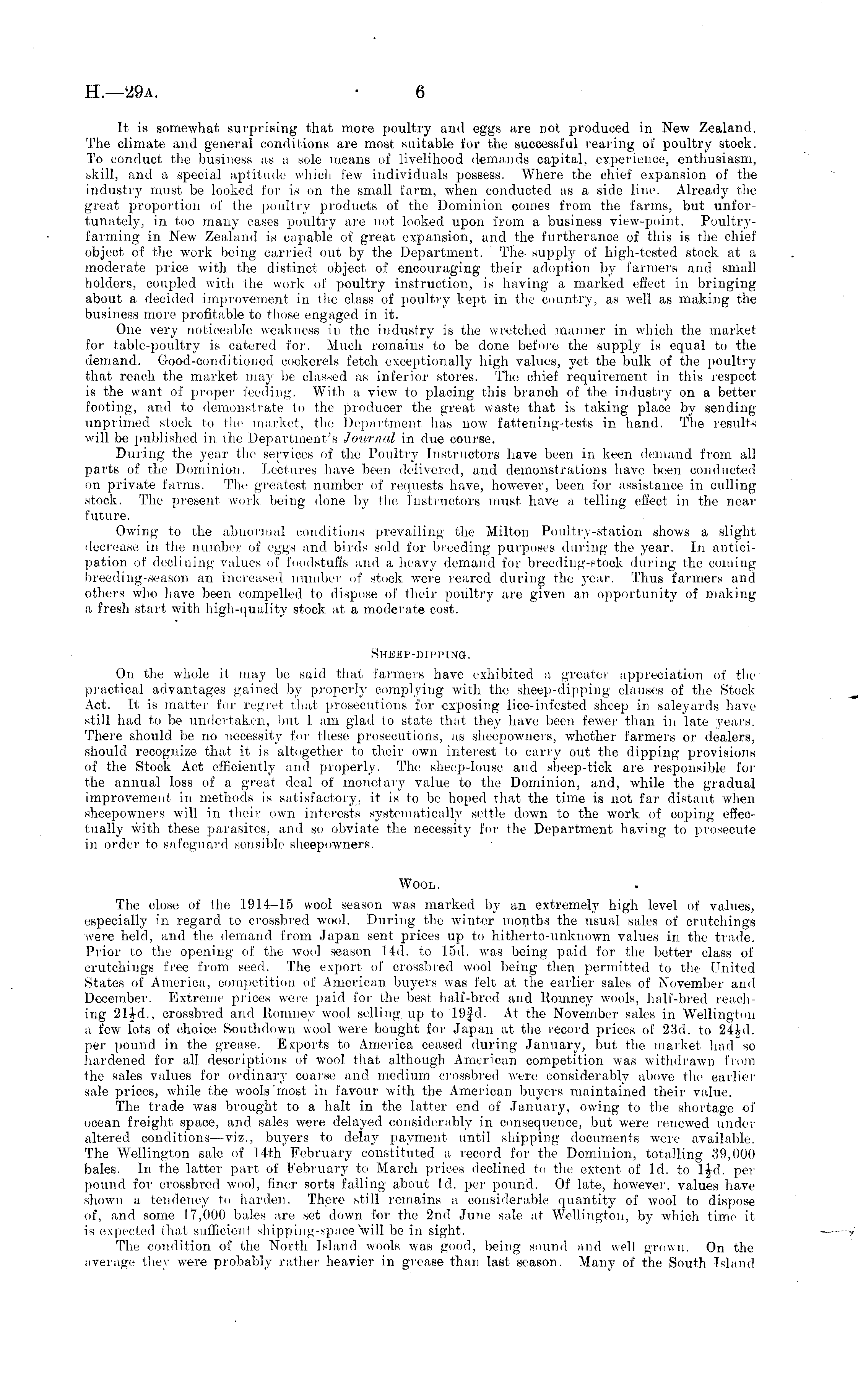 It is somewhat surprising that more poultry and eggs are not produced in New Zealand. The climate and general conditions are most suitable for the successful rearing of poultry stock. To conduct the business as a sole means of livelihood demands capital, experience, enthusiasm, skill, and a special aptitude which few individuals possess. Where the chief expansion of the industry must be looked for is on the small farm, when conducted as a side line. Already the great proportion of the poultry products of the Dominion comes from the farms, but unfortunately, in too many cases poultry are not looked upon from a business view-point. Poultryfarming in New Zealand is capable of great expansion, and the furtherance of this is the chief object of the work being carried out by the Department. The- supply of high-tested stock at a, moderate price with the distinct object of encouraging their adoption by farmers and small holders, coupled with the work of poultry instruction, is having a marked effect in bringing about a decided improvement, in the class of poultry kept in the country, as well as making the business more profitable to those engaged in it. One very noticeable weakness in the industry is the wretched manner in which the market for table-poultry is catered for. Much remains to be done before the supply is equal to the demand. Good-conditioned cockerels fetch exceptionally high values, yet the bulk of the poultry that reach the market may be classed as inferior stores. The chief requirement in this respect, is the want of proper feeding. With a view to placing this branch of the industry on a better footing, and to demonstrate to the producer the great waste that is taking place by sending unprimed stock to the market, the Department has now fattening-tests in hand. The results will be published in the Department's Journal in due course. During the year the services of the Poultry Instructors have been in keen demand from all parts of the Dominion. Lectures have been delivered, and demonstrations have been conducted on private farms. The greatest, number of requests have, however, been for assistance in culling stock. The present, work- being done by the Instructors must have a, telling effect in the near future. Owing to the abnormal conditions prevailing the Milton Poultry-station shows a slight decrease in the number of eggs and birds sold for breeding purposes during the year. In anticipation of declining values of foodstuffs and a heavy demand for breeding-stock during the coming breeding-season an increased number of stock were reared during the year. Thus farmers and others who have been compelled to dispose of their poultry are given an opportunity of making a, fresh start with high-quality stock at a moderate cost. Sheep-dipping. On the whole it may be said that farmers have exhibited a greater appreciation of the practical advantages gained by properly complying with the sheep-dipping clauses of the Stock Act. It is matter for regret that prosecutions for exposing lice-infested sheep in saleyards have still had to be undertaken, but 1 am glad to state that they have been fewer than in late years. There should be no necessity for these prosecutions, as sheepowners, whether farmers or dealers, should recognize that it is altogether to their own interest to carry out the dipping provisions of the Stock Act efficiently and properly. The sheep-louse and sheep-tick are responsible for the annual loss of a great deal of monetary value to the Dominion, and, while the gradual improvement in methods is satisfactory, it is to be hoped that the time is not far distant when sheepowners will in their own interests systematically settle down to the work of coping effectually with these parasites, ami so obviate the necessity for the Department having to prosecute in order to safeguard sensible sheepowners. Wool. . The close of the 1914-15 wool season was marked by an extremely high level of values, especially in regard to crossbred, wool. During the winter months the usual sales of crutchings were held, and the demand from Japan sent prices up to hitherto-unknown values in the trade. Prior to the opening of the wool season 14d. to 15d. was being paid for the better class of crutchings free from seed. The export, of crossbred wool being then permitted to the United States of America, competition of American buyers was felt at, the earlier sales of November and December. Extreme prices were paid for the best half-bred and Romney wools, half-bred reaching 21id.. crossbred and Romney wool selling up to 19fd. At the November sales in Wellington a few lots of choice Southdown wool were bought for Japan at the record prices of 23d. to 24Ad. per pound in the grease. Exports to America ceased during January, but the market had so hardened for all descriptions of wool that although American competition was withdrawn from the sales values for ordinary coarse and medium crossbred were considerably above the earlier sale prices, while the wools'most in favour with the American buyers maintained their value. The trade was brought to a halt in the latter end of January, owing to the shortage of ocean freight space, and sales were delayed considerably in consequence, but were renewed under altered conditions —viz., buyers to delay payment until shipping documents were available. The Wellington sale of I.4th February constituted a record for the Dominion, totalling 39,000 bales. In the latter part of February to March prices declined to the extent, of Id. to lid. per pound for crossbred wool, finer sorts falling about Id. per pound. Of late, however, values have shown a tendency to harden. There still remains a considerable quantity of wool to dispose of, and some 17,000 bales are set down for the 2nd June sale at Wellington, by which time it is expected that sufficient shipping-space will be in sight. The condition of the North Island wools was good, being sound and well grown. On the average they were 
