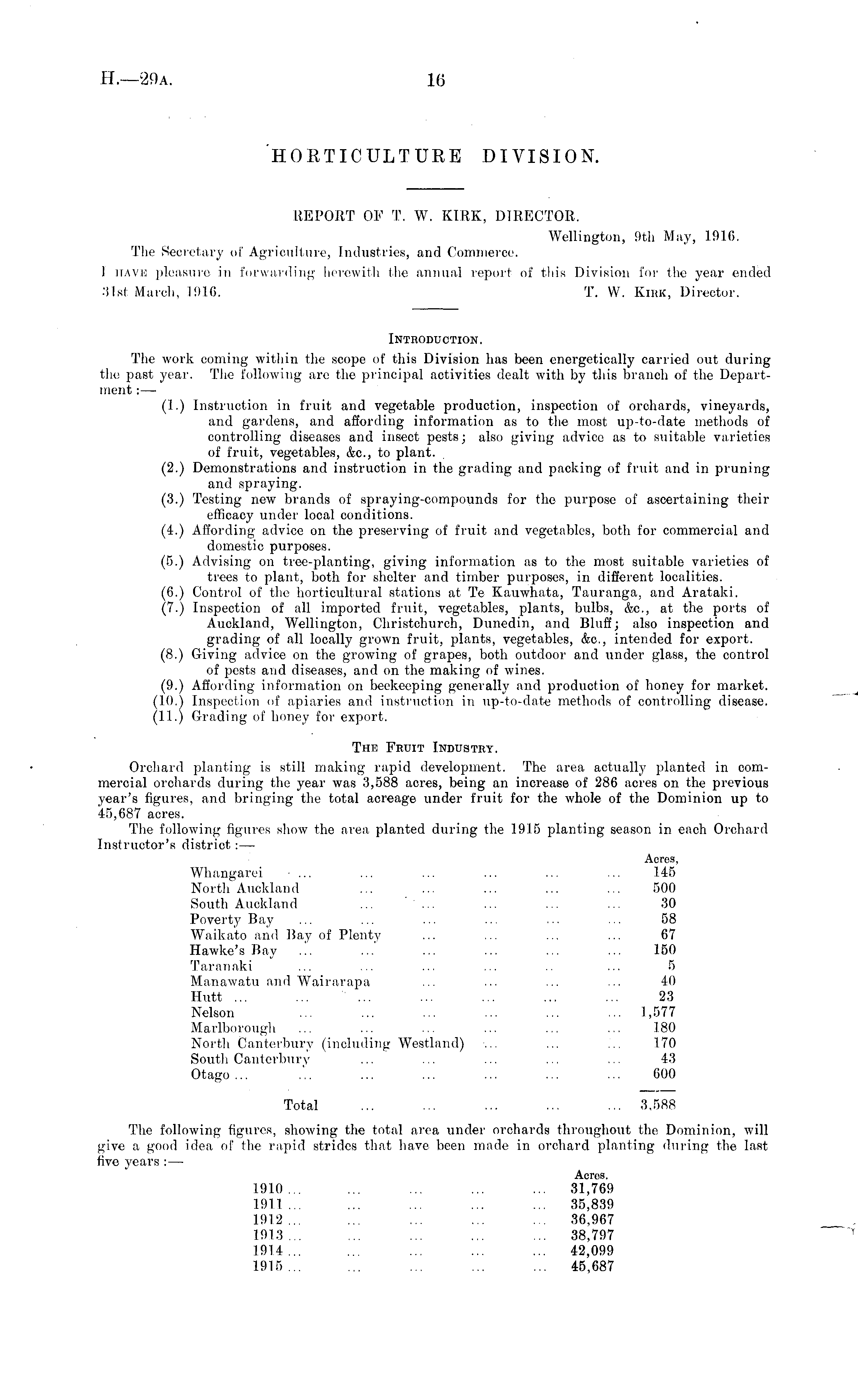 HORTICULTURE DIVISION. REPORT OF T. W. KIRK, DIRECTOR. Wellington, 9th May, 1916. The Secretary of Agriculture, Industries, and Commerce. 1 HAVE pleasure in forwarding herewith the annual report of this Division for the year ended 31st March, 1916. T. VV. Kirk, Director.