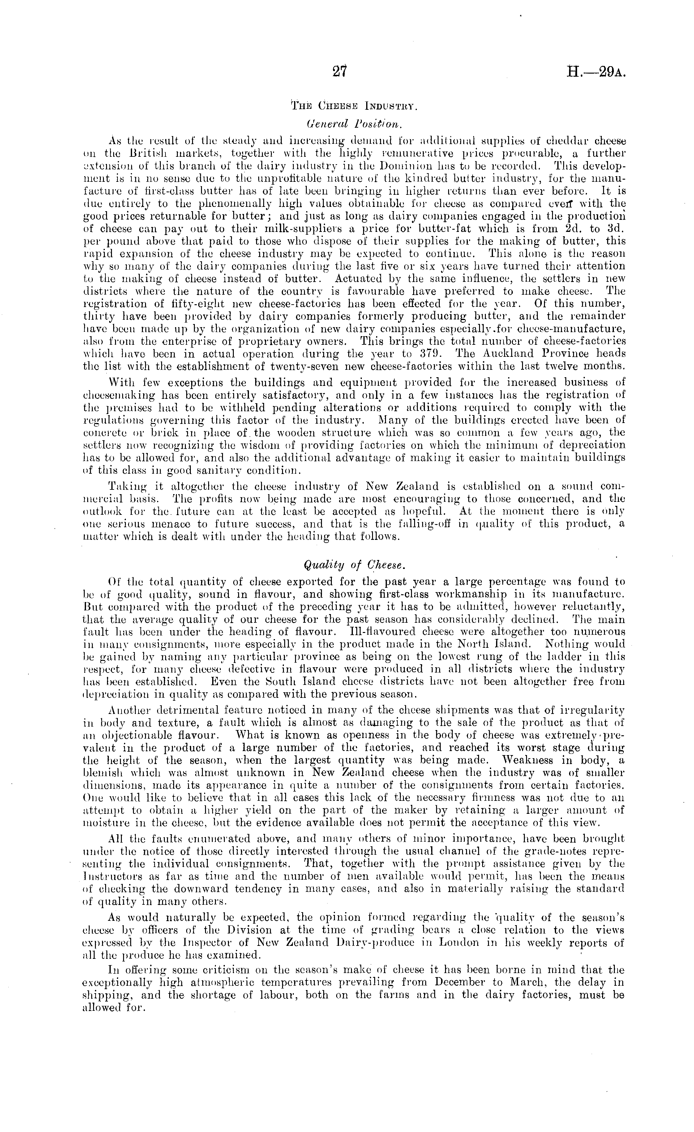 The Ciieesk Industry. General Position. As the result of the steady and increasing demand for additional supplies of cheddar cheese On the British markets, together with the highly remunerative prices procurable, a further extension of this branch of the dairy industry in the Dominion lias to be recorded, This development is in no souse due to the unprofitable nature of the, kindred butter industry, for the manufacture of first-class butter has of late been bringing in higher returns than ever before. It is due entirely to the phenomenally high values obtainable for cheese as compared even* with the good prices returnable for butter; and just as long as dairy companies engaged in the production of cheese can pa)- out to their milk-suppliers a price for butter-fat which is from 2d. to 3d. per pound above that paid to those who dispose of their supplies for the making of butter, this rapid expansion of the cheese industry may be expected to continue. This alone is the reason why so many of the dairy companies during the last five or six years have turned their attention to the making of cheese instead of butter. Actuated by the same influence, the settlers in new districts where the nature of the country is favourable have preferred to make cheese. The registration of fifty-eight new cheese-factories has been effected for the year. Of this number, thirty have been provided by dairy companies formerly producing butter, and the remainder have been made up by the organization of new dairy companies especially .for cheese-manufacture, also from the enterprise of proprietary owners. This brings the total number of cheese-factories which have been in actual operation (luring the year to 379. The Auckland Province heads the list with the establishment of twenty-seven new cheese-factories within the last twelve months. With few exceptions the buildings and equipment provided for the increased business of cheesemaking has been entirely satisfactory-, and only in a few instances has the registration of the premises had to be withheld pending alterations or additions required to comply with the regulations governing this factor of the industry. Many of the buildings erected have been of concrete or brick in place of. the wooden structure which was so common a few years ago, the settlers now recognizing the wisdom of providing factories on which the minimum of depreciation has to be allowed for, and also the additional advantage of making it easier to maintain buildings of this class in good sanitary condition. Taking it altogether the cheese industry of New Zealand is established on a sound commercial basis. The profits now being made are most encouraging to those concerned, and the outlook for the. future can at, the least be accepted as hopeful. At the moment there is only one serious menace to future success, and that is the falling-off in quality of this product, a matter which is dealt with under the heading that follows. Quality of Cheese. Of the total quantity of cheese exported for the past year a large percentage was found to be of good quality, sound in flavour, and showing first-class workmanship in its manufacture. But compared with tho product of the preceding year it has to be admitted, however reluctantly, that the average quality of our cheese for the past season has considerably declined. The main fault has been under the heading of flavour. 111-flavoured cheese were altogether too numerous in many consignments, more especially in the product made in the North Island. Nothing would be gained by naming any particular province as being on the lowest rung of the ladder in Ibis respect, for many cheese defective in flavour were produced in all districts where the industry has been established. Even the South Island cheese districts have not been altogether free from depreciation in quality as compared with the previous season. Another detrimental feature noticed in many of the cheese shipments was that of irregularity in body and texture, a fault which is almost as damaging to the sale of the product as that of an objectionable flavour. What is known as openness in the body of cheese was extremely prevalent in the product of a large number of the factories, and reached its worst stage during the height of the season, when the largest quantity was being made. Weakness in body, a blemish which was almost unknown in New Zealand cheese when the industry was of smaller dimensions, made its appearance in quite a number of the consignments from certain factories. One would like to believe that in all cases this lack of the necessary firmness was not due to tin attempt to obtain a higher yield on the part of the maker by retaining a larger amount of moisture in the cheese, but the evidence available does not permit the acceptance of this view. All the faults enumerated above, and many others of minor importance, have been brought under the notice of those directly interested through the usual channel of the grade-notes representing the individual consignments. That, together with the prompt assistance given by the Instructors as far as time and the number of men available would permit, has been the means of checking the downward tendency in many cases, and also in materially raising the standard of quality in many others. As would naturally be expected, the opinion formed regarding the quality of the season's cheese by officers of the Division at the time of grading bears a close relation to the views expressed by the Inspector of New Zealand Dairy-produce in London in his weekly reports of all the produce he has examined. In offering some criticism on the season's make of cheese it has been borne in mind that the exceptionally high atmospheric temperatures prevailing from December to March, the delay in shipping, and the shortage of labour, both on the farms and in the dairy factories, must be allowed for.
