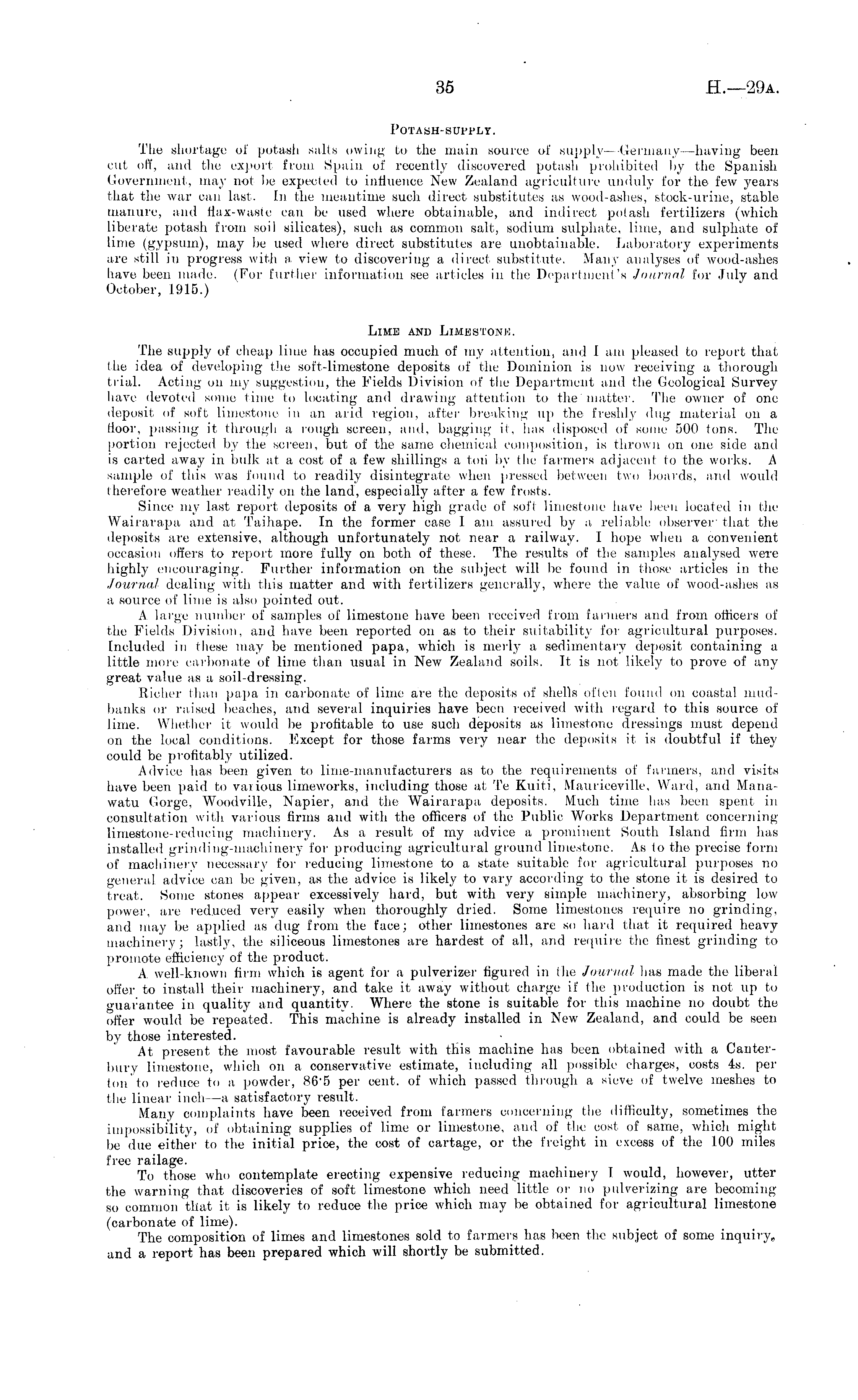 Potash-supply. The shortage of potasii salts owing to the main source of supply—-Germany—having been cut off, and the export from Spain, of recently discovered potash prohibited by the Spanish Government, may not be expected to influence New Zealand agriculture unduly for the few years that the war can last. In the meantime such direct substitutes as wood-ashes, stock-urine, stable manure, and flax-waste can be used where obtainable, and indirect potasii fertilizers (which liberate potash from soil silicates), such as common salt, sodium sulphate, lime, and sulphate of lime (gypsum), may be used where direct substitutes are unobtainable. Laboratory experiments are still in progress with a view to discovering a direct substitute. Many analyses of wood-ashes have been made. (For further information see articles in the Department's Journal for July and October, 1915.) Lime and Limestone. The supply of cheap lime has occupied much of my attention, and 1 am pleased to report that the idea of developing the soft-limestone deposits of the Dominion is now receiving a thorough trial. Acting on my suggestion, the Fields Division of the Department and the Geological Survey have devoted some time to locating and drawing attention to the matter. The owner of one deposit, of soft limestone in an arid region, after breaking up the freshly dug material 011 a floor, passing it, through a rough screen, and, bagging it. lias disposed of some 500 tons. The portion rejected by the screen, but of the same chemical composition, is thrown on one side and is carted away in bulk at a cost of a few shillings a ton by the farmers adjacent to the works. A sample of this was found to readily- disintegrate when pressed between two boards, and would therefore weather readily on the land, especially after a few frosts. Since my last report deposits of a very high grade of soft limestone have been located in the Wairarapa and at, Taihape. In the former case I am assured by a, reliable observer- that the deposits are extensive, although unfortunately not near a railway. I hope when a convenient occasion offers to report more fully on botli of these. The results of the samples analysed were highly encouraging. Further information on the subject will be found in those articles in the Journal dealing with this matter and with fertilizers generally, where the value of wood-ashes as a source of lime is also pointed out. A large number of samples of limestone have been received from farmers and from officers of the Fields Division, and have been reported on as to their suitability for agricultural purposes. Included in these may be mentioned papa, whioh is merly a sedimentary deposit containing a little more carbonate of lime than usual in New Zealand soils. It, is not likely to prove of any great value as a soil-dressing. Richer than papa in carbonate of lime are the deposits of shells often found on coastal mudbanks or raised beaches, and several inquiries have been received with regard to this source of lime. Whether it would be profitable to use such deposits as limestone dressings must depend on the local conditions. Except for those farms very near the deposits it is doubtful if they could be profitably utilized. Advice has been given to lime-manufacturers as to the requirements of farmers, and visits have been paid to various limeworks, including those at Te Kuiti, Mauriceville, Ward, and Manawatu Gorge, Woodville, Napier, and the Wairarapa deposits. Much time has been spent in consultation with various firms and with the officers of the Public Works Department concerning limestone-reducing machinery. As a result of my advice a prominent South Island firm has installed grinding-machinery for producing agricultural ground limestone. As to the precise form of machinery- necessary for reducing limestone to a state suitable for agricultural purposes no general advice can be given, as the advice is likely to vary according to the stone it is desired to treat. Some stones appear excessively hard, but with very simple machinery, absorbing low power, are reduced very easily when thoroughly dried. Some limestones require no grinding, and may be applied as dug from the face; other limestones are so hard that it required heavy machinery; lastly, the siliceous limestones are hardest of all, and require the finest grinding to promote efficiency of the product. A well-known firm which is agent for a pulverizer figured in the Journal has made the liberal offer to install their machinery, and take it away without, charge if the production is not up to guarantee in quality and quantity. Where the stone is suitable for this machine no doubt the offer would be repeated. This machine is already installed in New Zealand, and could be seen by those interested. At, present the most favourable result with this machine has been obtained with a Canterbury limestone, which on a conservative estimate, including all possible charges, costs 4s. per ton to reduce to a powder, 865 per cent, of which passed through a sieve of twelve meshes to the linear mch —a satisfactory result. Many complaints have been received from farmers concerning the difficulty, sometimes the impossibility, of obtaining supplies of lime or limestone, and of the cost of same, which might be due either to the initial price, the cost of cartage, or the freight in excess of the 100 miles free railage. To those who contemplate erecting expensive reducing machinery I would, however, utter the warning that discoveries of soft limestone which need little or no pulverizing are becoming so common that it, is likely to reduce the price which may be obtained for agricultural limestone (carbonate of lime). The composition of limes and limestones sold to farmers has been the subject of some inquiry, and a report has been prepared which will shortly be submitted.