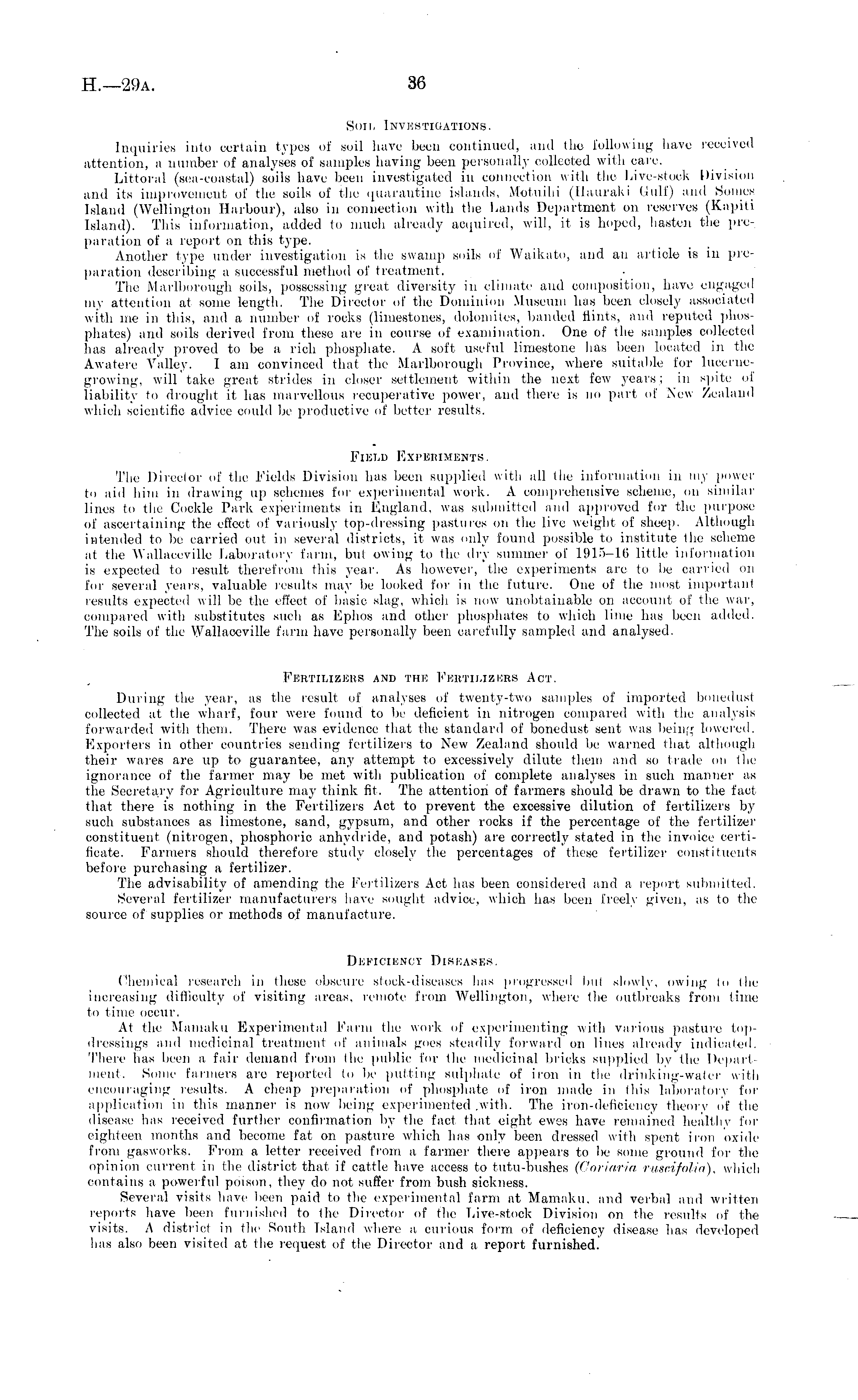 Son, Investigations. Inquiries into certain types of soil have been continued, and the following have received attention, a number of analyses of samples having been personally collected with care. Littoral (sea-coastal) soils have been investigated in connection with the hive-stock Division and its improvement of the soils of the quarantine islands, Motuihi (Hauraki Gulf) and Somes Island (Wellington Harbour), also in connection with the Lands Department on reserves (Kapiti Island). This information, added to much already acquired, will, it is hoped, hasten the preparation of a report on this type. Another type under investigation is the swamp soils of Waikato, and an article is in preparation describing a successful method of treatment. The Marlborough soils, possessing great, diversity in climate and composition, have engaged my attention at some length. The Director of the Dominion Museum has been closely associated with me in this, and a number of rocks (limestones, dolomites, banded flints, and reputed phosphates) and soils derived from these are in course of examination. One of the samples collected has already proved to be a rich phosphate. A soft useful limestone has been located in the Awatere Valley. lam convinced that the Marlborough Province, where suitable for lucernegrowing, will take great strides in closer settlement within the next few years; in spite of liability to drought it has marvellous recuperative power, and there is no part of New Zealand which scientific advice could lie productive of better results. Field Experiments . 'The Director of the Fields Division has been supplied with all the in formation in my power to aid him in drawing up schemes for experimental work. A comprehensive scheme, on similar lines to the Cockle Park experiments in England, was submitted and approved for the purpose of ascertaining the effect of variously top-dressing pastures on the live weight of sheep. Although intended to be carried out in several districts, it was only found possible to institute the scheme at the Wallaceville Laboratory farm, bul owing to the dry summer of 1915-16 little information is expected to result therefrom this year. As however, the experiments are to be carried on for several years, valuable results may be looked for in the future. One of the most important results expected will be the effect of basic slag, which is now unobtainable on account of the war, compared with substitutes such as Ephos and other phosphates to which lime has been added. The soils of the Wallaceville farm have personally been carefully sampled and analysed. Fertilizers and the Fertilizers Act. During the year, as the result, of analyses of twenty-two samples of imported bone-dust collected at the wharf, four were found to lie deficient in nitrogen compared with the analysis forwarded with them. There was evidence that the standard of bonedust sent was being lowered. Exporters in other countries sending fertilizers to New Zealand should be warned that although their wares are up to guarantee, any attempt to excessively dilute them and so trade on the ignorance of the farmer may be met with publication of complete analyses in such manner as the Secretary for Agriculture may think fit. The attention of farmers should be drawn to the fact that there is nothing in the Fertilizers Act to prevent the excessive dilution of fertilizers by such substances as limestone, sand, gypsum, and other rocks if the percentage of the fertilizer constituent (nitrogen, phosphoric anhydride, and potash) are correctly stated in the invoice certificate. Farmers should therefore study closely the percentages of these fertilizer constituents before purchasing a fertilizer. The advisability of amending the Fertilizers Act has been considered and a report submitted. Several fertilizer manufacturers have sought advice, which has been freely given, as to the source of supplies or methods of manufacture. Deficiency Diskashs. Chemical research in these obscure stock-diseases has progressed bul slowly, owing lo the increasing difficulty of visiting areas, remote from Wellington, where the outbreaks from time to time occur. At tin- Mamaku Experimental Farm the work of experimenting with various pasture top dressings and medicinal treatment of animals goes steadily forward on fines already indicated. There has been a fair demand from the public for the medicinal bricks supplied by the Depart iiieul. Some farmers are reported lo be putting sulphate of iron in the drinking-water with encouraging results. A cheap preparation of phosphate of iron made in this laboratory for application in this manner is now- being experimented .with. The iron-deficiency theory of the disease has received further confirmation by the fact that eight, ewes have remained healthy for eighteen months and become fat, on pasture which has only been dressed with spent iron oxide from gasworks. From a letter received from a farmer there appears to be some ground for the opinion current in the district that if cattle have access to tutu-bushes (Coriaria ruscifolia), which contains a powerful poison, they do not suffer from bush sickness. Several visits have been paid to the experimental farm at Mamaku. and verbal and written reports have been furnished to the Director of the Live-stock Division on the results of the visits. A district in the South Island when- a curious form of deficiency disease has developed has also been visited at the request of the Director and a report furnished.