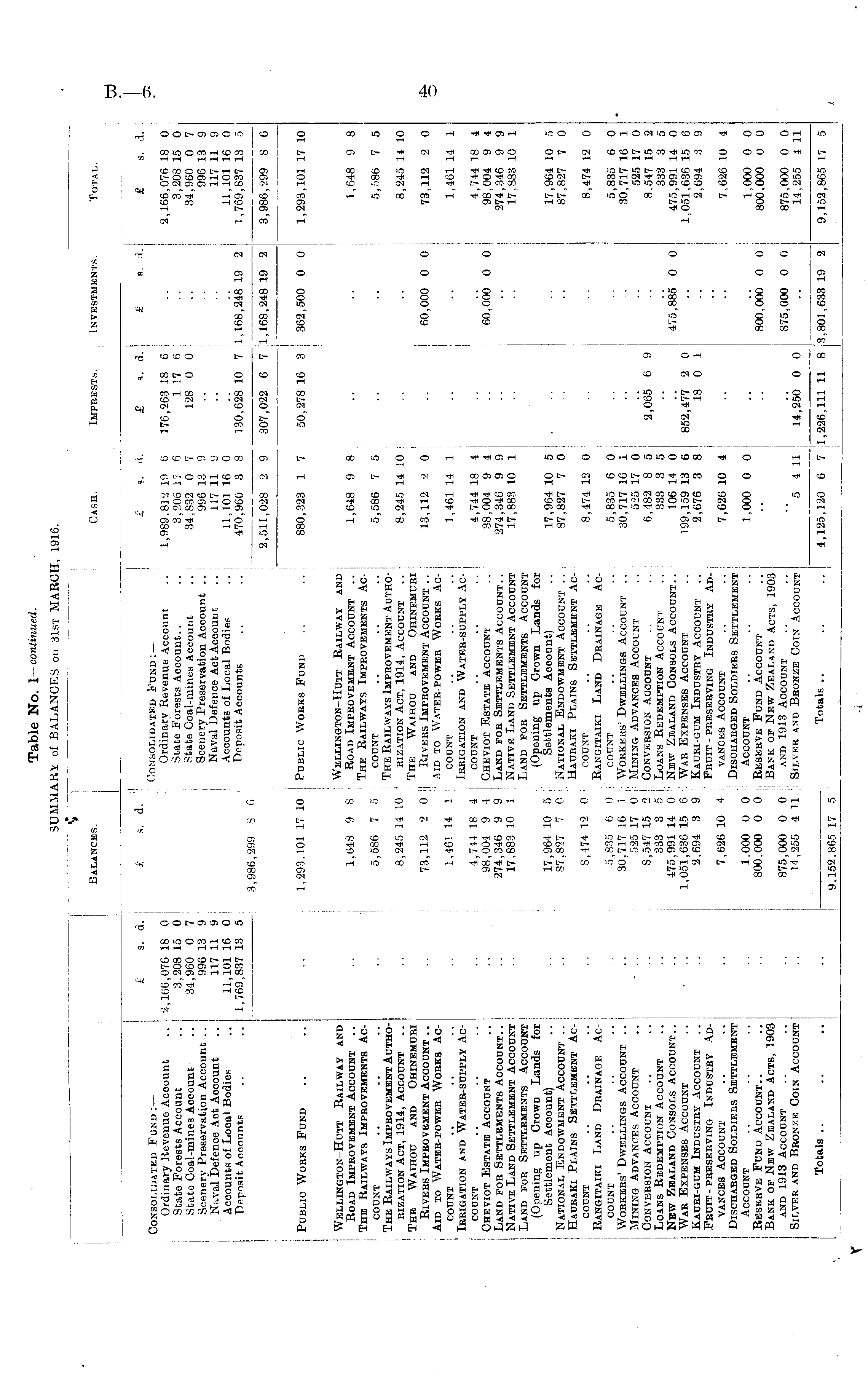 Balances. Balances. II Cash. Imprests. Investments. Total. - i I Consolidated Fund :— Ordinary Revenue Account State Forests Account State Coal-mines Account Scenery Preservation Account .. Naval Defence Act Account Accounts of Local Bodies Derosit Accounts l__ !__ £ s. d. £ s. d. Consolidated Fund : — 2,166,076 18 0 Ordinary Revenue Account 3,208 15 0 State Forests Account.. 34,960 0 7 State Coal-mines Account 996 13 9 Scenery Preservation Account .. 117 11 9 Naval Defence Act Account 11,10116 0 Ac-counts of Local Bodies 1,769,837 13 5 Deposit Accounts £ a. A. £ s. d. £ s. d. 1,989,812 19 6 176,263 18 6 3,206 17 6 1 17 6 34,832 0 7 128 0 0 996 13 9 117 11 9 11,101 16 0 470,960 3 8 130,628 10 7 1,168,248 19 2 £ s. d. 2,166,076 18 0 3,208 15 0 34,960 0 7 996 13 9 117 11 9 11,101 16 0 1,769,837 13 5 I - 3,986,299 8 6 2.511.028 2 9 307.022 6 7 1.168.248 19 2 3.986.299 8 6 2,511,028 2 9 ' 307,022 6 7 1,168,248 19 2 3,986,299 8 6 2,011,1128 2 9 O I :l,10a,Z4B 19 A 3, aab, -jyy o o I . _ I Public Works Fund Wellington-Hutt Railway and Road Improvement Account The Railways Improvements Account The Railways Improvement Authorization Act, 1914, Account The W'aihou and Ohinemuri Rivers Improvement Account .. , Aid to Water-power Works Account Irrigation and Water-supply Account Cheviot Estate Account Land for Settlements Account.. Native Land Settlement Account Land for Settlements Account (Opening up Crown Lands for Settlement Account) National Endowment Account .. Hauraki Plains Settlement Account Rangitaiki Land Drainage Account Workers' Dwellings Account .. Mining Advances Account Conversion Account Loans Redemption Account New Zealand Consols Account.. War Expenses Account Kauri-gum Industry Account Fruit - preserving Industry Advances Account .. Discharged Soldiers Settlement Account Reserve Fund Account.. Bank of New Zealand Acts, 1903 and 1913 Account Silver and Bronze Coin Account 1,293.101 17 10 Public Works Fund 880,323 1 7 50,278 16 3 362,500 0 0 1,293,101 17 10 1,293,101 17 10 _ 1,648 9 8 Wellington-Hutt Railway and 1,648 9 8 Road Improvement Account The Railways Improvements Ac1,648 9 8 1,648 9 8 5,586 7 5 i count The Railw-ays Improvement Autho8,245 14 !0 sization Act, 1914, Account The Waihou and Ohinemuri 73,112 2 0 I Rivers Improvement Account .. Aid to Water-power Works Ac1,461 14 1 count Irrigation and Water-supply Ac4,714 18 4 count 98,004 9 4 Cheviot Estate Account 274,346 9 9 Land for Settlements Account. . 17,883 10 1 Native Land Settlement Account Land for Settlements Account (Opening up Crown Lands for 17,964 10 5 Settlements Account) 87,827 7 0 National Endowment Account .. Hauraki Plains Settlement Ac8,474 12 0 count Rangitaiki Land Drainage Ac5,835 6 il count 30,717 16 i Workers' Dwellings Account .. - . . 525 17 0 Mining Advasces Account 8,547 15 2 Conversion Account 333 3 5 Loans Redemption Account 475,991 14 0 New Zealand Consols Account.. 1,051,636 15 6 War Expenses Account 2,694 3 9 Kauri-gum Industry Account Fruit - preserving Industry Ad7,626 10 4 vances Account Discharged Soldiers Settlement 1.000 0 0 Account 800.000 0 0 Reserve Fund Account Bank of New Zealand Acts, 1903 875,000 0 0 and 1913 Account 14,255 4 11 Silver and Bronze Coin Account Totals 9.152.865 17 5 5,586 7 5 8,245 14 10 13,112 2 0 .. 60,000 0 0 1,461 14 1 4,744 18 4 38.004 9 4 .. 60,000 0 0 274,346 9 9 17,883 10 1 17,964 10 5 . 37,827 7 0 8,474 12 0 5,835 6 0 30,717 16 1 525 17 0 6,482 8 5 i 2,065 6 9 333 3 5 ! 106 14 0 ! .. 475.885 0 0 199,159 13 6 j 852,477 2 0 2,676 3 8 18 0 1 7,626 10 4 j .. '.'. 1,000 0 0 i 800,000 0 0 875,000 0 0 5 1 11 14,250 0 0 4,125,120 6 7 1,226,111 11 8 3,801,633 19 2 5,586 7 5 5,586 7 5 8,245 14 10 73,112 2 0 1,461 14 1 4,744 18 4 98.004 9 4 274,346 9 9 17,883 10 1 17,964 10 5 87,827 7 0 8,474 12 0 5,835 6 0 30.717 16 1 525 17 0 8.547 15 2 333 3 5 475,991 14 0 1,051,636 15 6 2,694 3 9 7,626 10 4 1.000 0 0 800,000 0 0 875.000 0 0 14,255 4 11 9,152,865 17 5 8,245 14 10 73,112 2 0 1,461 14 1 4,744 18 4 98.004 9 4 274,346 9 9 17,883 10 1 17,964 10 5 87,827 7 0 I 8,474 12 0 5,835 6 0 30.717 16 1 525 17 0 8.547 15 2 333 3 5 475,991 14 0 1,051,636 15 6 2,694 3 9 7,626 10 4 1.000 0 0 800,000 0 0 875.000 0 0 14,255 4 11 Totals .. 9,152,865 17 5