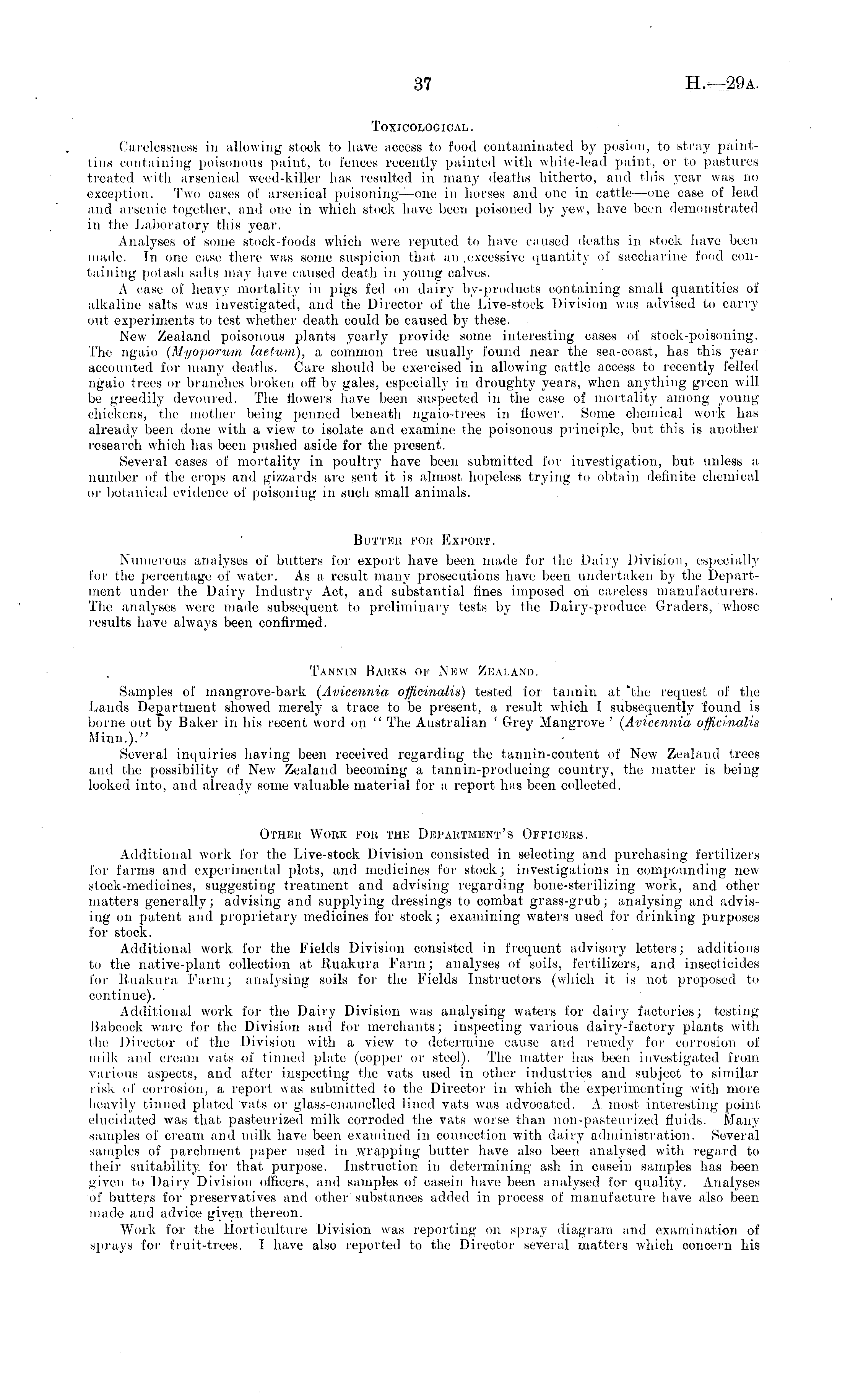 ToxtOOLOGICAL. Carelessness in allowing stock to have access to food contaminated by posion, to stray painttins containing poisonous paint, to fences recently painted with white-lead paint, or to pastures treated with arsenical weed-killer has resulted in many deaths hitherto, and this year was no exception. Two cases of arsenical poisoning—one in horses and one in cattle —one case of lead and arsenic together, and one in which stock have been poisoned by yew, have been demonstrated in the Laboratory this year. Analyses of some stock-foods which were reputed to have caused deaths in stock have been made. In one case there was some suspicion that an .excessive quantity of saccharine food containing potash salts may have caused death in young calves. A case of heavy mortality in pigs fed on dairy by-products containing small quantities of alkaline salts was investigated, and the Director of the Live-stock Division was advised to carry out experiments to test whether death could be caused by these. New Zealand poisonous plants yearly provide some interesting cases of stock-poisoning. The ngaio (Myoporum laetum), a common tree usually found near the sea-coast, has this year accounted for many deaths. Care should be exercised in allowing cattle access to recently felled ngaio trees or branches broken off by gales, especially in droughty years, when anything green will be greedily devoured. The lowers have been suspected in the case of mortality among young chickens, the mother being penned beneath ngaio-trees in flower. Some chemical work has already been done with a view to isolate and examine the poisonous principle, but this is another research which has been pushed aside for the present. Several cases of mortality in poultry have been submitted for investigation, but unless a number of the crops and gizzards are sent it is almost hopeless trying to obtain definite chemical or botanical evidence of poisoning in such small animals. Butter for Export. Numerous analyses of butters for export have been made for the Dairy Division, especially for the percentage of water. As a result many prosecutions have been undertaken by the Department under the Dairy Industry Act, and substantial fines imposed on careless manufacturers. The analyses were made subsequent to preliminary tests by the Dairy-produce Graders, whose results have always been confirmed. Tannin Barks of New Zealand. Samples of mangrove-bark (Avicennia officinalis) tested for tannin at "the request, of the Lands De£artment showed merely a trace to be present, a result which I subsequently found is borne out by Baker in his recent word on " The Australian ' Grey Mangrove ' (Avicennia officinalis Minn.)." Several inquiries having been received regarding the tannin-content of New Zealand trees and the possibility of New Zealand becoming a tannin-producing country, the matter is being looked into, and already some valuable material for a report has been collected. Other Work for the Department's Officers. Additional work for the Live-stock Division consisted in selecting and purchasing fertilizers for farms and experimental plots, and medicines for stock; investigations in compounding new stock-medicines, suggesting treatment and advising regarding bone-sterilizing work, and other matters generally; advising and supplying dressings to combat grass-grub; analysing and advising on patent and proprietary medicines for stock; examining waters used for drinking purposes for stock. Additional work for the Fields Division consisted in frequent advisory letters; additions to the native-plant collection at Ruakura Farm; analyses of soils, fertilizers, and insecticides for Ruakura Farm; analysing soils for the Fields Instructors (which it is not proposed to continue). Additional work for the Dairy Division was analysing waters for dairy factories; testing Babcock ware for the Division and for merchants; inspecting various dairy-factory plants with the Director of the Division with a view to determine cause and remedy for corrosion of milk and cream vats of tinned plate (copper or steel). The matter has been investigated from various aspects, and after inspecting the vats used in other industries and subject to similar risk of corrosion, a report was submitted to the Director in which the experimenting with more heavily tinned plated vats or glass-enamelled lined vats was advocated. A most interesting point elucidated was that pasteurized milk corroded the vats worse than non-pasteurized fluids. Many samples of cream and milk have been examined in connection with dairy administration. Several samples of parchment paper used in wrapping butter have also been analysed with regard to their suitability, for that purpose. Instruction in determining ash in casein samples has been given to Dairy Division officers, and samples of casein, have been analysed for quality. Analyses of butters for preservatives and other substances added in process of manufacture have also been made and advice given thereon. Work for the Horticulture Division was reporting on spray diagram and examination of sprays for fruit-trees. I have also reported to the Director several matters which concern his