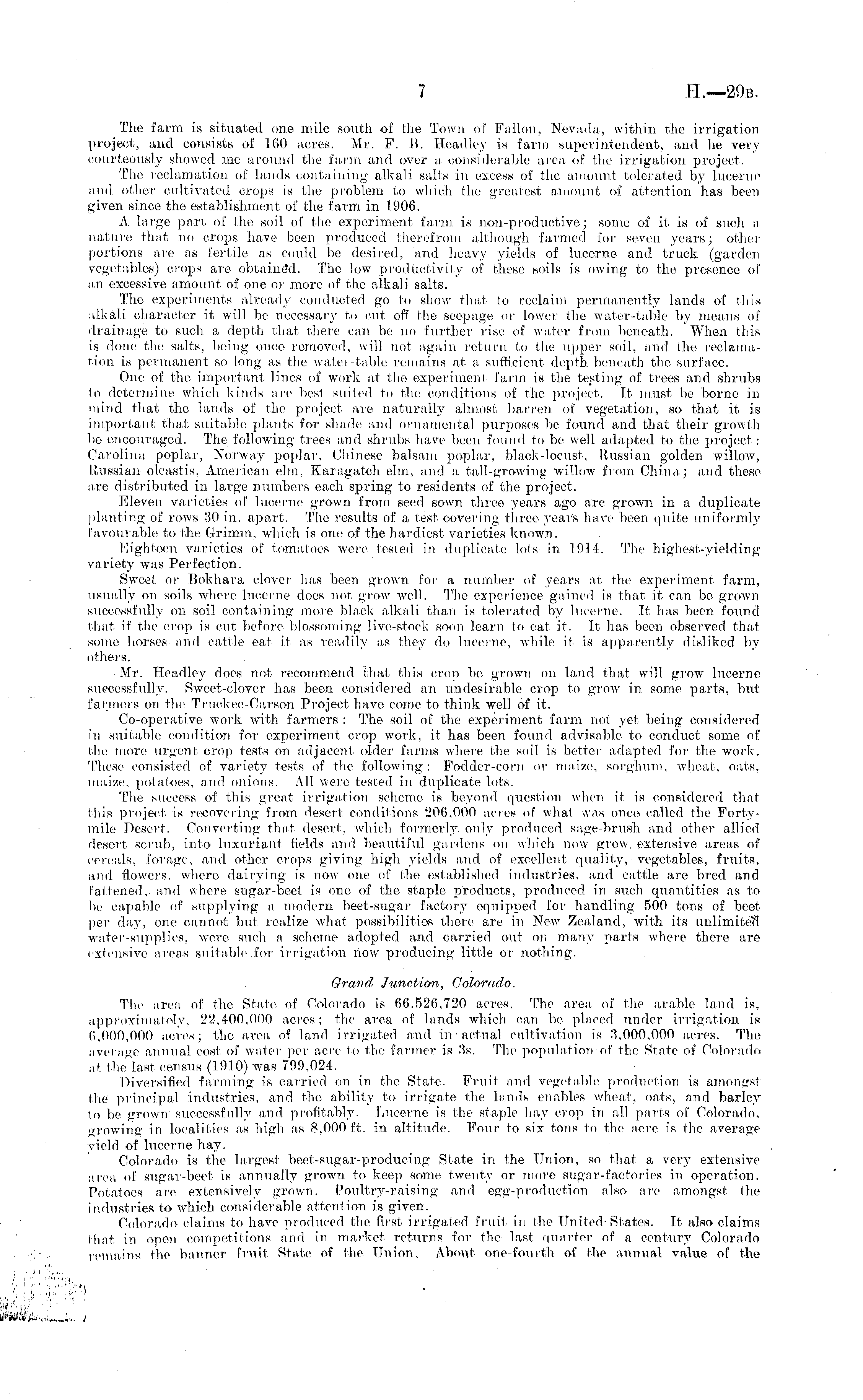 The farm is situated one mile south of the Town of Fallon, Nevada,, within the irrigation project, and consists of 160 acres. Mr. F. B. Headley is farm superintendent, and he very courteously showed me around the farm ami over a considerable area of the irrigation project. The reclamation of lands containing alkali salts in excess of the amount tolerated by lucerne and. other cultivated crops is the problem to which the greatest amount of attention has been given since the establishment of the farm in 1906. A large part of the soil of the experiment farm is non-productive; some of it is of such a nature that, no crops have been produced therefrom although farmed for seven years; other portions are as fertile as could be desired, and heavy yields of lucerne and truck (garden vegetables) crops are obtained. Tint low productivity of these soils is owing to the presence of an. excessive amount of one or more of the alkali salts. The experiments already conducted go to show that lo reclaim permanently lands of this alkali character it will be necessary to cut off the seepage or lower the water-table by means of drainage to such a depth that there can be no further lis.- of water from beneath. When this is done the salts, being once removed, will not again return to the upper soil, and the reclamation is permanent so long as the water-table remains at a sufficient depth beneath the surface. One of the important lines of work at the experiment farm is the testing of trees and shrubs to determine which kinds are best suited to the conditions of the project. It must be borne in mind that the lands of the project are naturally almost barren of vegetation, so that it, is important that suitable plants for shade and ornamental purposes be found and that their growth be encouraged. The following trees and shrubs have been found to be well adapted to the project. : Carolina poplar, Norway poplar, Chinese balsam poplar, black-locust, Russian golden willow, Russian oleastis, American elm, Karagatch elm, and a tall-growing willow from China; and these are distributed in large numbers each spring to residents of the project. Eleven varieties of lucerne grown from seed sown three years ago are grown in a duplicate planting of rows 30 in. apart. The results of a test covering three years have been quite uniformly favourable to the Grimm, which is one of the hardiest varieties known. Eighteen varieties of tomatoes were tested in duplicate lots in 191 I. The highest-yielding variety was Perfection. Sweet or Bokhara clover has been grown for a number of years at the experiment, farm, usually on soils where lucerne does not grow well. The experience gained is that it can be grown successfully on soil containing more black alkali than is tolerated by lucerne. It has been found thai if the crop is cut before blossoming live-stock soon learn to eat it. It has been observed that some horses and cattle cat it as readily as they do lucerne, while it is apparently disliked by others. Mr. Headley does not recommend that this crop be grown on land that will grow lucerne successfully. Sweet-clover has been considered an undesirable crop lo grow in some parts, but farmers on the Truckee-Carson Project, have come to think well of it. Co-operative work with farmers : The soil of the experiment farm not yet being considered in suitable condition for experiment crop work, it has been found advisable to conduct, some of the more urgent crop tests on adjacent older farms where the soil is better adapted for the work. These consisted of variety tests of the following : Fodder-corn or maize, sorghum, wheat, oats, maize, potatoes, and onions. All were tested in duplicate lots. The success of this great irrigation scheme is beyond question when it is considered that this project is recovering from desert conditions 206.000 acres of what was once called the Fortymile Desert. Converting that desert, which formerly only produced sage-brush and other allied desert scrub, into luxuriant fields and beautiful gardens on which now grow extensive areas of cereals, forage, and other crops giving high yields and of excellent quality, vegetables, fruits, and flowers, where dairying is now one of (he established industries, and cattle are bred and fattened, and where sugar-beet is one of the staple products, produced in such quantities as to be capable of supplying a modern beet-SUgar factory equipped for handling 500 tons of beet, per day, one cannot but realize what possibilities there are in New Zealand, with its unlimited water-supplies, were such a scheme adopted and (tarried out or, many parts where there are extensive areas suitable for irrigation now producing little or nothing. Grand Junction, Colorado. The area of the State- of Colorado is 66,526,720 acres. The area of the arable html is. approximately, 22,400.000 acres; the area of lands which can be placed under irrigation is (i.000,000 acres; the area of land irrigated and in actual cultivation is 3.000,000 acres. The average annual cost of water per acre to the farmer is 3s. The population of the State of Colorado at the last census (1910) was 799,024. Diversified farming is carried on in the State. Fruit and vegetable production is amongst the principal industries, and the ability to irrigate the lands enables wheal, oats, and barley to be grown successfully and profitably. Lucerne is the staple hay crop in all parts of Colorado, ..-rowing in localities as high as B,oooft. in altitude. Four to six tons to the acre is the average yield of lucerne hay. Colorado is the largest beet-sugar-producing State in the Union, SO that a very extensive area of sugar-beet is annually grown to keep some twenty or more sugar-factories in operation. Potatoes are extensively grown. Poultry-raising and egg-production also are amongst the industries to which considerable attention is given. Colorado claims to have produced the first, irrigated fruit in the United States. It also claims that in open c