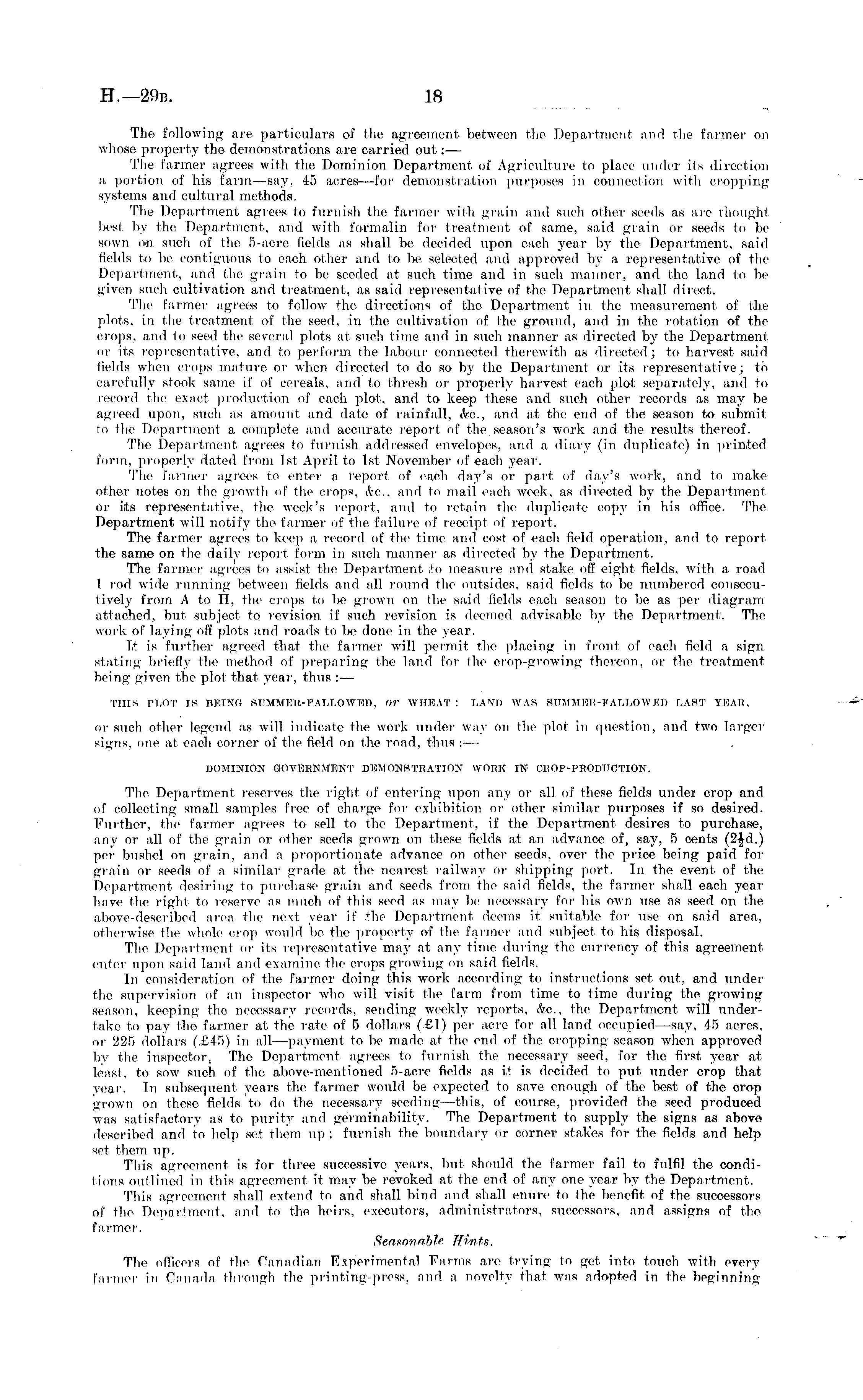 The following are particulars of the agreement between the Department and the farmer on whose property the demonstrations are carried out: — The farmer agrees with the Dominion Department of Agriculture to place under its direction a portion of his farm—say, 45 acres—for demonstration purposes in connection with cropping systems and cultural methods. The Department agrees to furnish the farmer with grain and such other seeds as are thought best, by the Department, and with formalin for treatment of same, said grain or seeds to be sown on such of the 5-acre fields as shall be decided upon each year by the Department, said fields to be contiguous to each other and to be selected and approved by a representative of the Department, and the grain to be seeded at, such time and in such manner, anil the land to be given such cultivation and treatment, as said representative of the Department, shall direct. The farmer agrees to follow the directions of the Department, in the measurement of the plots, in the treatment of the seed, in the cultivation of the ground, and in the rotation of the crops, and to seed the several plots at such time and in such manner as directed by the Department or its representative, and to perform the labour connected therewith as directed; to harvest said fields when crops mature or when directed to do so by the Department or its representative; to carefully sfook same if of cereals, and to thresh or properly harvest cadi plot, separately, and to record the exact production of each plot, and to keep these and such other records as may be agreed upon, such as amount and date of rainfall, etc., and at the end of the season to submit to the Department a complete and accurate report of the. season's work and the results thereof. The Department agrees to furnish addressed envelopes, and a diary (in duplicate) in printed form, properly dated from Ist April to Ist November of each year. The farmer agrees to enter a report of each day's or part of day's work, and to make other notes on the growth of the crops, (fee, and to mail each week, as directed by the Department or its representative, the week's report, and to retain the duplicate copy in his office. The Department will notify the farmer of the failure of receipt of report. The farmer agrees to keep a record of the time and cost of each field operation, and to report the same on the daily report form in such manner as directed by the Department. The farmer agrees to assist, the Department to measure and stake off eight fields, with a road I rod wide running between fields and all round the outsides, said fields to be numbered consecutively from A to H, the crops to lie grown on the said fields each season to be as per diagram attached, but subject to revision if such revision is deemed advisable by the Department. The work of laying off plots and roads to be done in the year. It is further agreed that the farmer will permit the placing in front of each field a sign stating briefly the method of preparing the land for the crop-growing thereon, or the treatment being given the plot that year, thus :— THIS PI/OT IS BEING SUMMER-FALLOWED, or WHEAT: LAND WAS SUMMER-FALLOWED LAST YEAH. or such other legend as will indicate the work under way on the plot in question, and two larger signs, one at each corner of the field on the road, thus : — DOMINION GOVERNMENT DEMONSTRATION WORK IN CROP-PRODUCTION. The Department reserves the right of entering upon any or all of these fields under crop and of collecting small samples free of charge for exhibition or other similar purposes if so desired. Further, the farmer agrees to sell to the Department, if the Department desires to purchase, any or all of the grain or other seeds grown on these fields at an advance of, say, 5 cents (2Jd.) per bushel on grain, and a proportionate advance on other seeds, over the price being paid for grain or seeds of a similar grade at the nearest railway or shipping port. In the event, of the Department desiring to purchase grain and seeds from the said fields, the farmer shall each yearhave the right to reserve as much of this seed as may be necessary for his own use as seed on the above-described area the next year if the Department deems it suitable for use on said area, otherwise the whole crop would be the property of the farmer and subject to his disposal. The Department or its representative may at any time during the currency of this agreement enter upon said land and examine the crops growing on said fields. In consideration of the farmer doing this work according to instructions set out, and under the supervision of an inspector who will visit the farm from time to time during the growingseason, keeping the necessary records, sending weekly reports, &c, the Department will undertake to pay the farmer at the rate of 5 dollars (£1) per acre for all land occupied—say, 45 acres, or 225 dollars (.£45) in all —payment to lie made at the end of the cropping season when approved by the inspector, The Department agrees to furnish the necessary seed, for the first year at least, to sow such of the above-mentioned 5-acre fields as it is decided to put under crop that year. In subsequent years the farmer would be expected to save enough of the best of the crop grown on these fields to do the necessary seeding —this, of course, provided the seed produced was satisfactory as to purity and germinability. The Department to supply the signs as above described and to help set them up ; furnish the boundary or corner stakes for the fields and help set them up. This agreement is for three successive years, but should the farmer fail to fulfil the conditions outlined in this agreement, it may be revoked at the end of any one year by the Department. This agreement shall extend to and shall bind and shall enure to the benefit of the successors of the Department, and to the heirs, executors, administrators, successors, and assigns of the farmer. Season