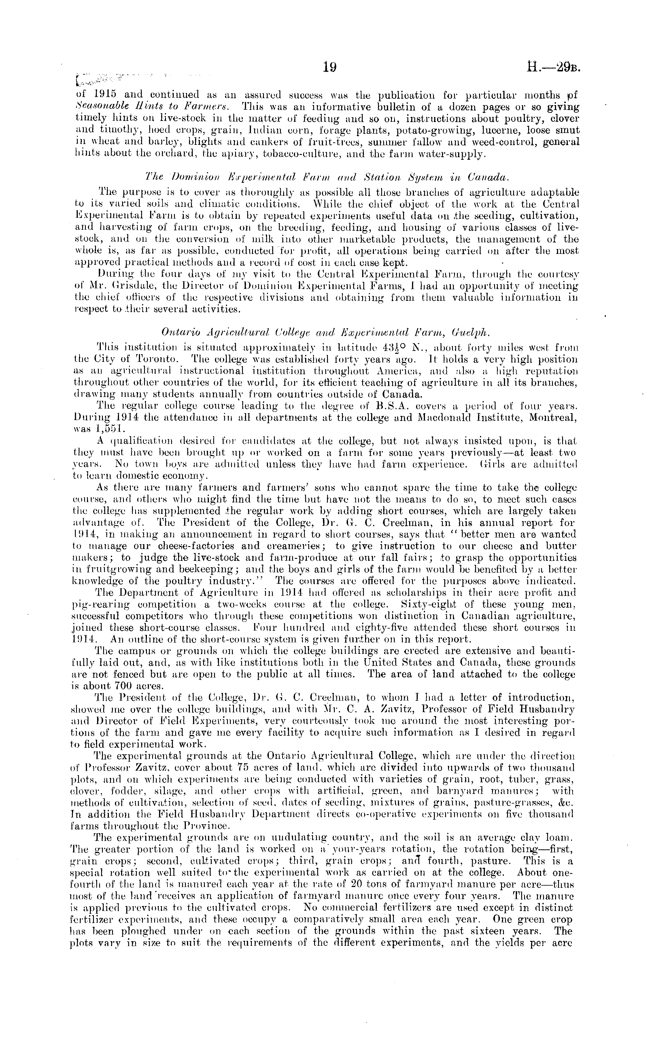 of 1915 and continued as an assured success was the publication for particular months pf Seasonable Hints to Farmers. This was an informative bulletin of a dozen pages or so giving timely hints on live-stock in the matter of feeding and so on, instructions about poultry, clover and timothy, hoed crops, grain, Indian corn, forage plants, potato-growing, lucerne, loose smut in wheat and barley, blights and cankers of fruit-trees, summer fallow and weed-control, general hints about the orchard, the apiary, tobacco-culture, and the farm water-supply. The Dominion Experimental Farm and Station System in Canada. The purpose is to cover as thoroughly its possible all those branches of agriculture adaptable to its varied, soils and climatic conditions. While the chief object, of the work at the Central Experimental Farm is to obtain by repeated experiments useful data on the seeding, cultivation, and harvesting of farm crops, on the breeding, feeding, and housing of various classes of livestock, ami on the conversion of milk into other marketable products, the management of the whole is, as far as possible, conducted for profit, all operations being carried on after the most approved practical methods and a record of cost in each case kept. During the four days of my visit to the Central Experimental Farm, through the courtesy of Mr. Grisdale, the Director of Dominion Experimental Farms, 1 had an opportunity of meeting the chief officers of the respective divisions and obtaining front them valuable information in respect to their several activities. Ontario Agricultural College and Experimental Farm, Cuelph. This institution is situated approximately in latitude 43J,° N., about forty miles wesl from the City of Toronto, lite college was established forty years ago. It holds a very high position as an agricultural instructional institution throughout, America, ami also a high reputation throughout other countries of the world, for its efficient teaching of agriculture in all its branches, drawing many students annually from countries outside of Canada. The regular college course leading to the degree of U.S.A. covers a period of four years. During 1914 the attendance in all departments at the college and Macdonald Institute, Montreal, was 1,551. A. qualification desired for candidates at the college, but not, always insisted upon, is that they must have been brought up or worked on a farm for some years previously —at least two years. No town boys are admitted unless they have bad farm experience. Girls are admitted to learn domestic economy. As there are many farmers and farmers' sons who cannot spare the time to take the college course, and others who might find the time but have not the means to do so, to meet such cases the college has supplemented the regular work by adding short courses, which are largely taken advantage of. The President of the College, Dr. G. C. Creeluitin, in his annual report for 1914, in making an announcement in regard to short courses, says that "better men are wanted to manage our cheese-factories and creameries; to give instruction to our cheese and butter makers; to judge the live-stock and farm-produce at our fall fairs; to grasp the opportunities in fruitgrowing and beekeeping; and the boys and girls of the farm would be benefited by a better knowledge of the poultry industry." The courses are offered for the purposes above indicated. The Department of Agriculture in 1911 had offered as scholarships in their acre profit and pig-rearing competition a two-weeks course at the college. Sixty-eight of these young men, successful competitors who through these competitions won distinction in Canadian agriculture, joined these short-course classes. Four hundred and eighty-five attended these short courses in 1914. An outline of the short-course system is given further on in this report. The campus or grounds on which the" college buildings are erected are extensive and beautifully laid out, and, as with like institutions both in the United. States and Canada, these grounds are not fenced but are open to the public at all times. The area of land attached to the college is about 700 acres. 'The President of the College, Dr. G. C. Creelnian, to whom 1 had a letter of introduction, showed me over the college buildings, ami with Mr. C. A. Zavitz, Professor of Field Husbandry and Director of Field Experiments, very courteously took me around the most interesting portions of the farm and gave me every facility to acquire such information as I desired in regard to field experimental work. lire experimental grounds at the Ontario Agricultural College, which are under the direction of Professor Zavitz, cover about 75 acres of land, which are tlivided into upwards of two thousand plots, and on which experiments are being conducted with varieties of grain, root, tuber, grass, clover, fodder, silage, anil other crops with artificial, green, and barnyard manures; with methods of cultivation, selection of seed, dates of seeding, mixtures of grains, pasture-grasses, <fee. In addition the Field Husbandry Department directs co-operative experiments on five thousand farms throughout the Province. The experimental grounds are on undulating country, and the soil is an average clay loam. The greater portion of the land is worked on a yoiir-ycars rotation, the rotation being —first, grain crops; second, cultivated crops; third, grain crops; and fourth, pasture. This is a special rotation well suited to-the experimental work as carried on at the college. About onefourth of the land is manured each year at the rate of 20 tons of farmyard manure per acre —thus most of the land'receives an application of farmyard manure once every four years. The manure is applied previous to the cultivated crops. No commercial fertilizers are used except in distinct fertilizer experiments, and these occupy a comparatively small area each year. One green crop has been ploughed under on each section of the 