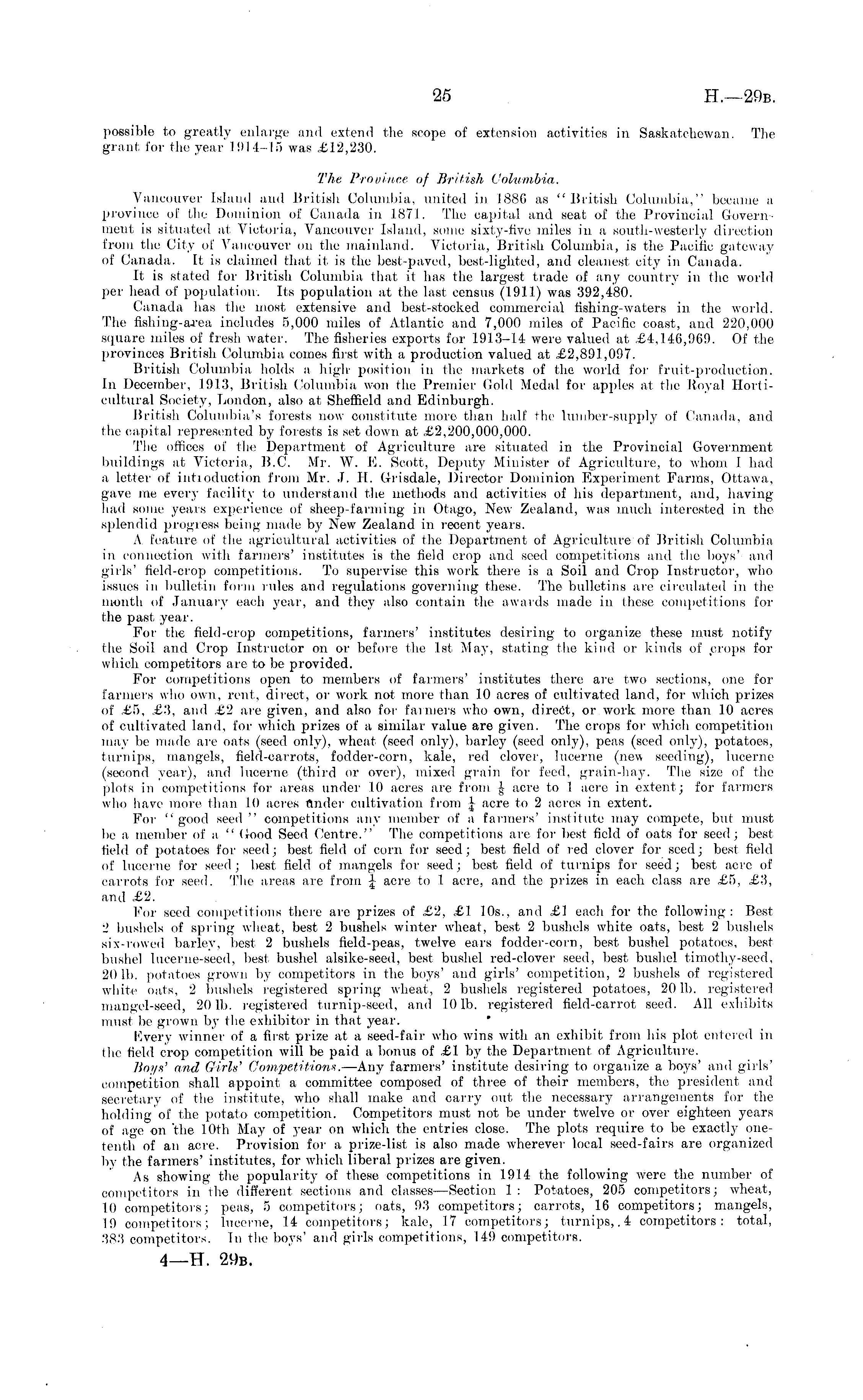 possible to greatly enlarge and extend the scope of extension activities in Saskatchewan. The grant, for the year 1914-15 was £12,230. The Province of British Columbia. Vancouver Island and British Columbia, united in 1880 as "British Columbia," became a province of the Dominion of Canada in 1871. The capital and seat of the Provincial Government is situated at Victoria, Vancouver Island, some sixty-five miles in a south-westerly direction from the City of Vancouver on the mainland. Victoria, British Columbia, is the Pacific gateway of Canada. It is claimed that it is the best-paved, best-lighted, and cleanest city in Canada. It is stated for British Columbia that it has the largest trade of any country in the world per head of population. Its population at the last census (1911) was 392,480. Canada has the most extensive and. best-stocked commercial fishing-waters in the world. The fishing-area includes 5,000 miles of Atlantic and 7,000 miles of Pacific coast, and 220,000 square miles of fresh water. The fisheries exports for 1913-14 were valued at £4,146,969. Of the provinces British Columbia comes first with a production valued at £2,891,097. British Columbia holds a high- position in the markets of the world for fruit-production. In December, 1913, British Columbia won the Premier Gold Medal for apples at the Royal Horticultural Society, London, also at Sheffield and Edinburgh. British Columbia's forests now constitute more than half the lumber-supply of Canada, and the capital represented by forests is set down at £2,200,000,000. The offices of the Department, of Agriculture are situated in the Provincial Government buildings at Victoria, B.C. Mr. W. E. Scott, Deputy Minister of Agriculture, to whom 1 hail a letter of intioduction from Mr. J. 11. Grisdale, Director Dominion Experiment Farms, Ottawa, gave me ever}- facility to understand the methods and activities of his department, and, having had some years experience of sheep-farming in Otago, New Zealand, was much interested in the splendid progress being made by New Zealand in recent, years. A feature of the agricultural activities of the Department of Agriculture of British Columbia in connection with farmers' institutes is the field crop and seed competitions and the boys' and girls' field-crop competitions. To supervise this work there is a Soil and Crop Instructor, who issues in bulletin form rules and regulations governing these. The bulletins are circulated in the month of January each year, and they also contain the awards made in these competitions for the past year. For the field-crop competitions, farmers' institutes desiring to organize these must notify the Soil and Crop Instructor on or before the Ist, May, stating the kind or kinds of props for which competitors are to be provided. For competitions open to members of farmers' institutes there are two sections, one for farmers who own, rent, direct, or work not more than 10 acres of cultivated land, for which prizes of £5, £3, and £2 are given, and also for farmers who own, direct, or work more than 10 acres of cultivated land, for which prizes of a similar value are given. The crops for which competition may be made are oats (seed only), wheat (seed only), barley (seed only), peas (seed only), potatoes, turnips, mangels, field-carrots, fodder-corn, kale, red clover, lucerne (new seeding), lucerne (second year), and lucerne (third or over), mixed grain for feed, grain-hay. The size of the plots in competitions for areas under 10 acres are from | acre to I acre in extent; for farmers who have more than 10 acres finder cultivation from | acre to 2 acres in extent. For "good seed" competitions any member of a farmers' institute may compete, but must be a member of a " Good Seed Centre." The competitions are for best field of oats for seed; best field of potatoes for seed; best field of corn for seed; best field of red clover for seed; best field of lucerne for seed; best field of mangels for seed; best field of turnips for seed; best acre of carrots for seed. The areas are from \ acre to 1. acre, and the prizes in each class are £5, £3, and £2. For seed competitions there are prizes of £2, £1 10s., and £.1 each for the following: Best 2 bushels of spring wheat, best 2 bushels winter wheat, best 2 bushels white oats, best 2 bushels six-rowed barley, best, 2 bushels field-peas, twelve ears fodder-corn, best bushel potatoes, best bushel lucerne-seed, best bushel alsike-seed, best bushel red-clover seed, best bushel timothy-seed, 20 Ib. potatoes grown by competitors in the boys' and girls' competition, 2 bushels of registered white oats, 2 bushels registered spring wheat, 2 bushels registered potatoes, 201b. registered mangel-seed, 20 Ib. registered turnip-seed, and 101b. registered field-carrot seed. All exhibits must be grown by the exhibitor in that year. Every winner of a first prize at a seed-fair who wins with an exhibit from his plot, entered in the field crop competition will be paid a bonus of £1 by the Department of Agriculture. Boys' and Girls' Competitions. —Arty farmers' institute desiring to organize a boys' and girls' competition shall appoint, a committee composed of three of their members, the president, and secretary of the institute, who shall make and carry out, the necessary arrangements for the holding of the potato competition. Competitors must not be under twelve or over eighteen years of age on the 10th May of year on which the entries close. The plots require to be exactly onetenth of an acre. Provision for a prize-list is also made wherever local seed-fairs are organized by the farmers' institutes, for which liberal prizes are given. As showing the popularity of these competitions in 1914 the following were the number of competitors in the different sections and classes —Section 1: Potatoes, 205 competitors; wheat, 10 competitors; peas, 5 competitors; oats, 93 competitors; carrots, 16 competitors; mangels, 19 competitors; lucern