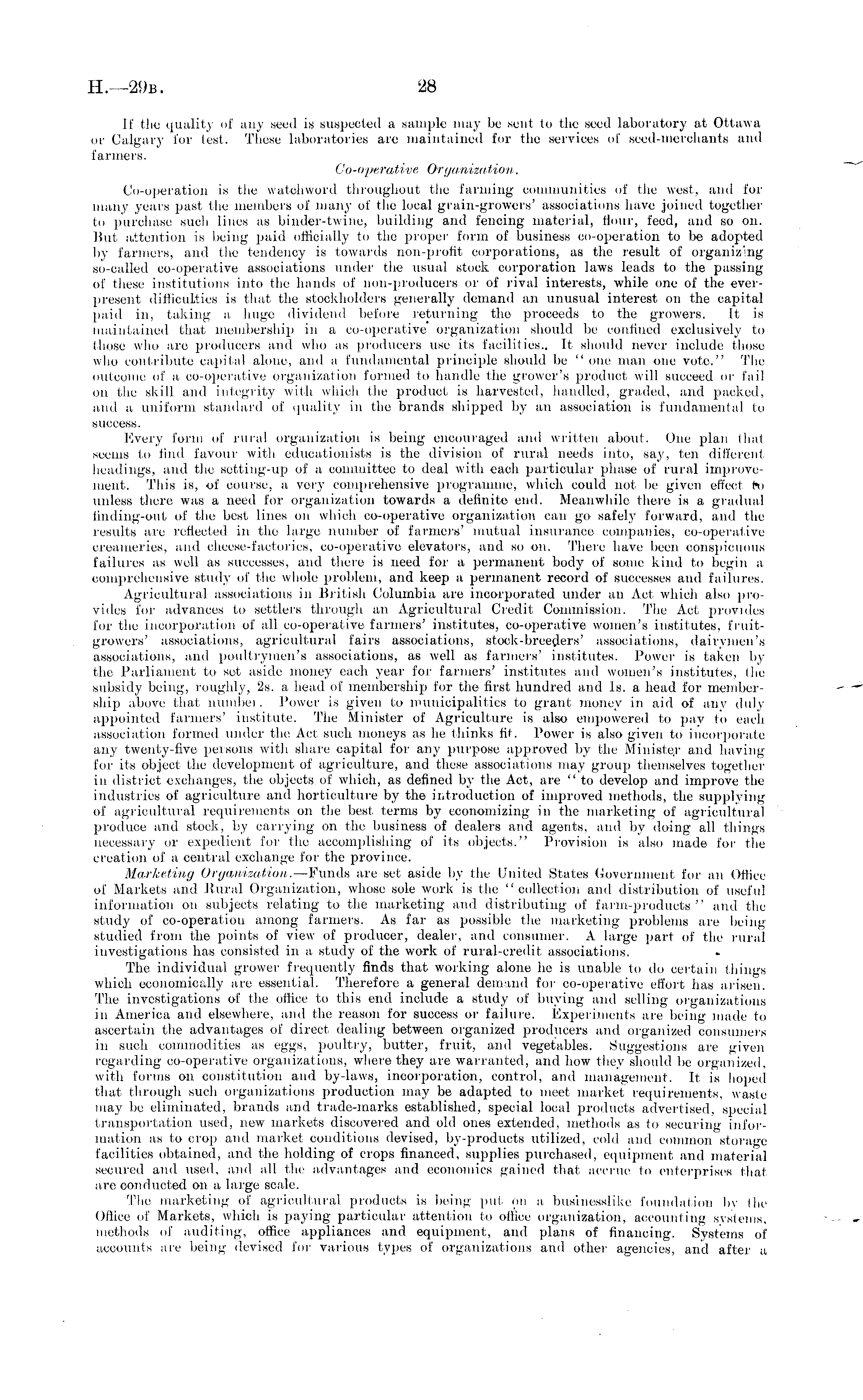 If the quality of any seed is suspected a sample may be sent to the seed laboratory at Ottawa or Calgary for lest. These laboratories are maintained for the services of seed-merchants and farmers. Go-operative Organization. Co-operation is the watchword throughout the farming communities of the west, and for many years past the members of many of the local grain-growers' associations have joined together to purchase such lines as binder-twine, building and fencing material, flour, feed, and so on. But attention is being paid officially to the proper form of business co-operation to be adopted by farmers, and the tendency is towards non-profit corporations, as the result of organizing so-called co-operative associations under the usual stock corporation laws leads to the passing of these institutions into the hands of non-producers or of rival interests, while one of the everpresent difficulties is that the stockholders generally demand an unusual interest on the capital paid in, taking it, huge dividend before returning the proceeds to the growers. It is maintained that membership in a co-operative organization should be confined exclusively to those who are producers and who as producers use its facilities.. It should never include those who contribute capital alone, ami a fundamental principle should be " one man one vote." The outcome of a co-operative organization formed to handle the grower's product will succeed or fail on the skill and integrity with which flic product is harvested, handled, graded, and packed, and a uniform standard of quality in the brands shipped by an association is fundamental to success. Every form of rural organization is being encouraged and written about. One plan that seems to find favour with educationists is the division of rural needs into, say, ten different headings, and the setting-up of a committee to deal with each particular phase of rural improvement, This is, of course, a very comprehensive programme, which could not be given effect hi unless there was a need for organization towards a definite end. Meanwhile there is a gradual finding-out of the best lines on which co-operative organization can go safely forward, and the results are reflected in the large number of farmers' mutual insurance companies, co-operative creameries, and cheese-factories, co-operative elevators, and so on. There have been conspicuous failures as well as successes, and there is need for a permanent body of some kind lo begin a comprehensive study of the whole problem, and keep a permanent record of successes and failures. Agricultural associations in British Columbia are incorporated under an Act which also provides for advances to settlers through an Agricultural Credit Commission. The Act provides for the incorporation of all co-operative farmers' institutes, co-operative women's institutes, fruitgrowers' associations, agricultural fairs associations, stock-breeders' associations, dairymen's associations, and poultrymen's associations, as well as farmers' institutes. Power is taken by the Parliament to set aside money each year for farmers' institutes and women's institutes, the subsidy being, roughly, 2s. a head of membership for the first hundred and Is. a head for membership above that number. Power is given to municipalities to grant money in aid of any duly appointed farmers' institute. The Minister of Agriculture is also empowered to pay lo each association formed under the Act such moneys as he thinks fit. Power is also given to incorporate any twenty-five persons with share capital for any purpose approved by the Minister and having for its object the development of agriculture, and these associations may group themselves together in district exchanges, the objects of which, as defined by the Act, are " to develop and improve the industries of agriculture and horticulture by the introduction of improved methods, the supplying of agricultural requirements on the best terms by economizing in the marketing of agricultural produce and stock, by carrying on the business of dealers and agents, and by doing all things necessary or expedient for the accomplishing of its objects." Provision is also made for the creation of a central exchange for the province. Marketing Organization. —Funds are set aside by the United States Government for an Office of Markets and Rural Organization, whose sole work is the "collection and distribution of useful information on subjects relating to the marketing and distributing of farm-products" and the study of co-operatiou among farmers. As far as possible the marketing problems are being studied from the points of view of producer, dealer, and consumer. A. large part of the rural investigations has consisted in a study of the work of rural-credit associations. The individual grower frequently finds that working alone ho is unable to do certain things which economically are essential. Therefore a general demand for co-operative effort has arisen. The investigations of the office to this end include a study of buying and selling organizations in America and elsewhere, and the reason for success or failure. Experiments tire being made to ascertain the advantages of direct dealing between organized producers and organized consumers in such commodities as eggs, poultry, butter, fruit, and vegetables. Suggestions are given regarding co-operative organizations, where they are warranted, and how they should be organized, with forms on constitution and by-laws, incorporation, control, and management. It is hoped that through such organizations production may be adapted to meet market requirements, waste may be eliminated, brands and trade-marks established, special local products advertised, special transportation used, new markets discovered and old ones extended, methods as to securing information as to crop and market conditions devised, by-products utilized, cold and common storage facilities obtained, and the holding of crops financed