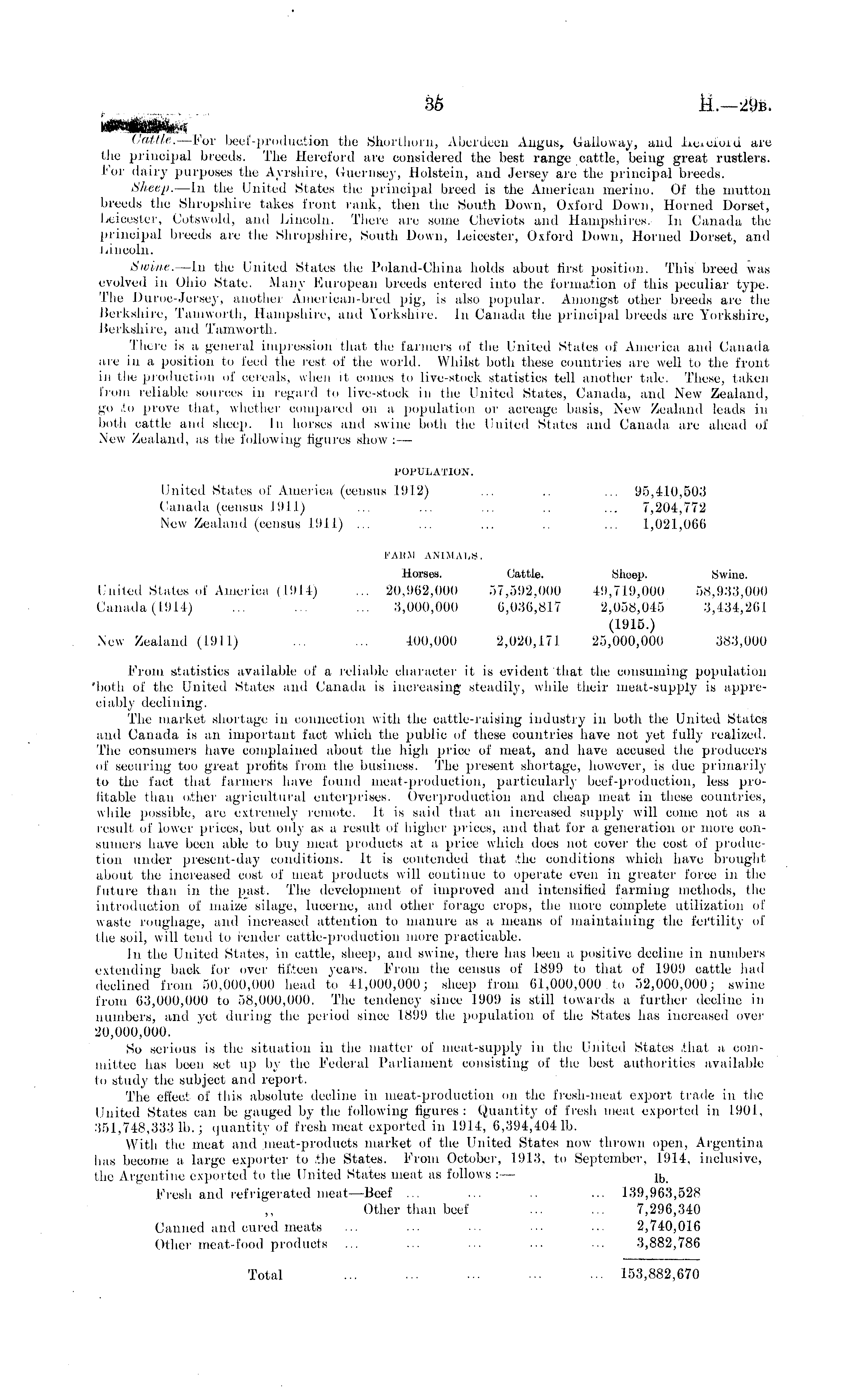 Cattle. —For beef-production the Shorthorn, Aberdeen Angus, Galloway, and i-Lccturd are the principal breeds. The Hereford are considered the best, range cattle, being great rustlers, for dairy purposes the Ayrshire, Guernsey, Holstein, and Jersey are the principal breeds. Sheep. —ln the United States the principal breed is the American merino. Of the mutton breeds the Shropshire takes front rank, then the South Down, Oxford Down, Horned Dorset, Leicester, Cotswold, and Lincoln. There are some Cheviots and Hampshires. In Canada the principal breeds are the Shropshire, South Down, Leicester, Oxford Down, Horned Dorset, and Lincoln. Swine. —ln the United States the Poland-China holds about first position. This breed was evolved in Ohio State. Many European breeds entered into the formation of this peculiar type. The Duroo-Jersey, another American-bred pig, is also popular. Amongst other breeds are the Berkshire, Tamworth, Hampshire, and Yorkshire. In Canada the principal breeds arc Yorkshire, Berkshire, and Tamworth. There is a general impression that the farmers of the United States of America and Canada are in a position to feed the rest of the world. Whilst both these countries are well to the front in the production of cereals, when it comes to five-stock statistics tell another tale. These, taken from reliable sources in regard to live-stock in the United States, Canada, and New Zealand, go to prove that, whether compared on a population or acreage basis, New Zealand leads in both cattle and sheep. In horses and swine both the United States and Canada are ahead of New Zealand, as the following figures show : — POPULATION. United States of America (census 1912) .. ... 95,410,503 Canada (census .191.1) ... ... ... .. ... 7,204,772 New Zealand (census' 191 I) ... ... ... ... 1,021,066 FAKM ANIMALS. Horses. Cattle. Sheep. Swine. United States of America ( 191 I) ... 20,962,000 57,592,000 49,719,000 58,933,000 Canada (1.914) ... ... ... 3,000,000 6,036,817 2,058,045 3,434,261 (1915.) New Zealand (191 1) ... 100,000 2,020,171 25,000,000 383,000 From statistics available of a reliable character it. is evident, that the consuming population 'both of the United States and Canada is increasing steadily, while their meat-supply is appreciably declining. The market shortage in connection with the cattle-raising industry in both the United States and Canada is an important fact which the public of these countries have not yet full)- realized. Tlie consumers have complained about the high price of meat, and have accused the producers of securing too great profits from the business. The present shortage, however, is due primarily to the fact that farmers have found meat-production, particularly beef-production, less profitable than other agricultural enterprises. Overproduction and cheap) meat in these countries, while possible, are extremely remote. It is said that an increased supply will come not as a result of lower prices, but only as a result of higher prices, and that for a generation or more consumers have been able to buy meat products at a price which does not cover the cost of production under present-day conditions. It is contended that the conditions which have brought about the increased cost of meat products will continue to operate even in greater force in the future than in the past. The development of improved and intensified farming methods, the introduction of maize silage, lucerne, and other forage crops, the more complete utilization of waste roughage, and increased attention to manure as a means of maintaining the fertility of the soil, will tend to render cattle-production more practicable. In the United States, in cattle, sheep, and swine, there has been a positive decline in numbers extending back for over fifteen years. From the census of 1899 to that of 1909 cattle had declined from 50,000,000 head to 11,000,000; sheep from 61,000,000 to 52,000,000; swine from 63,000,000 to 58,000,000. The tendency since 1909 is still towards a further decline in numbers, and yet during the period since 1899 the population of the States lias increased over 20,000,000. So serious is the situation in the matter of meal-supply in tin. 1 United States that a committee has been set, up by the Federal Parliament consisting of the best authorities available to study the subject and report. The effect of this absolute decline in meat-production on the fresh-meat export, trade in. the United States can be gauged by the following figures: Quantity of fresh meat exported in 1901, 351,748,333 Ib.; quantity of fresh meat exported in 1.914, 6,394,4041b. With the meat and meat-products market of the United States now tin-own open, Argentina has become a large exporter to the States. From October, 1913, to September, 1914, inclusive, the Argentine exported to the United States meat as follows : — j b Fresh and refrigerated-meat —Beef ... ... .. ... 139,963,528 Other than beef ... ... 7,296,340 Canned and cured meats ... ... ... ■■■ ... 2,740,016 Other meat-food products ... ... ... ... ... 3,882,786 Total ... ... ... ... ... 153,882,670