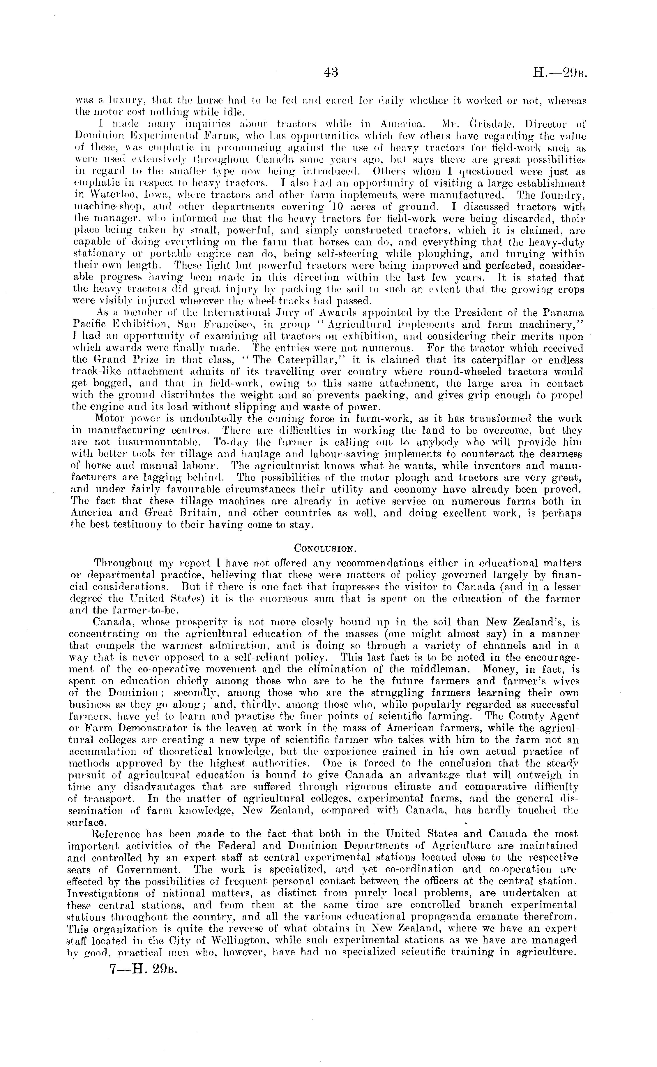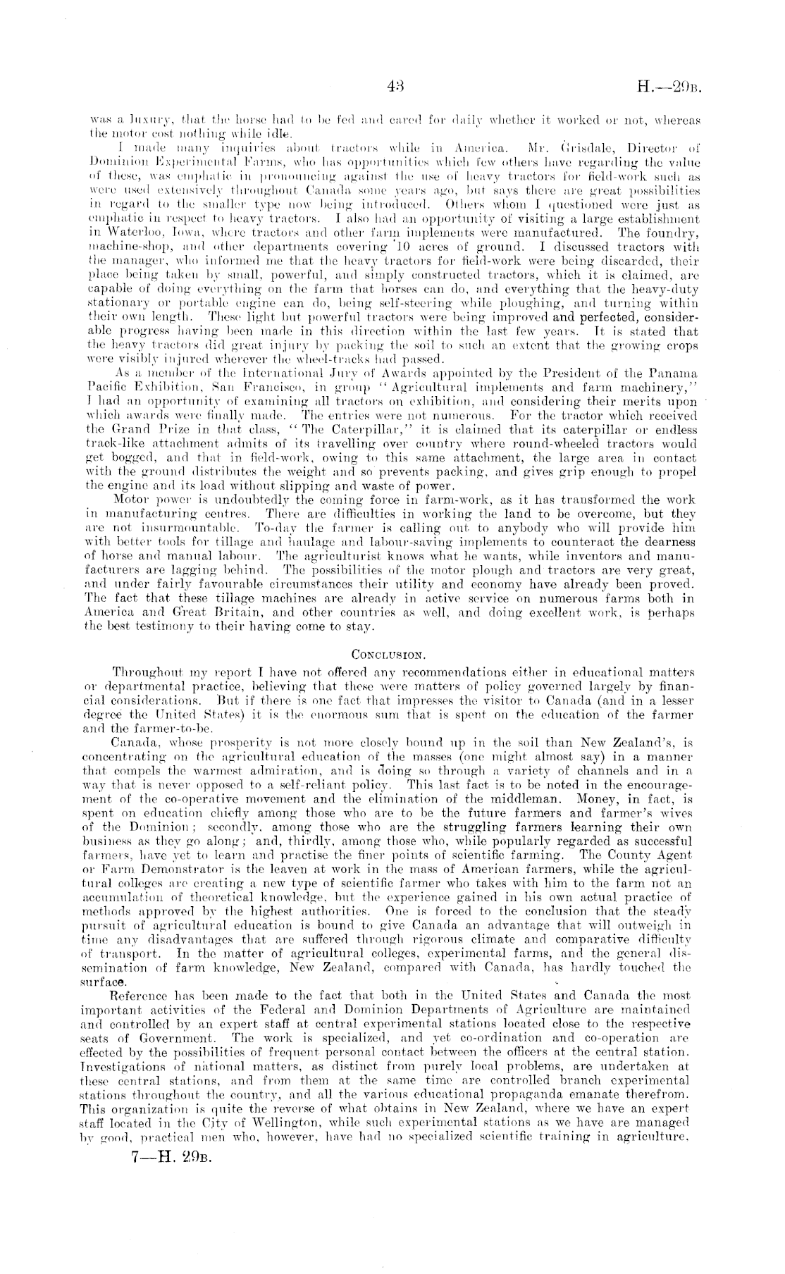 was a luxury, that the horse had to be fed and cared for daily whether it, worked or not, whereas the motor cost nothing while idle. 1 made many inquiries about tractors while in America. Mr. Grisdale, Director of Dominion Experimental Farms, who has opportunities which few others have regarding the value of these, was emphatic in pronouncing against the use of heavy tractors for field-work such as were used extensively throughout Canada some years ago, but says there are great possibilities in regard to the smaller type now being introduced. Others whom 1 questioned were just as emphatic in respect to heavy tractors. I also had an opportunity of visiting a large establishment in Waterloo, lowa, where tractors and other farm implements were manufactured. The foundry, machine-shop, and other departments covering 10 acres of ground. I discussed tractors with the manager, who informed me that the heavy tractors for field-work were being discarded, their place being taken by small, powerful, and simply constructed tractors, which it is claimed, arc capable of doing everything on the farm that horses can do, and everything that the heavy-duty stationary or portable engine can do, being self-steering while ploughing, and turning within their own length. These light but powerful tractors were being improved and perfected, considerable progress having been made in this direction within the last, few years. It is stated that the heavy tractors did great injury by packing the soil to such an extent that the growing crops were visibly injured wherever the wheel-tracks had passed. As a member of the International Jury of Awards appointed by the President of the Panama Pacific Exhibition, San Francisco, in group " Agricultural implements and farm machinery," 1 had an opportunity of examining all traotors on exhibition, and considering their merits upon which awards were finally made. The entries were not numerous. For the tractor which received the Grand Prize in that class, " The Caterpillar," it is claimed that its caterpillar or endless track-like attachment admits of its travelling over country where round-wheeled tractors would get bogged, and that in field-work, owing to this same attachment, the large area in contact with the ground distributes the weight and so prevents packing, and gives grip enough to propel the engine and its load without slipping and waste of power. Motor power is undoubtedly the coming force in farm-work, as it has transformed the work in manufacturing centres. There are difficulties in working the land to be overcome, but they are not insurmountable. To-day the farmer is calling out to anybody who will provide him with better tools for tillage and haulage and labour-saving implements to counteract the dearness of horse and manual labour. The agriculturist knows what he wants, while inventors and manufacturers are lagging behind. The possibilities of the motor plough and tractors are very great, and under fairly favourable circumstances their utility and economy have already been proved. The fact that these tillage machines are already in active service on numerous farms both in America and Great, Britain, and other countries as well, and doing excellent work, is perhaps the best, testimony to their having come to stay. Conclusion. Throughout, my report I have not offered any recommendations either in educational matters oi- departmental practice, believing that these were matters of policy governed largely by financial considerations. But if there is one fact that impresses the visitor to Canada (and in a lesser degree the United States) it is the enormous sum that is spent on the education of the farmer and the farmer-to-be. Canada, whose prosperity is not, more closely bound up in the soil than. New Zealand's, is concentrating on the agricultural education of the masses (one might almost say) in a manner that compels the warmest admiration, and is doing so through a variet)' of channels and in a way that, is never opposed to a self-reliant policy. This last, fact is to be noted in the encouragement of the co-operative movement and the elimination of the middleman. Money, in fact, is spent, on education chiefly among those who are to be the future farmers and farmer's wives of the Dominion ; secondly, among those who are the struggling farmers learning their own business as they go along; and, thirdly, among those who, while popularly regarded as successful farmers, have yet to learn and practise the finer points of scientific farming. The County Agent or Farm Demonstrator is the leaven at work in the mass of American farmers, while the agricultural colleges are creating a new type of scientific farmer who takes with him to the farm not an accumulation of theoretical knowledge, but (he experience gained in his own actual practice of methods approved by the highest authorities. One is forced to the conclusion that the steady pursuit of agricultural education is bound to give Canada an advantage that will outweigh in time any disadvantages that are suffered through rigorous climate and comparative difficulty of transport. In the matter of agricultural colleges, experimental farms, and the general dissemination of farm knowledge, New Zealand, compared with Canada, has hardly touched the surface. Reference has been made to the fact that both in the United States and Canada the most important activities of the Federal and Dominion Departments of Agriculture are maintained and controlled by an expert staff at, central experimental stations located close to the respective seats of Government. The work is specialized, and yet co-ordination and co-operation are effected by the possibilities of frequent personal contact between the officers at the central station. Investigations of national matters, as distinct from purely local problems, are undertaken at these central stations, and from them at the same time are controlled branch experimental stations throughout the country, a