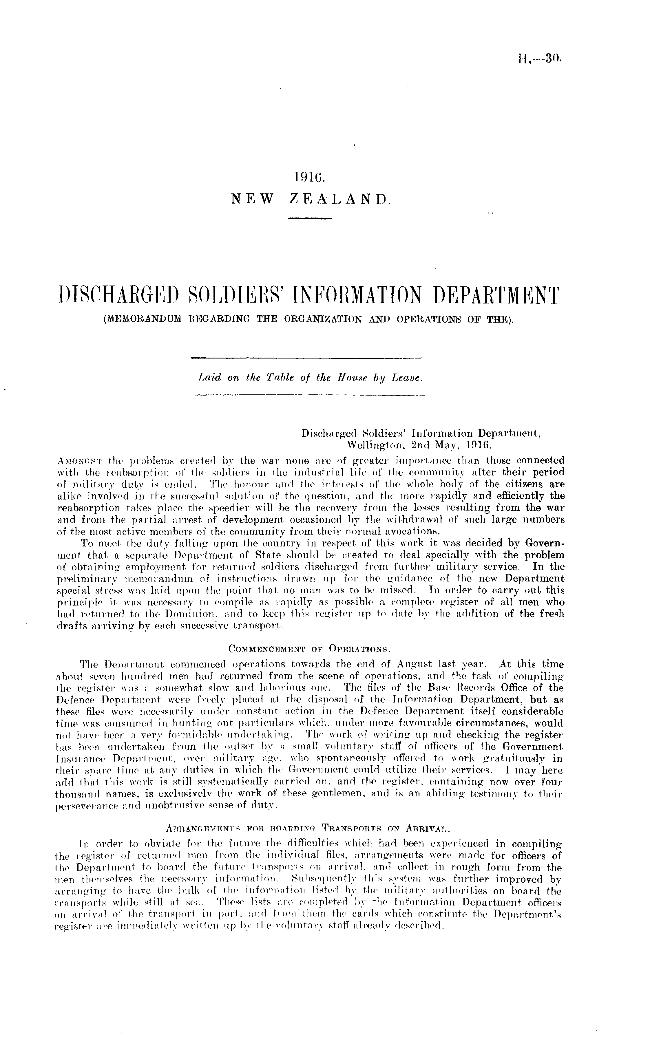 Discharged Soldiers' Information Department, Wellington, 2nd May, 1916. Amongst the problems created by the war none are of greater importance than those connected with the reabsorption of the soldiers in the industrial life of the community after their period of military duty is ended. The honour and the interests of the whole body of the citizens are alike involved in the successful solution of the question, and the more rapidly and efficiently the reabsorption takes place the speedier will be the recovery from the losses resulting from the war and from the partial arrest of development occasioned by the withdrawal of such large numbers of the most active members of the community from their normal avocations. To meet the duty falling upon the country in respect of this work it. was decided by Government that a separate Department of State should be created to deal specially with the problem of obtaining employment for returned soldiers discharged from further military service. In the preliminary memorandum of instructions drawn up for the guidance of the new Department special stress was laid upon the point that no man was to be missed. Tn order to carry out this principle it was necessary to compile as rapidly as possible a complete register of all men who had returned to the Dominion, and to keep this register up to date by the addition of the fresh drafts arriving by each successive transport. Commencement op Operations. The Department commenced operations towards the end of August last year. At this time about seven hundred men had returned from the scene of operations, and the task of compiling the register was a somewhat slow and laborious one. The files of the Base Records Office of the Defence Department were freely placed at the disposal of the Information Department, but as these files wore necessarily under constant action in the Defence Department itself considerable time was consumed in hunting out particulars which, under more favourable circumstances, would not have been a very formidable undertaking. The work of writing up and checking the register has been undertaken from the outset by a small voluntary staff of officers of the Government Insurance Department, over military age, who spontaneously offered to work gratuitously in their spare time at any duties in which the Government could utilize their services. I may here add that this work is still systematically carried on. and the register, containing now over four thousand names, is exclusively the work of these gentlemen, and is an abiding testimony to their perseverance and unobtrusive sense of duty. Arrangements for boarding Transports on Arrival. In order to obviate for the future the difficulties which had been experienced in compiling the register of returned men from the individual files, arrangements were made for officers of the Department to board the future transports on arrival, and collect in rough form from the men themselves the necessary information. Subsequently this system was further improved by arranging to have the bulk of the information listed by the military authorities on board the transports while still at sea. These lists are completed by the Information Department officers on arrival of the transport in port, and from them the cards which constitute the Department's register are immediately written up by the voluntary staff already described.