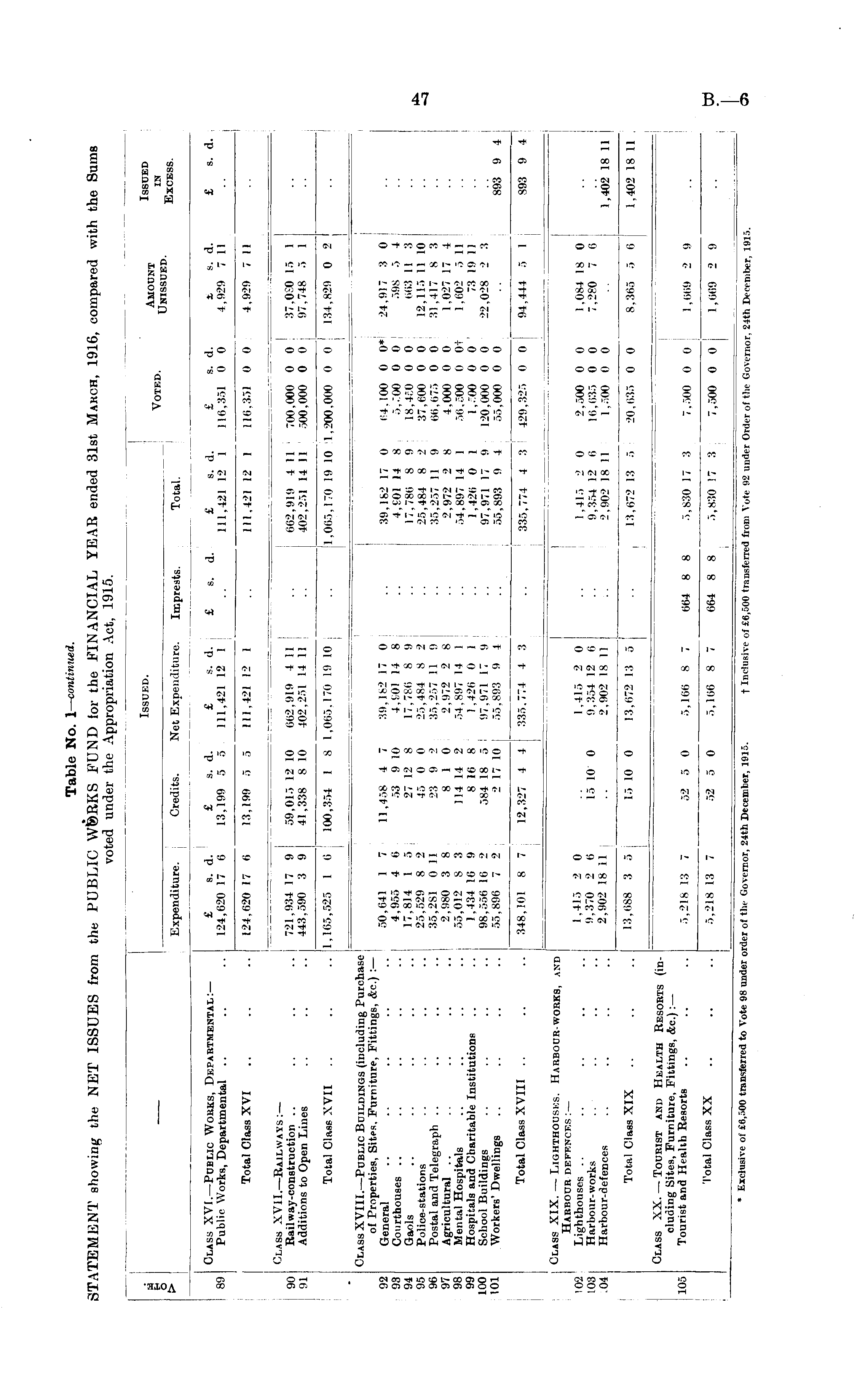 Table No. 1— continued. STATEMENT showing the NET ISSUES from the PUBLIC WORKS FUND for the FINANCIAL YEAR ended 31st March, 1916, compared with the Sums voted under the Appropriation Act, 1915.