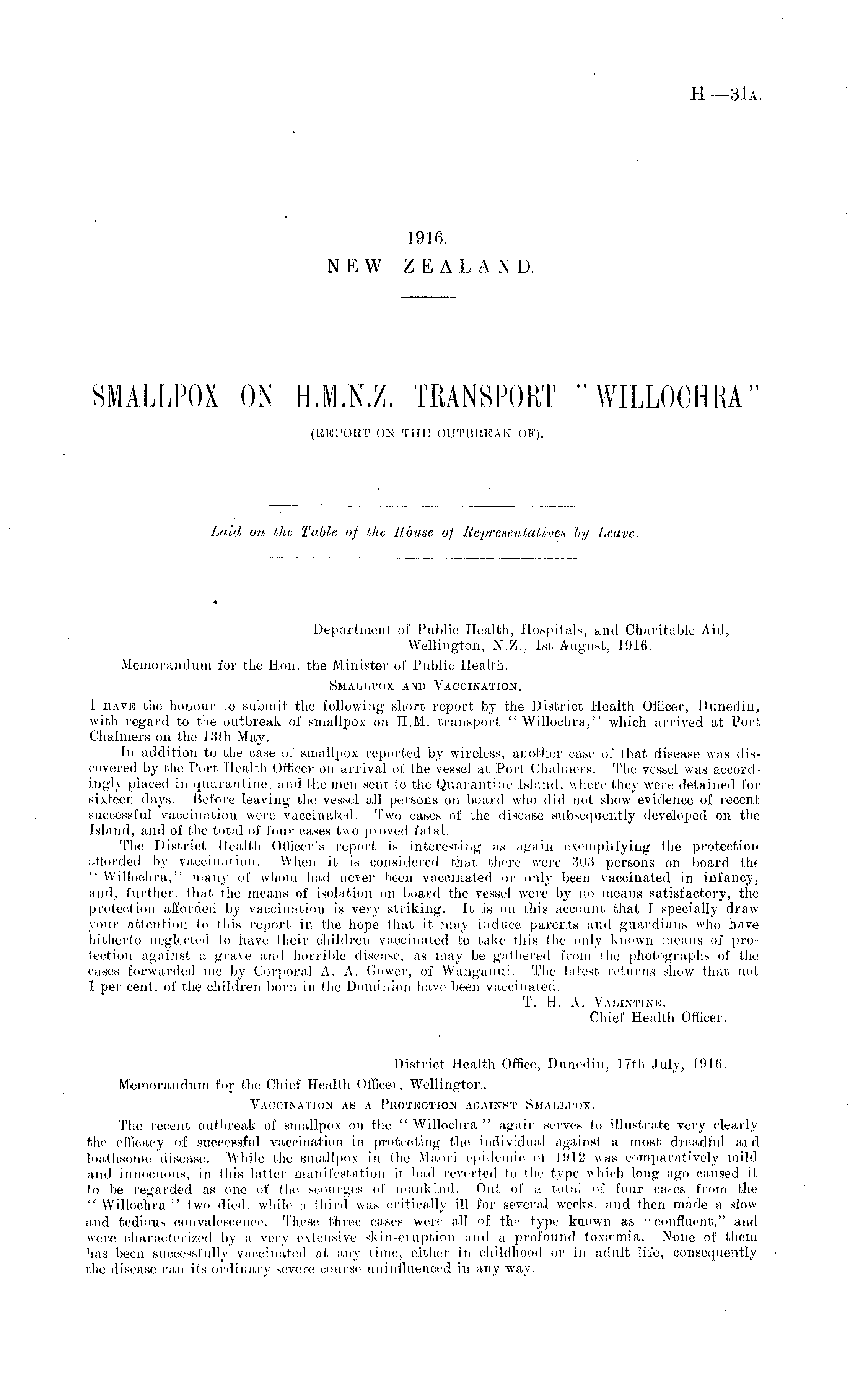 Department of Public Health, Hospitals, and Charitable Aid, Wellington, N.Z., Ist August, .1.916. Memorandum for the Hon. the Minister of Public Health. Smallpox and Vaccination. 1 i.iavk the honour to submit the following short report by the District Health Officer, Dunedin, with regard to the outbreak of smallpox on H.M. transport " Willoclira," which arrived at Port Chalmers on the 13th May. In addition to the case of smallpox reported by wireless, another case of that disease was discovered by the Port Health Officer on arrival of the vessel at Port Chalmers. The vessel was accordingly placed in quarantine, and the men sent to the Quarantine Island, where they were detained for sixteen days. Before leaving the vessel all persons on board who did not show evidence of recent successful vaccination were vaccinated. Two cases of the disease subsequently developed on the Island, and of the total of four cases two proved fatal. The District Health Officer's report is interesting as again exemplifying the protection afforded by vaccination. When it is considered that there were 303 persons on board the "Willoclira," many of whom had never been vaccinated or only been vaccinated in infancy, and, further, that the means of isolation on board the vessel were by no means satisfactory, the protection afforded by vaccination is very striking. It is on this account that 1 specially draw your attention to this report in the hope that it may induce parents and guardians who have hitherto neglected to have their children vaccinated to take this the only known means of protection against a grave and horrible disease, as may be gathered from the photographs of the cases forwarded me by Corporal A. A. (lower, of Wanganui. The latest returns show that not 1 per cent, of the children born in the Dominion have been vaccinated. T. 11. A. Valintine, Chief Health Officer.