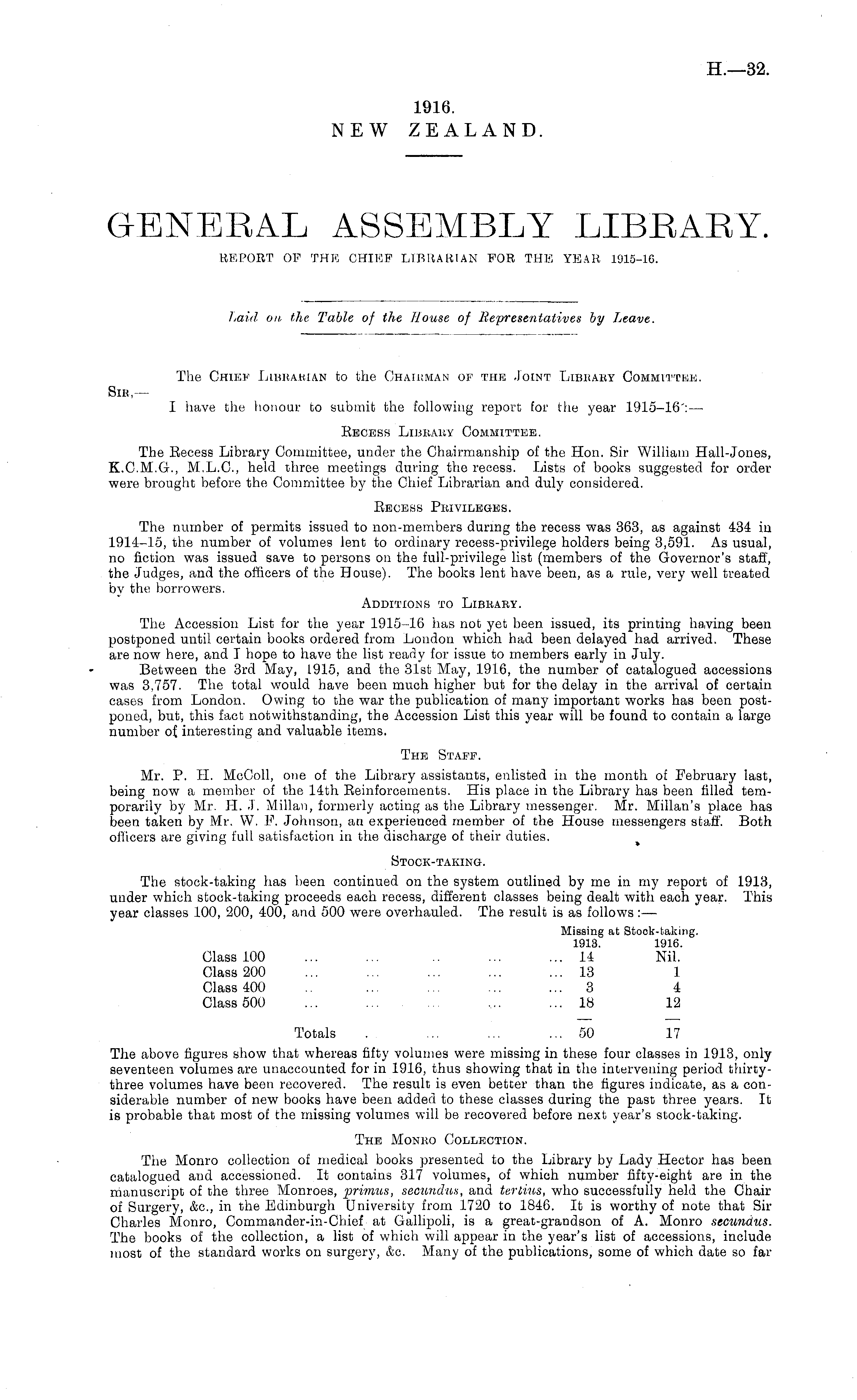 The Chief Libkahlan to the Chairman of the Joint Library Committee. Bra,— I have the honour to submit the following report for the year 1915-16:— Recess Library Committee. The Recess Library Committee, under the Chairmanship of the Hon. Sir William Hall-Jones, K.C.M.G., M.L.C., held three meetings during the recess. Lists of books suggested for order were brought before the Committee by the Chief Librarian and duly considered. Recess Privileges. The number of permits issued to non-members during the recess was 363, as against 434 in 1914-15, the number of volumes lent to ordinary recess-privilege holders being 3,591. As usual, no fiction was issued save to persons on the full-privilege list (members of the Governor's staff, the Judges, and the officers of the House). The books lent have been, as a rule, very well treated by the borrowers. Additions to Library. The Accession List for the year 1915-16 has not yet been issued, its printing ha.ving been postponed until certain books ordered from London which had been delayed had arrived. These are now here, and I hope to have the list ready for issue to members early in July. Between the 3rd May, 1915, and the 31st May, 1916, the number of catalogued accessions was 3,757. The total would have been much higher but for the delay in the arrival of certain cases from London. Owing to the war the publication of many important works has been postponed, but, this fact notwithstanding, the Accession List this year will be found to contain a large number of interesting and valuable items. The Staff. Mr. P. 11. McColl, one of the Library assistants, enlisted in the month of February last, being now a member of the 14th Reinforcements. His place in the Library has been filled temporarily by Mr. H. J. Millan, formerly acting as the Library messenger. Mr. Millan's place has been taken by Mr. W. F. Johnson, an experienced member of the House messengers staff. Both officers are giving full satisfaction in the discharge of their duties. Stock-taking. The stock-taking has been continued on the system outlined by me in my report of 1913, under which stock-taking proceeds each recess, different classes being dealt with each year. This year classes 100, 200, 400, and 500 were overhauled. The result is as follows : — Missing at Stock-taking. 1913. 1916. Class 100 ... ... .. ... ... 14 Nil. Class 200 ... ... ... ... ... 18 1 Class 400 .. ... ... ... ... 8 4 Class 500 ... ... ... .... ... 18 12 Totals . . ... ... ... 50 17 The above figures show that whereas fifty volumes were missing in these four classes in 1913, only seventeen volumes are unaccounted for in 1916, thus showing that in the intervening period thirtythree volumes have been recovered. The result is even better than the figures indicate, as a considerable number of new books have been added to these classes during the past three years. It is probable that most of the missing volumes will be recovered before next year's stock-taking. The Monro Collection. The Monro collection of medical books presented to the Library by Lady Hector has been catalogued and accessioned. It contains 317 volumes, of which number fifty-eight are in the manuscript of the three Monroes, primus, secundus, and tertins, who successfully held the Chair of Surgery, &c, in the Edinburgh University from 1720 to 1846. It is worthy of note that Sir Charles Monro, Commander-in-Chief at Gallipoli, is a great-grandson of A. Monro secundus. The books of the collection, a list of which will appear in the year's list of accessions, include most of the standard works on surgery, &c. Many of the publications, some of which date so far