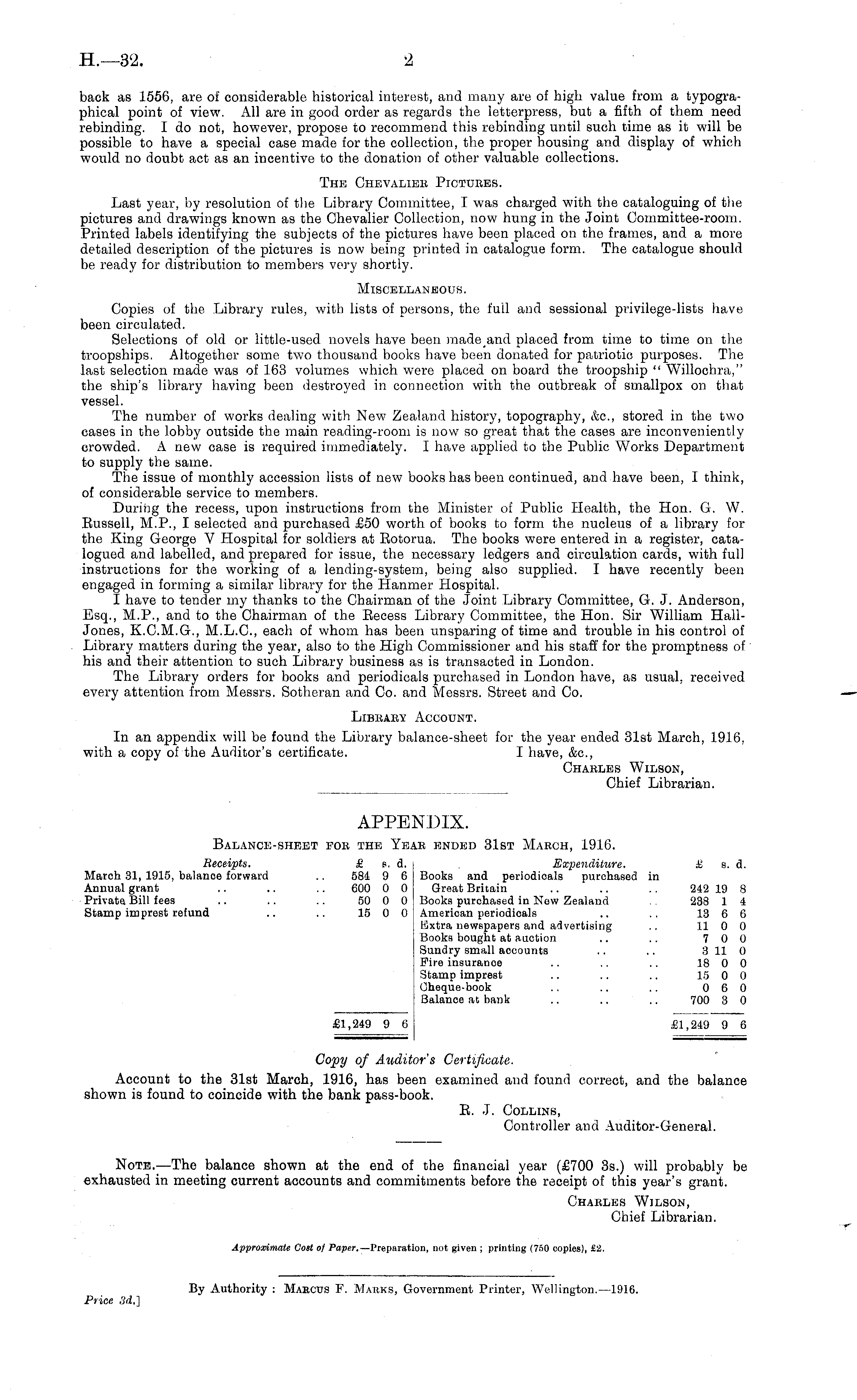 back as 1556, are of considerable historical interest, and many are of high value from a typographical point of view. All are in good order as regards the letterpress, but a fifth of them need rebinding. I do not, however, propose to recommend this rebinding until such time as it will be possible to have a special case made for the collection, the proper housing and display of which would no doubt act as an incentive to the donation of other valuable collections. The Chevalier Pictures. Last year, by resolution of the Library Committee, I was charged with the cataloguing of the pictures and drawings known as the Chevalier Collection, now hung in the Joint Committee-room. Printed labels identifying the subjects of the pictures have been placed on the frames, and a more detailed description of the pictures is now being printed in catalogue form. The catalogue should be ready for distribution to members very shortly. Miscellaneous. Copies of the Library rules, with lists of persons, the full and sessional privilege-lists have been circulated. Selections of old or little-used novels have been made and placed from time to time on the troopships. Altogether some two thousand books have been donated for patriotic purposes. The last selection made was of 163 volumes which were placed on board the troopship " Willochra," the ship's library having been destroyed in connection with the outbreak of smallpox on that vessel. The number of works dealing with New Zealand history, topography, &c, stored in the two cases in the lobby outside the main reading-room is now so great that the cases are inconveniently crowded. A new case is required immediately. I have applied to the Public Works Department to supply the same. The issue of monthly accession lists of new books has been continued, and have been, I think, of considerable service to members. During the recess, upon instructions from the Minister of Public Health, the Hon. G. W. Russell, M.P., I selected and purchased £50 worth of books to form the nucleus of a library for the King George V Hospital for soldiers at Rotorua. The books were entered in a register, catalogued and labelled, and prepared for issue, the necessary ledgers and circulation cards, with full instructions for the working of a lending-system, being also supplied. I have recently been engaged in forming a similar library for the Hanmer Hospital. I have to tender my thanks to the Chairman of the Joint Library Committee, G. J. Anderson, Esq., M.P., and to the Chairman of the Recess Library Committee, the Hon. Sir William HallJones, K.C.M.G., M.L.C., each of whom has been unsparing of time and trouble in his control of Library matters during the year, also to the High Commissioner and his staff for the promptness of his and their attention to such Library business as is transacted in London. The Library orders for books and periodicals purchased in London have, as usual, received every attention from Messrs. Sotheran and Co. and Messrs. Street and Co. Library Account. In an appendix will be found the Library balance-sheet for the year ended 31st March, 1916, with, a copy of the Auditor's certificate. I have, &c, Charles Wilson, Chief Librarian.
