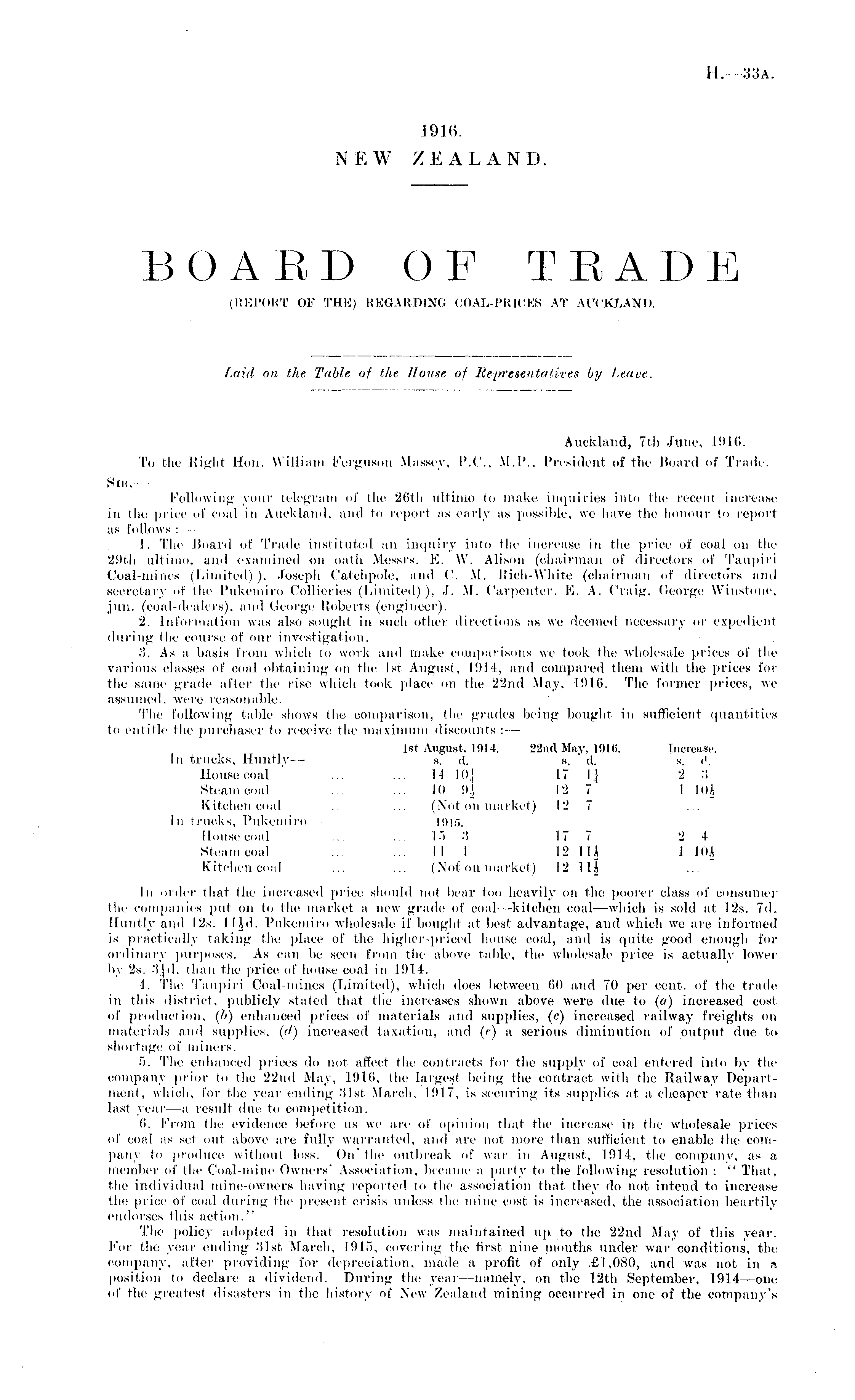 Auckland, 7th June, 1916. To the Right Hon. William Ferguson Massey, I.C, M.P., President of the Board of Trade. Sir,— Following your telegram of the 26th ultimo to make inquiries into the recent increase in the price of coal in Auckland, and to report as early as possible, we have the honour to report as follows :— 1. The Hoard of Trade instituted an inquiry into the increase in the price of coal on the 29th ultimo, and examined on oath Messrs. E, VV. Alison (chairman of directors of Taupiri Coal-mines (Limited)), Joseph Catchpole, and ('. M. Rich-White (chairman of directors and secretary of the Pukemiro Collieries (Limited)), .1. M. Carpenter, E. A. Craig. George Winstone, jun. (coal-dealers), and George Huberts (engineer). 2. Information was also sought in such other directions as we deemed necessary or expedient during the course of our investigation. ii. As a basis from, which to work and make comparisons we took the wholesale prices of the various classes of coal obtaining on the Ist August, 1911, and compared them with the prices for the same grade after the rise which took place on the 22nd May, 1916. The former prices, we assumed, were reasonable. The following table shows the comparison, the grades being bought in sufficient quantities to entitle the purchaser to receive the maximum discounts : — Ist August. 1914. 22nrt May, I9l<>. Increase. In trucks, Huntlv— s. d. s. ' cl. s. d. House coal ' ... ... 14 l().[ 17 11 2 3 Steam coal ... ... 10 I' 2 7 1 I()A Kitchen coal ... ... (Not on market) 12 7 In trucks, Pukemiro — IMS. House coal ... ... 15 -i 177 24 Steam coal ... ... 11l 12 lli 1 ■ 10J Kitchen coul ... ... (Not on market) 12 ll| In order that the increased price should not bear too heavily on the poorer class of consumer the companies put on to the market a new grade of coal—kitchen coal —which is sold at 12s. 7d. Huntly and 12s. I lid. Pukemiro wholesale if bought at best advantage, and which we are informed is practically taking the place of the higher-priced house coal, and is quite good enough for ordinary purposes. As can be seen from the above table, the wholesale price is actually lower by 2s. -'ijd. than the price of house coal in 1914. 4. The Taupiri Coal-mines (Limited), which does between 60 and 70 per cent, of the trade in this district, publicly stated that the increases shown above were due to (a) increased cost of production, (b) enhanced prices of materials and supplies, (c) increased railway freights on materials and supplies, ('/) increased taxation, and (c) a serious diminution of output due to shortage of miners. 5. The enhanced prices do not affect the contracts for the supply of coal entered into by the company prior to the 22nd May, 1916, the largest being the contract with the Railway Department, which, for the year ending .'list March, 1917, is securing its supplies at a cheaper rate than last year —a result due to competition. (i. From the evidence before us we are of opinion that the increase in tin- wholesale prices of coal as set out above are fully warranted, and are not more than .sufficient to enable the company to produce without loss. On the outbreak of war in August, 1914, the company, as a member of the Coal-mine Owners' Association, became a party to the following resolution : " That, the individual mine-owners having reported to the association that they do not intend to increase the price of coal during the present crisis unless the mine cost is increased, the association heartily endorses this action." The policy adopted in that resolution was maintained up. to the 22nd May of this year. For the year ending .'list March, 1915, covering the first nine months under war conditions, the company, after providing for depreciation, made a, profit of only £1,080, and was not in a position to declare a dividend. During the year —namely, on the 12th September, 1914—one of the greatest disasters in the history of New Zealand mining occurred in one of the company's