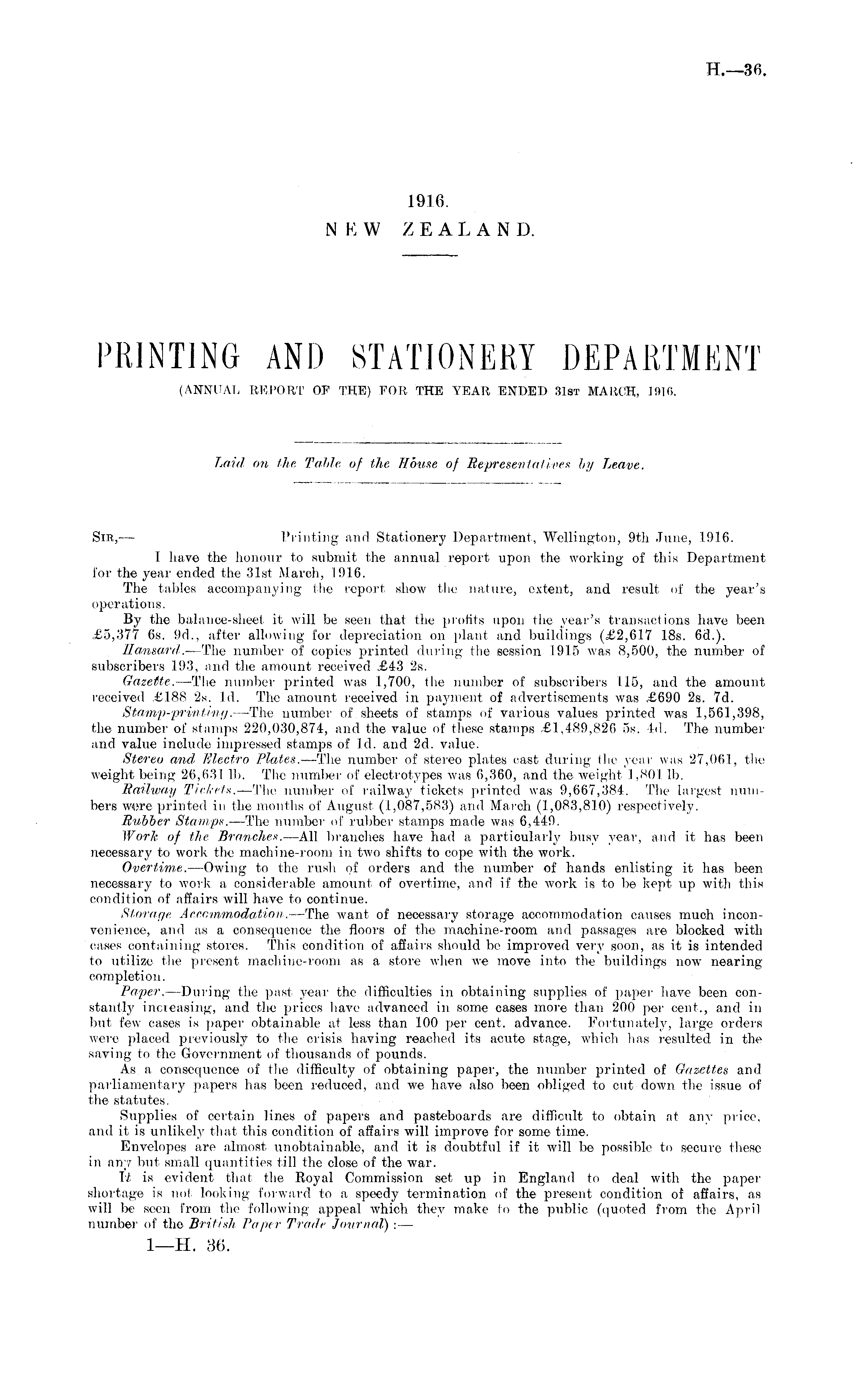 Sib, — Printing and Stationery Department, Wellington, 9th June, 19.1.6. I have the honour to submit the annual report upon the working of this Department for the year ended the 31st March, 1916. The tables accompanying the report show the nature, extent, and result of the year's operations. By the balance-sheet it will be seen that the profits upon the year's transactions have been .£5,377 6s. 9d., after allowing for depreciation on plant and buildings (£2,617 18s. 6d.). Hansard. —The number of copies printed during the session 1915 was 8,500, the number of subscribers 193, and the amount received .£43 2s. Gazette. —The number printed was 1,700, the number of subscribers 115, and the amount received £188 2s. Id. The amount received in payment of advertisements was £690 2s. 7d. Stamp-printing. —The number of sheets of stamps of various values printed was 1,561,398, the number of stamps 220,030,874, and the value of these stamps £1,489,826 ss. Id. The number and value include impressed stamps of Id. and 2d. value. Stereo and Electro Plates. —The number of stereo plates cast during the year was 27,061, the weight being 26,631 11). The number of electrotypes was 6,360, and the weight 1,801 lb. Railway Tic/rets. —The number of railway tickets printed was 9,667,384. The largest numbers w«re printed in the months of August (1,087,583) and March (1,083,810) respectively. Rubber Stamps. —The number of rubber stamps made was 6,449. Work of the Branches. —All brandies have had a particularly busy year, and it has been necessary to work the machine-room in two shifts to cope with the work. Overtime. —Owing to the rush of orders and the number of hands enlisting it has been necessary to work a considerable amount of overtime, and if the work is to be kept up with this condition of affairs will have to continue. Storage Accommodation. —The want of necessary storage accommodation causes much inconvenience, and as a consequence the floors of the machine-room and passages are blocked with cases containing stores. This condition of affairs should be improved very soon, as it is intended to utilize the present machine-room as a store when we move into the buildings now nearing completion. Paper. —During the past year the difficulties in obtaining supplies of paper have been constantly increasing, and the prices have advanced in some cases more than 200 per cent., and in but few cases is paper obtainable at less than 100 per cent, advance. Fortunately, large orders were placed previously to the crisis having reached its acute stage, which lias resulted in the saving to the Government of thousands of pounds. As a consequence of the difficulty of obtaining paper, the number printed of Gazettes and parliamentary papers has been reduced, and we have also been obliged to cut down the issue of the statutes. Supplies of certain lines of papers and pasteboards are difficult to obtain at any price, and it is unlikely that this condition of affairs will improve for some time. Envelopes are almost unobtainable, and it is doubtful if it will be possible to secure these in amy but small quantities till the close of the war. I_ is evident that the Royal Commission set up in England to deal with the paper shortage is mil looking forward to a speedy termination of the present condition of affairs, as will be seen from the following appeal which they make to the public (quoted from the April number of the British Paper Trade Journal) : —