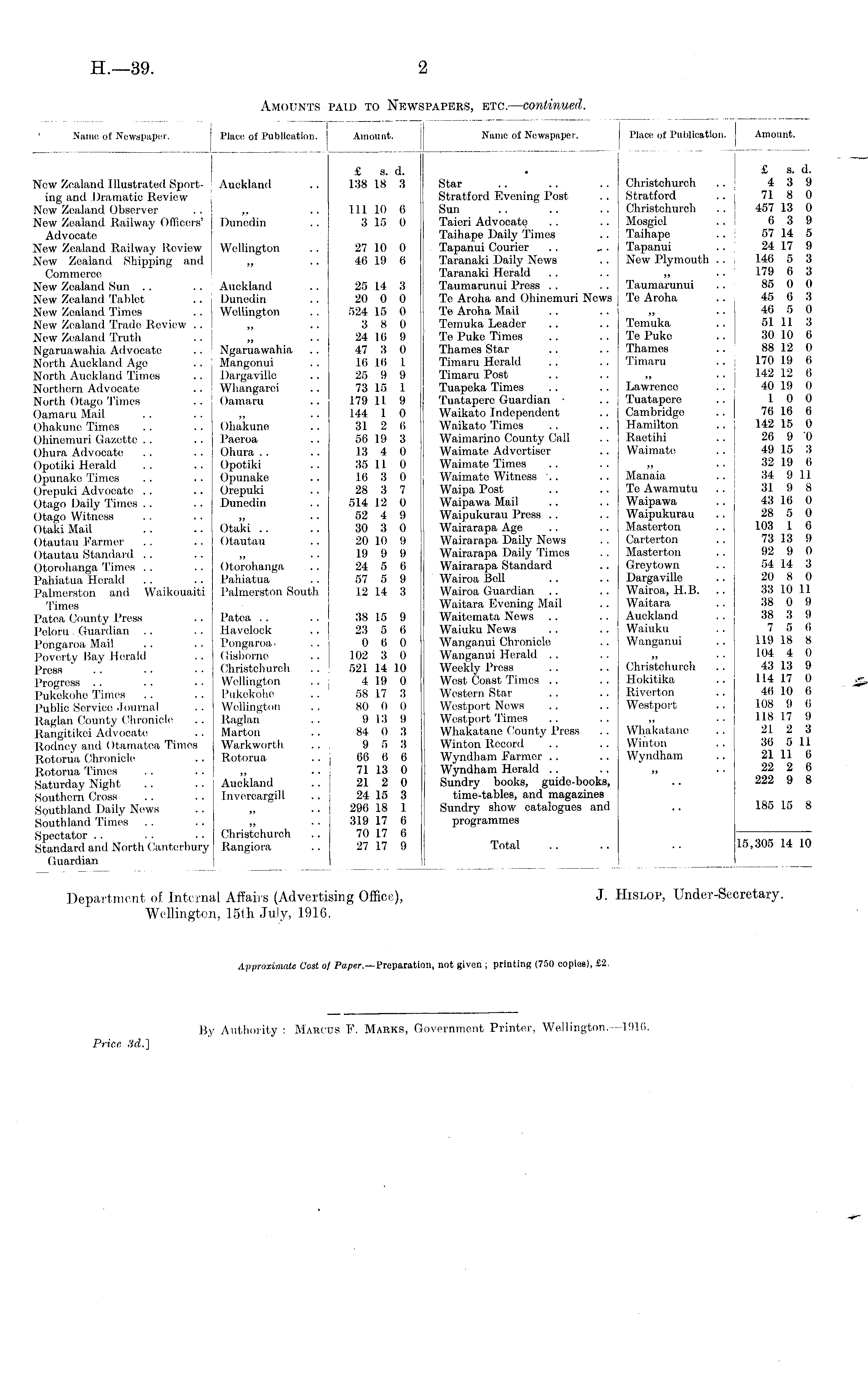 Name of Newspaper Place of Publication. Amount. Name of Newspaper. Place of Publication. Amount. Now Zealand Illustrated Sporting and Dramatic Review New Zealand Observer New Zealand Railway Officers' Advocate New Zealand Railway Review New Zealand Shipping and Commerce New Zealand Sun Now Zealand Tablet New Zealand Times New Zealand Trade Review .. New Zealand Truth Ngaruawahia Advocate North Auckland Age North Auckland 'limes Northern Advocate North Otago Times Oamaru Mail Ohakune Times Ohinemuri Gazette Ohura Advocate Opotiki Herald Opunake Times Orepuki Advocate Otago Daily Times Otago Witness Otaki Mail Otautau Farmer Otautau Standard Otorolianga Times Paliiatua Herald Palmerston and Waikouaiti Times Patea County Press Peloru Guardian Pongaroa Mail Poverty Bay Herald Press Progress Pukokohe Times Public Service Journal Raglan County Chronicle Rangitikei Advocate Rodney and Otamatea Times Rotorua Chronicle Rotorua Times Saturday Night Southern Cross Southland Daily News Southland Times Spectator Standard and North Canterbury Guardian Auckland £ s. d. 138 18 3 Star Stratford Evening Post Sun Taiori Advocate Taihape Daily Times Tapanui Courier Taranaki Daily News Taranaki Herald Taumarunui Press Te Aroha and Ohinemuri News Te Aroha Mail Temuka Leader Te Puke Times Thames Star Timaru Herald Timaru Post Tuapeka 'limes Tuatapere Guardian ■ Waikato I ndopondont Waikato Times Waimarino County Call Waimate Advertiser Waimate Times Waimate Witness Waipa Post Waipawa Mail Waipukurau Press .. Wairarapa Age Wairarapa I >uily News Wairarapa Daily Times Wairarapa Standard Wairoa Bell Wairoa Guardian Waitara Evening Mail Waitomata News Waiuku News Wanganui Chronicle Wanganui Herald Weekly Press West Coast Times Western Star Westport News Westport Times Whakatane County Press Winton Record Wyndham Farmer Wyndham Herald Sundry books, guide-books, time-tables, and magazines Sundry show catalogues and programmes Christchurch Stratford Christchurch Mosgiel Taihape Tapanui New Plymouth .. £ s. d. 4 3 9 71 8 0 457 13 0 6 3 9 57 14 5 24 17 9 146 5 3 179 6 3 85 0 0 45 6 3 46 5 0 51 11 3 30 10 6 88 12 0 170 19 6 142 12 6 40 19 0 1 0 0 76 16 6 142 15 0 26 9 0 49 15 3 32 19 6 34 9 11 31 9 8 43 16 0 28 5 0 103 1 6 73 13 9 92 9 0 54 14 3 20 8 0 33 10 11 38 0 9 38 3 9 7 5 6 119 18 8 104 4 0 43 13 9 114 17 0 46 10 <i 108 9 <i 118 17 9 21 2 3 36 5 11 21 11 0 22 2 6 222 9 8 Dunedin 111 10 6 3 15 0 Wellington 27 10 0 46 19 6 Auckland Dunedin Wellington Ngaruawahia Mangonui Dargaville Whangarci Oamaru ii • • Ohakune Paeroa Ohura Opotiki Opunake Orepuki Dunedin Otaki Otautau Otorolianga Paliiatua Palmerston South 25 14 3 20 0 0 524 15 0 3 8 0 24 16 9 47 3 (I 16 16 I 25 9 9 73 15 I 179 11 9 144 1 0 31. 2 6 56 19 3 13 4 0 35 II 0 16 3 0 28 3 7 514 12 0 52 4 9 30 3 0 20 10 9 19 i) 9 24 5 0 57 5 9 1.2 1.4 3 Taumarunui Te Aroha Temuka Te Puke Thames Timaru Lawrence Tuatapcre Cambridge Hamilton Raetihi Waimate ii • • Manaia Te Awamutu Waipawa Waipukurau Masterton Carterton Masterton Greytown Dargavillc Wairoa, H.B. .. Waitara Auckland Waiuku .. ! Wanganui Patea Havelock Pongaroa. Gisborne Christchurch Wellington Pukokohe Wellington Raglan Marton Warkworth Rotorua Auckland Invercargill Christchurch Rangiora 38 15 9 23 5 6 (I (i 0 102 3 0 521 14 10 4 19 0 58 17 3 80 0 0 9 13 (I 84 0 3 9 5 3 66 (i 6 71 13 0 21 2 0 24 15 3 296 18 I 319 17 6 70 17 6 27 17 9 Christchurch Hokitika Riverton Westport Whakatane Winton Wyndham 185 15 8 Total 15,305 14 10