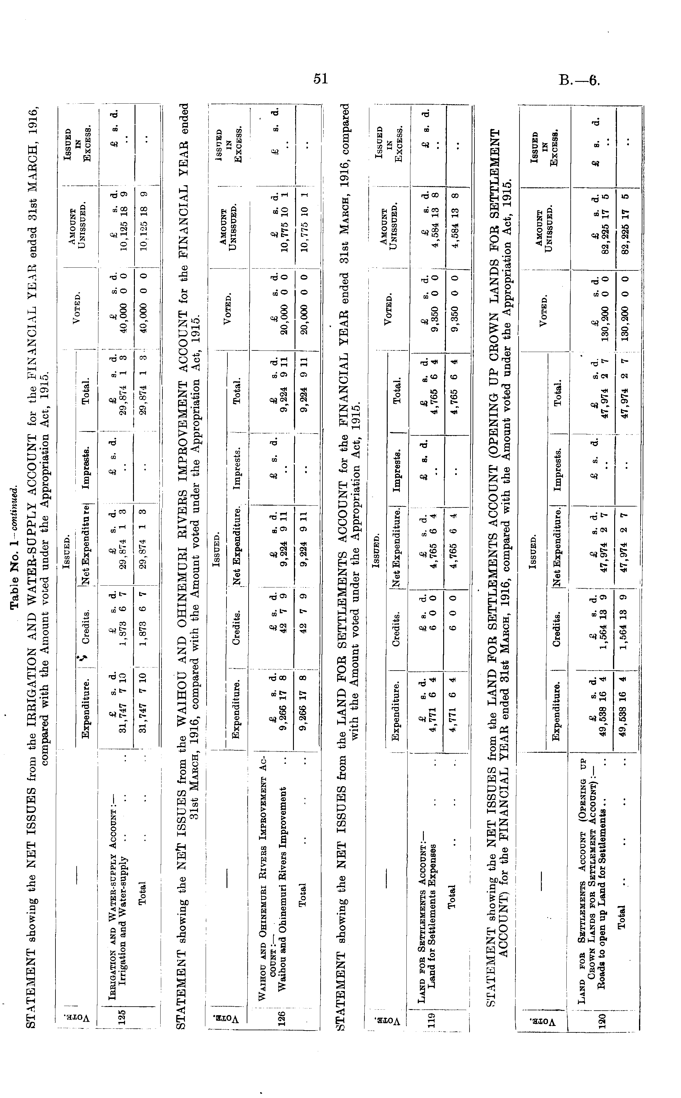 STATEMENT showing the NET ISSUES from the LAND FOR SETTLEMENTS ACCOUNT (OPENING UP CROWN LANDS FOR SETTLEMENT ACCOUNT) for the FINANCIAL YEAR ended 31st March, 1916, compared with the Amount voted under the Appropriation Act, 1915.