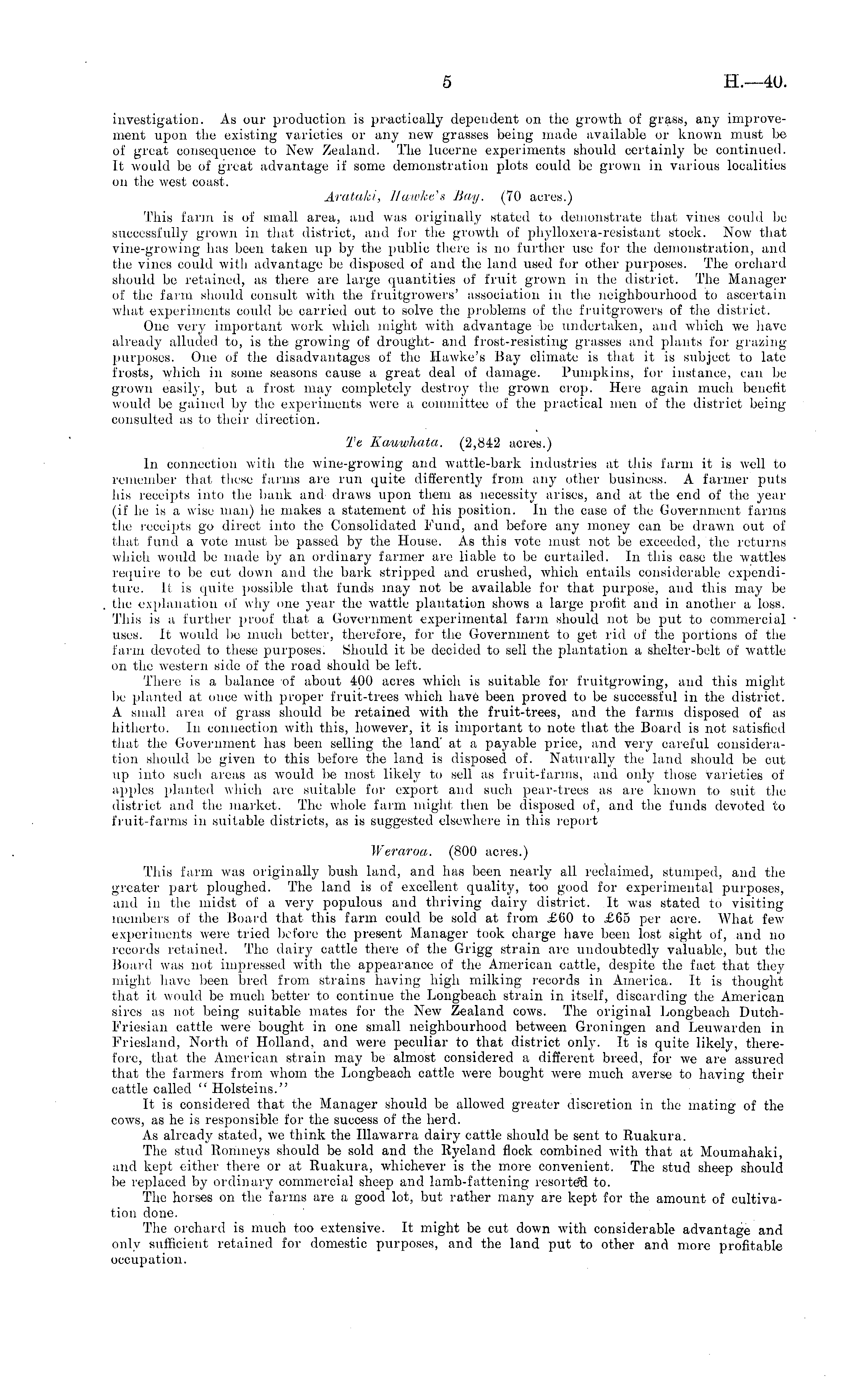 investigation. As our production is practically dependent on the growth of grass, any improvement upon the existing varieties or any new grasses being made available or known must be of great consequence to New Zealand. The lucerne experiments should certainly be continued. It would be of great advantage if some demonstration plots could be grown in various localities on the west coast. Arataki, Hawke's Bay. (70 acres.) This farm is of small area, and was originally stated to demonstrate that vines could he successfully grown in that district, and for the growth of phylloxera-resistant stock. Now that vine-growing has been taken up by the public there is no further use for the demonstration, and the vines could with advantage be disposed of and the land used for other purposes. The orchard should be retained, as there are large quantities of fruit grown in the district. The Manager of the farm should consult with the fruitgrowers' association in the neighbourhood to ascertain what experiments could be carried out to solve the problems of the fruitgrowers of the district. One very important work which might with advantage be undertaken, and which we have already alluded to, is the growing of drought- and frost-resisting grasses and plants for grazing purposes. One of the disadvantages of the Hawke's Bay climate is that it is subject to late frosts, which in some seasons cause a great deal of damage. Pumpkins, for instance, can be grown easily, but a frost may completely destroy the grown crop. Here again much benefit would be gained by the experiments were a committee of the practical men of the district being consulted as to their direction. Te Kauwhata. (2,842 acres.) In connection with the wine-growing and wattle-bark industries at this farm it is well to remember that these farms are run quite differently from any other business. A farmer puts his receipts into the bank and- draws upon them as necessity arises, and at the end of the year (if he is a wise man) he makes a statement of his position. In the case of the Government farms the receipts go direct into the Consolidated Fund, and before any money can be drawn out of that fund a vote must be passed by the House. As this vote must not be exceeded, the returns which would be made by an ordinary farmer are liable to be curtailed. In this case the wattles require to be cut down and the bark stripped and crushed, which entails considerable expenditure. It is quite possible that funds may not be available for that purpose, and this may be the explanation of why one year the wattle plantation shows a large profit and in another a loss. This is a further proof that a Government experimental farm should not be put to commercial uses. It would he much better, therefore, for the Government to get rid of the portions of the farm devoted to these purposes. Should it be decided to sell the plantation a shelter-belt of wattle on the western side of the road should be left. There is a balance of about 400 acres which is suitable for fruitgrowing, and this might be planted at once with proper fruit-trees which have been proved to be successful in the district. A small area of grass should be retained with the fruit-trees, and the farms disposed of as hitherto. In connection with this, however, it is important to note that the Board is not satisfied that the Government has been selling the land at a payable price, and very careful consideration should be given to this before the land is disposed of. Naturally the land should be cut up into such areas as would be most likely to sell as fruit-farms, and only those varieties of apples planted which are suitable for export and such pear-trees as are known to suit the district and the market. The whole farm might then be disposed of, and the funds devoted to fruit-farms in suitable districts, as is suggested elsewhere in this report Weraroa. (800 acres.) This farm was originally bush land, and has been nearly all reclaimed, stumped, and the greater part ploughed. The land is of excellent quality, too good for experimental purposes, and in the midst of a very populous and thriving dairy district. It was stated to visiting members of the Board that this farm could be sold at from £60 to £65 per acre. What few experiments were tried before the present Manager took charge have been lost sight of, and no records retained. The dairy cattle there of the Grigg strain are undoubtedly valuable, but the Board was not impressed with the appearance of the American cattle, despite the fact that they might have been bred from strains having high milking records in America. It is thought that it would be much better to continue the Longbeach strain in itself, discarding the American sires as not being suitable mates for the New Zealand cows. The original Longbeach DutchFriesian cattle were bought in one small neighbourhood between Groningen and Leuwarden in Friesland, North of Holland, and were peculiar to that district only. It is quite likely, therefore, that the American strain may be almost considered a different breed, for we are assured that the farmers from whom the Longbeach cattle were bought were much averse to having their cattle called " Holsteins." It is considered that the Manager should be allowed greater discretion in the mating of the cows, as he is responsible for the success of the herd. As already stated, we think the Illawarra dairy cattle should be sent to Ruakura. The stud Romneys should be sold and the Ryeland flock combined with that at Moumahaki, and kept either there or at Ruakura, whichever is the more convenient. The stud sheep should be replaced by ordinary commercial sheep and lamb-fattening resorted to. The horses on the farms are a good lot, but rather many are kept for the amount of cultivation done. The orchard is much too extensive. It might be cut down with considerable advantage and only sufficient retained for domestic purposes, and the land put to other and more profitable occ