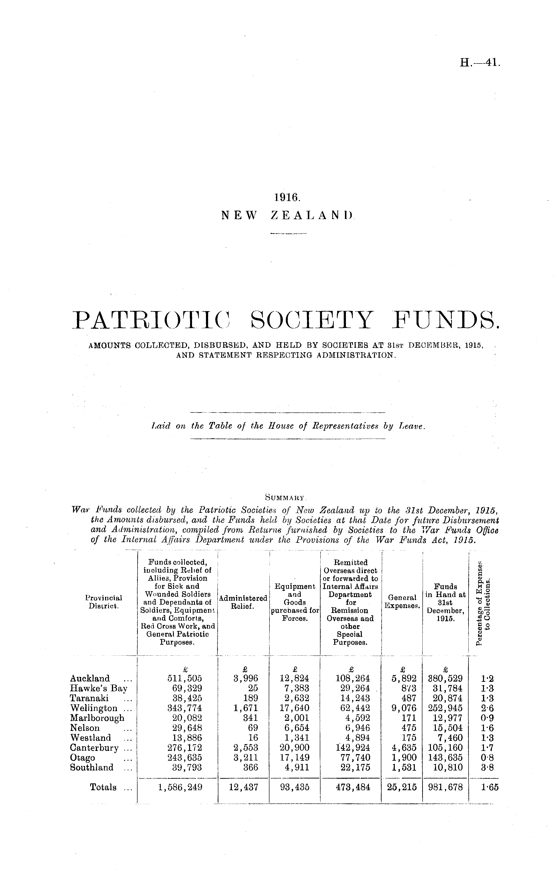 Summary, War Funds collected by the Patriotic Societies of New Zealand up to the 31st December, 1915, the Amounts disbursed, and the Funds held by Societies at that Date for future Disbursement and Administration, compiled from Returns furnished by Societies to the War Funds Office of the Internal Affairs Department under the Provisions of the War Founds Act, 1915.