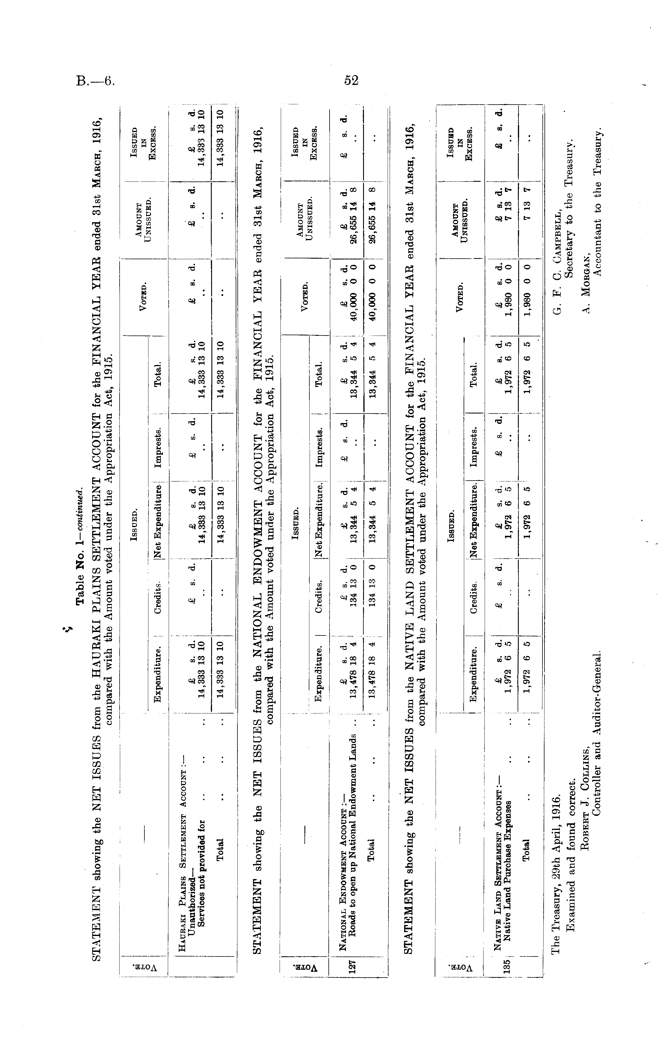 Table No. 1—continued. STATEMENT showing the NET ISSUES from the HAURAKI PLAINS SETTLEMENT ACCOUNT for the FINANCIAL YEAR ended 31st March, 1916, compared with the Amount voted under the Appropriation Act, 1915.