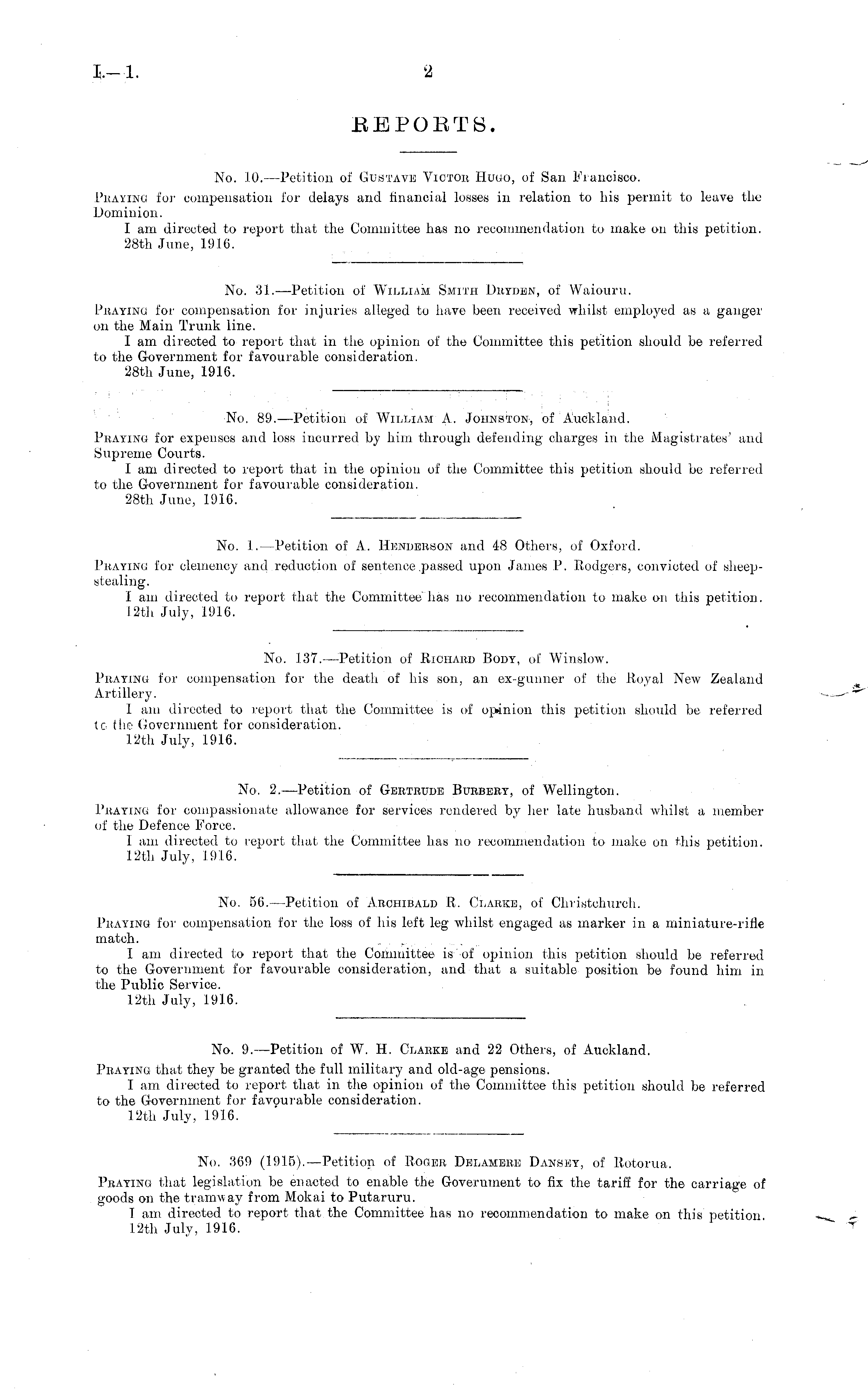 No. 31.—Petition of William Smith Dryden, of Waiouru. Prating for compensation for injuries alleged to have been received whilst employed as a ganger on the Main Trunk line. I am directed to report that in the opinion of the Committee this petition should be referred to the Government for favourable consideration. 28th June, 1916.