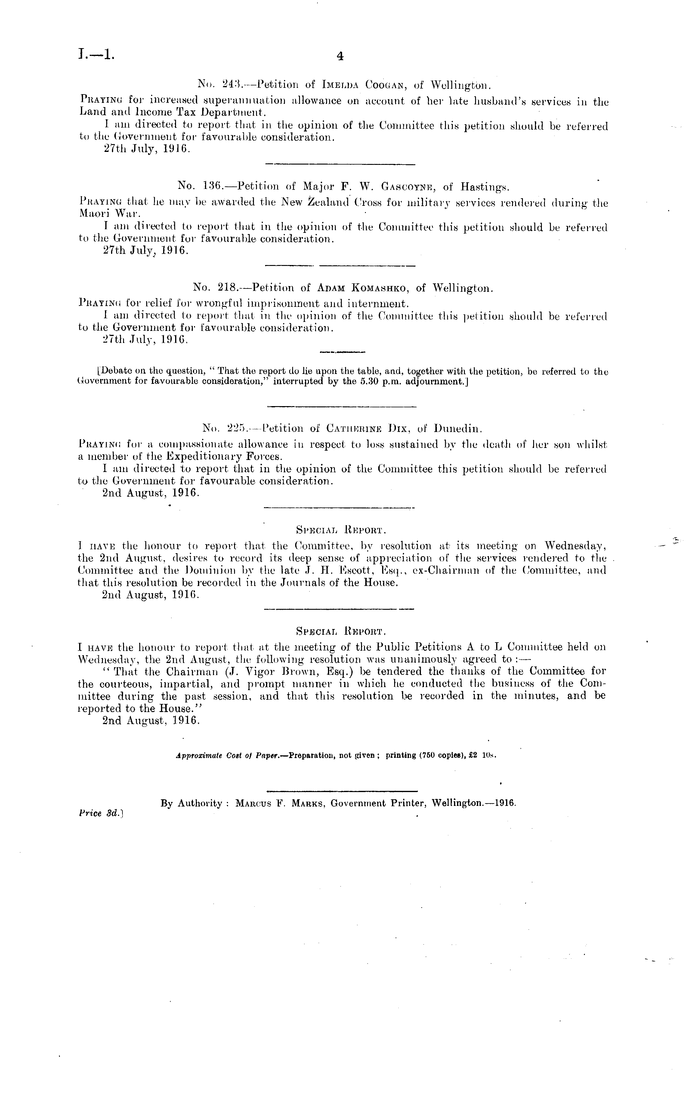No. 136.—Petition of Major F. W. Gascoyne, of Hastings. Prating that he may be awarded the New Zealand Cross for military services rendered during the Maori War. I am directed to report that in the opinion of the Committee this petition should he referred to the Government for favourable consideration. 27th July, 1916.