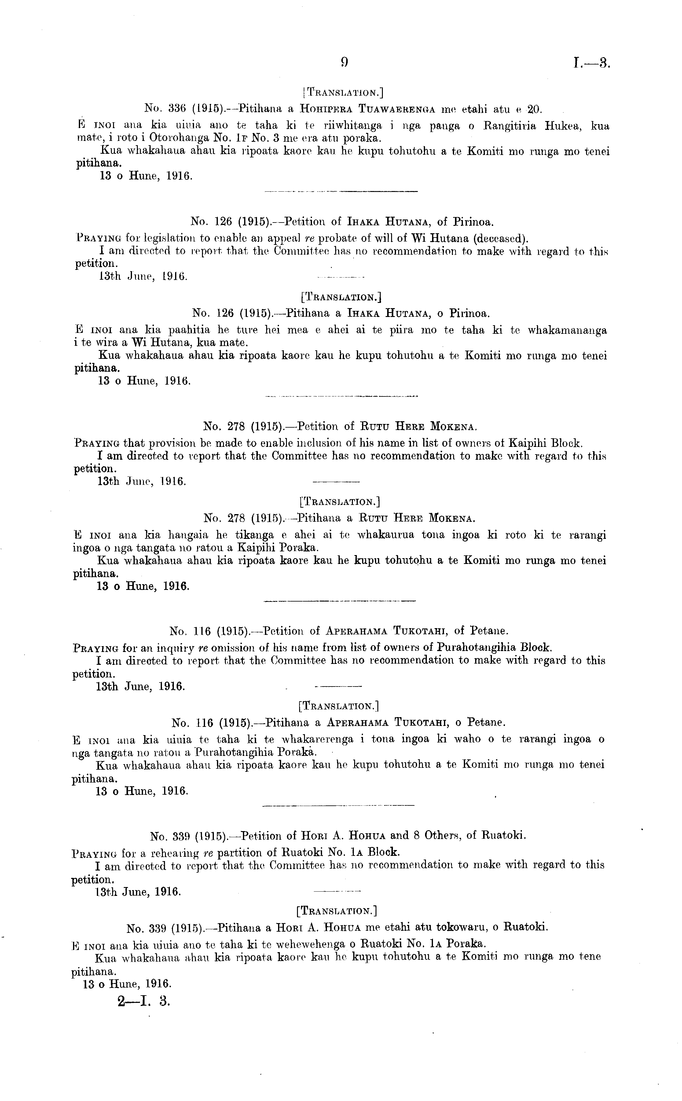 I Translation.] No. 336 (1915). —Pitihana a Hohipera Tuawaerenga me etahi atu c 20. X tnoi ana kia uiuia ano te taha kite riiwhitanga i nga panga o Rangitiria Hukea, kua mate, i roto i Otorohanga No. If No. 3 me era atu poraka. Kua whakahaua ahau kia ripoata kaore kau he kupu tohutohu a te Komiti mo runga mo tenei pitihana. 13 o Hune, 1916.