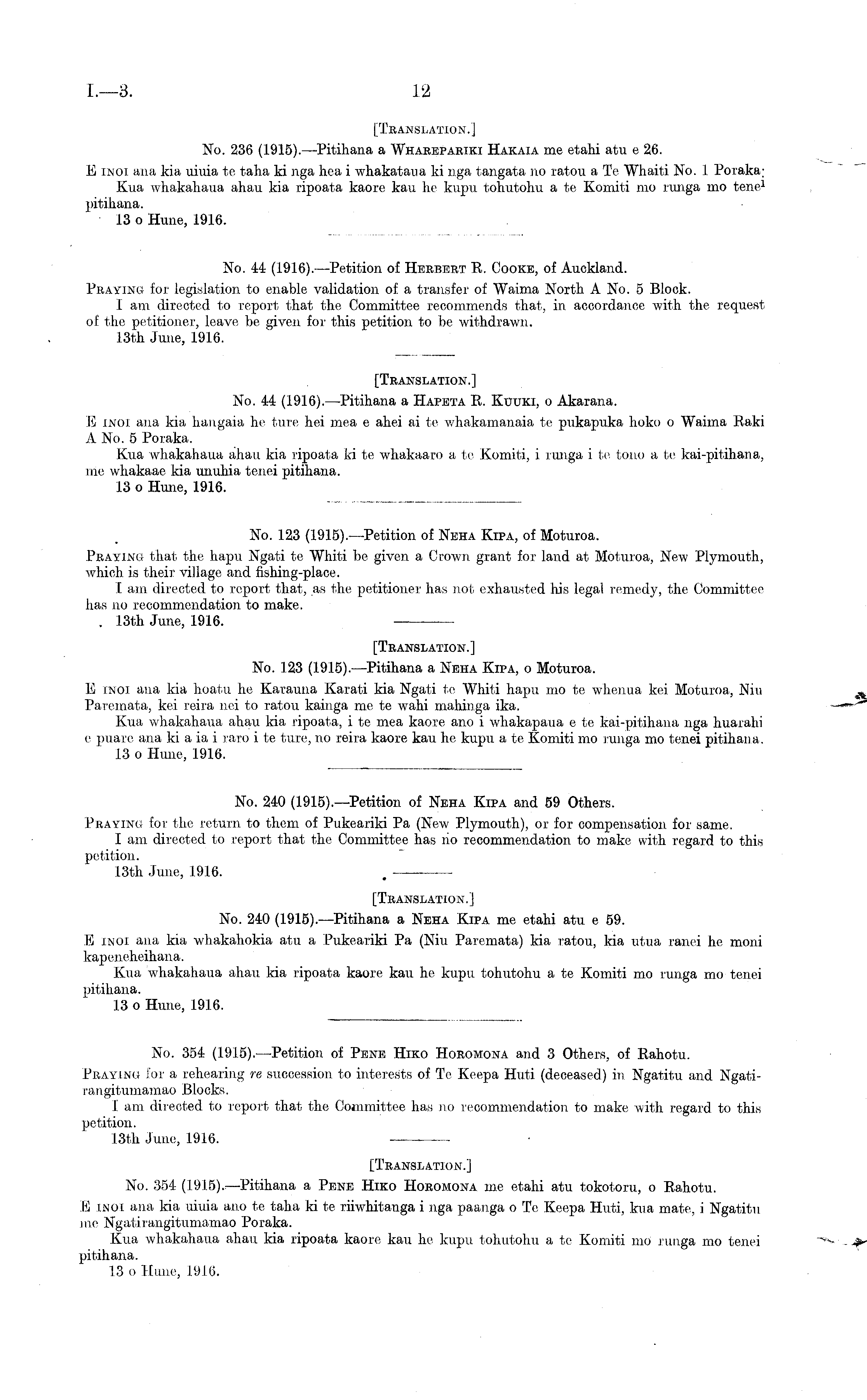 [Translation.] No. 354 (1915)..—Pitihana a Pene Hiko Horomona me etahi atu tokotoru, o Rahotu. E inoi ana kia uiuia ano te taha kite riiwhitanga i nga paanga o Te Keepa Huti, kua mate, i Ngatitu me Ngatirangitumamao Poraka. Kua whakahaua ahau kia ripoata kaore kau he kupu tohutohu a te Komiti mo runga mo tenei pitihana. 13 o Hune, 1910.