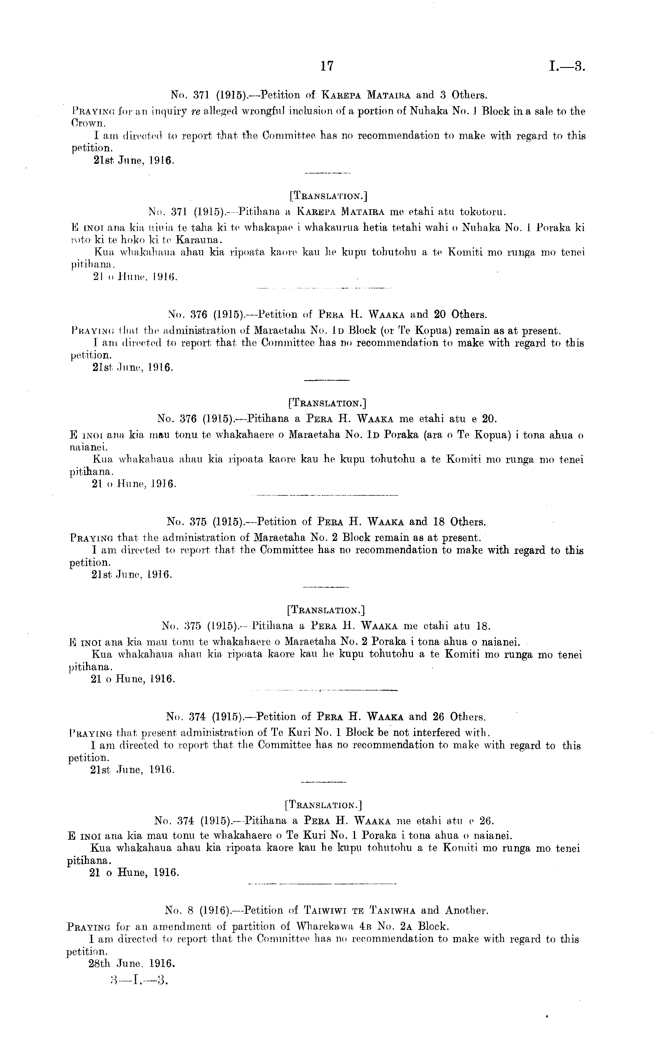No. 371 (1915).—Petition of Karepa Mataira and 3 Others. Praying for an inquiry re alleged wrongful inclusion of a portion of Nuhaka No. I Block in a sale to the Crown. I am directed to report that the Committee has no recommendation to make with regard to this petition. 21st June, 1916. [Translation.] No. 371 (1915).- -Pitihana a, Karepa Mataira me etahi atu tokotoru. E inoi ana kia uiuia te taha kite whakapae i whakaurua hetia tetahi wahi o Nuhaka No. 1 Poraka ki roto kite hoko kite Karauna. Kua, whakahaua ahau kia ripoata kaore kau he kupu tohutohu a te Komiti mo runga mo tenei. pitihana. 21 o Hune, 1916.