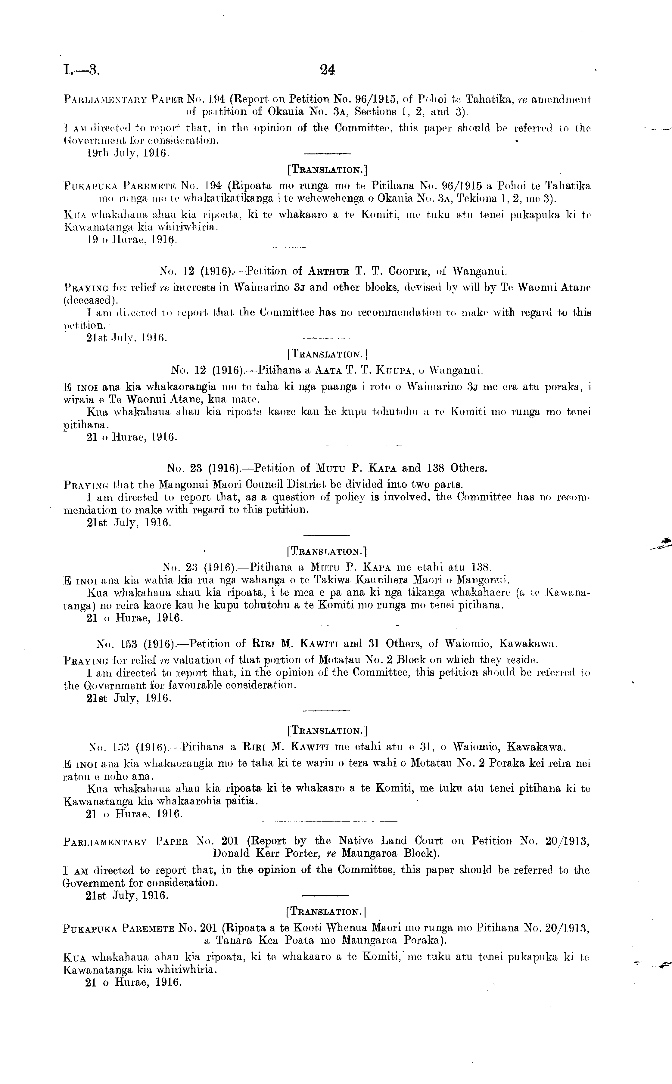 Parliamentary Paper No. 194 (Report on Petition No. 96/1915, of Pohoi te Tahatika, re, amendment of partition of Okauia No. 3a, Sections 1, 2, and 3). I am directed to report that, in the opinion of the Committee, this paper should be referred to the Government for consideration. I.9th July, 1916. [Translation.] Pukapuka Paremete No. 194 (Ripoata mo runga mo te Pitihana No. 96/1915 a Pohoi. te Tahatika mo runga mo te whakatikatikanga i te wehewehenga o Okauia No. 3a, Tekiona 1, 2, me 3). Kua whakahaua ahau kia ripoata, kite whakaaro a te Komiti, me tuku atu tenei pukapuka kite Kawanatanga kia whiriwhiria,. 19 o Hurae, 1916.