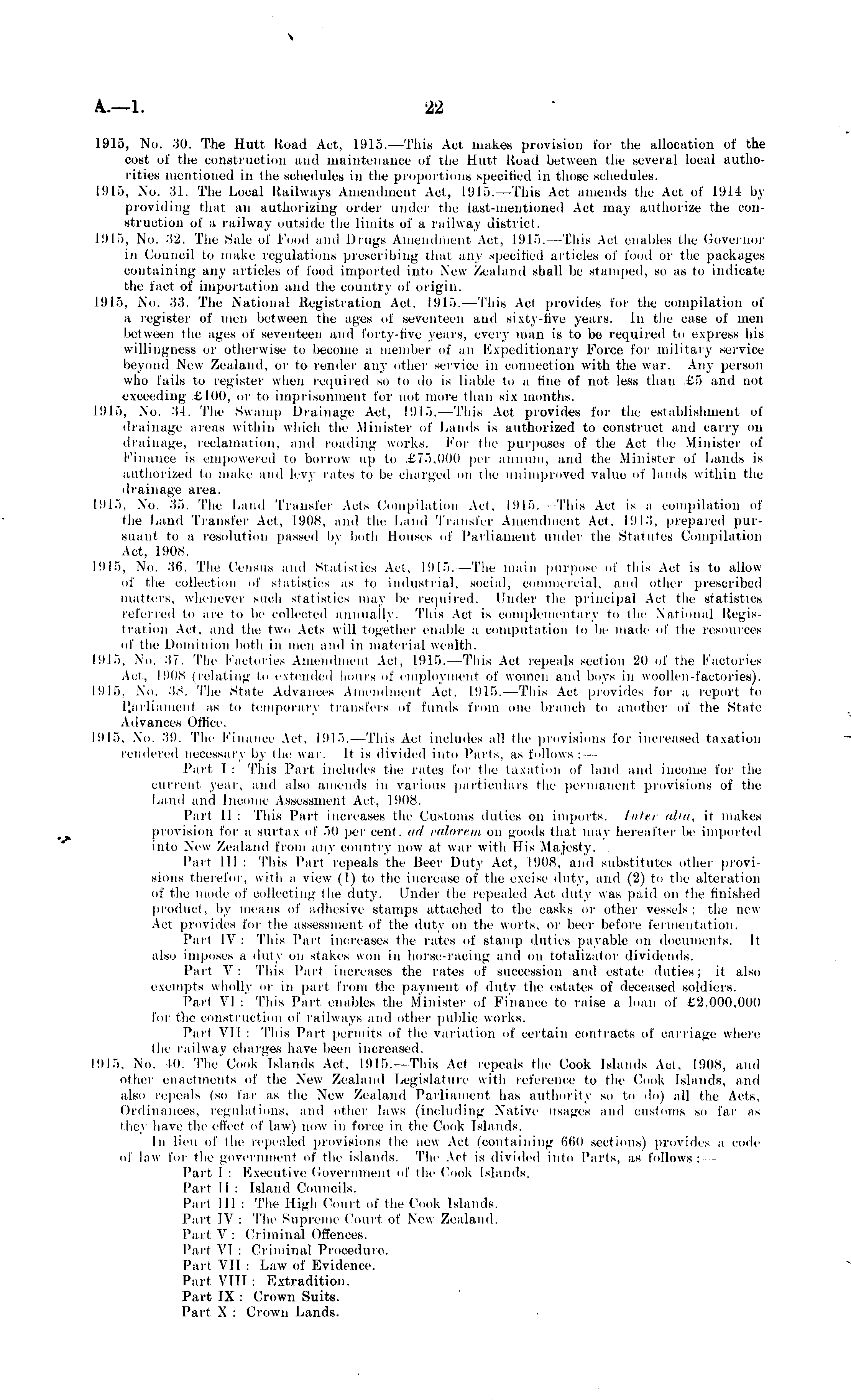 1915, No. 30. The Hutt Road Act, 1915. —This Act makes provision for the allocation of the cost of the construction and maintenance of the Hutt Road between the several local authorities mentioned in the schedules ill the proportions Bpeoified in those schedules. 1915, .No. 31. The Local Railways Amendment Act, 1915. —This Act amends the Act of 1914 by providing that an authorizing order under ihe last-mentioned Act may authorize the construction of a railway outside the limits of a railway district. 1915, No. 32. The Sale of Food and Drugs Amendment Act, 1915. This Act enables Ihe Governor in Council to make regulations prescribing thai any specified articles of food or the packages containing any articles of food imported into New Zealand shall be stamped, so as to indicate the fact of importation and the country of origin. 1915, No. 33. The National Registration Act. 1915. —This Act provides for the compilation of a register of men between the ages of seventeen and sixty-five years. In the case of men between the ages of seventeen and forty-five years, every man is to be required to express his willingness or otherwise to become a. member of an Expeditionary Force for military service beyond New Zealand, or to render any other service in connection with the war. Any person who fails to register when required so to do is liable to a fine of not less than £5 and not exceeding £100, or to imprisonment for not more than six months. 1915, No. 31. The Swamp Drainage Act, 1915. -This Act provides for tin.' establishment of drainage areas within which the Minister of Lands is authorized to construct and carry on drainage, reclamation, ami loading works. For ihe purposes of the Act the Minister of Finance is empowered to borrow up to £75.(t00 per annum, and the Minister of Lands is authorized to make and levy rates to be charged on the unimproved value of lands within the drainage area. 1915, No. 35. The Land Transfer Acls Compilation Act. 1915. This Act is a compilation of the Land Transfer Act. 1908. and the Land Transfer Amendment Act. 1913. prepared pursuant to a resolution passed by both Houses of Parliament under the Statutes Compilation Act, 1908. 1915, No. 36. The Census and Statistics .Act. 1915. The main purpose of this Act is to allow of the collection of statistics as to industrial, social, commercial, and other prescribed matters, whenever such statistics may be required. Under the principal Act the statistics referred to are to be collected annually. This Act is complementary to ihe National Registration Act. and Ihe two Acts will together enable a compulation to be made of the resources of the Dominion both in men ami in material wealth. L 916, No. 37. The Factories Amendment Act, 1915. This Act repeals section 20 of the Factories Act, L9OB (relating to extended hours of employment of women and boys in woollen-factories). 1915, No. 38. The State Advances Amendment Act, 1915. This Act provides for a report to parliament as to temporary transfers of funds from one branch to another of the State Advances Office. 1915. No. 39. The Finance Act, 1915.—This Act includes all the provisions for increased taxation rendered necessary by the war. It is divided into Parts, as follows: — Part I : This Part includes the rates for the taxation of land and income for Ihe current year, and also amends in various particulars the permanent provisions of the Land ami income Assessment Act, 1908. Pari II : This Part increases the Customs duties on imports. Inter aha, il makes provision for a surtax of 50 per cent, ad valorem on goods that may hereafter be imported into New Zealand from any country now at war with His Majesty. Pail 111 : This Part repeals the Beer Duty Act, 1908, and substitutes other provisions therefor, with a view (I) to the increase of the excise duty, and (2) to the alteration of the mode of collecting the duty. Under the repealed Acl duty was paid on the finished product, by means of adhesive stamps attached to the casks or other vessels; the new Act provides for the assessment of the duty on the worts, or beer before fermentation. Pari IV : This Part increases the rates of stamp duties payable on documents. It also imposes a duly on stakes won in horse-racing and on totalizator dividends. Part V: This Pari increases the rates of succession and estate duties; it also exempts wholly or in pari from the payment of duty the estates of deceased soldiers. Part VI : This Part enables the Minister of Finance to raise a loan of £2.000,000 for the construction of railways and other public works. Part VII : This Part permits of the variation of certain contracts of carriage where the railway charges have been increased, 1815, No. 40. The' Cook Islands Act, 1915. -This Act repeals the Cook Islands Acl. 1908, and other enactments of the New Zealand Legislature with reference to the Cook Islands, and also repeals (so fat- as the New Zealand Parliament has authority so to do) all the Acts, Ordinances, regulations, and other laws (including Native usages and customs so far as they have the effect of law) now in force in the Cook Islands. In lieu of Ihe repealed provisions the new Act (containing 660 sections) provides a code of law for the government of the islands. The Act is divided into Parts, as follows: Part I : Executive Government of the Cook Islands. Part II : Island Councils. Pari 111 : The High Court of the Cook Islands. Part IV: The Supreme Court of New Zealand, Part V : Criminal Offences. Part VI : Criminal Procedure. Part VII : Law of Evidence. Part VIII : Extradition. Part IX : Crown Suits. Part X : Crown Lands.