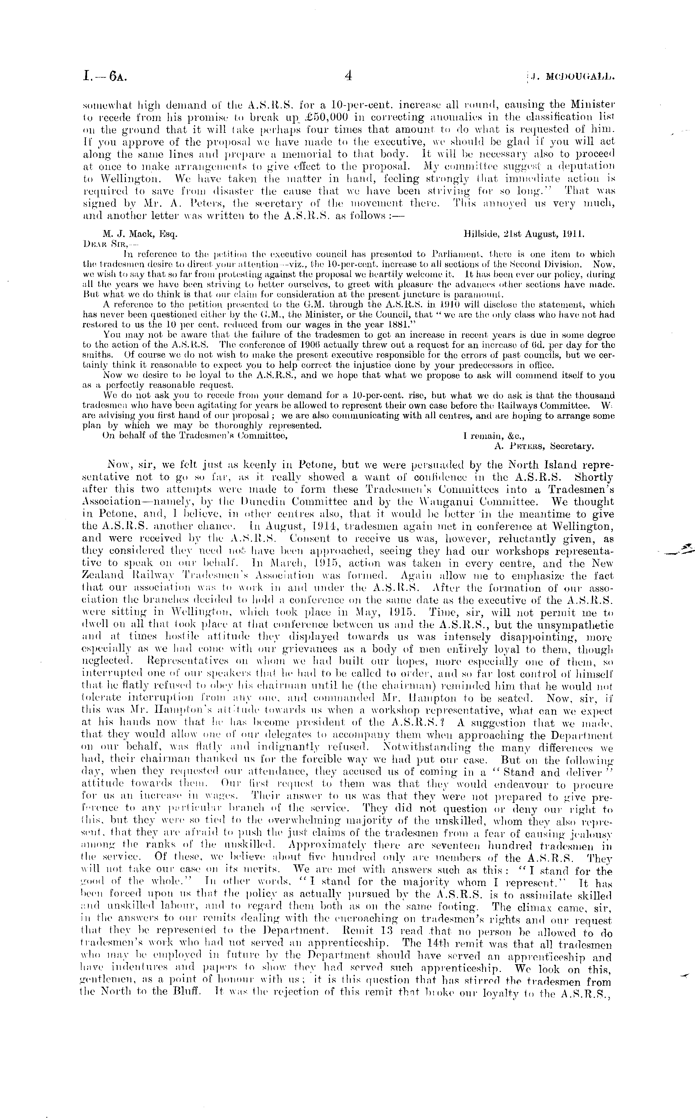 somewhat high demand of the A.S.R.S. for a 10-per-cent. increase all round, causing the Minister to recede from his promise to break up £50,000 in correcting anomalies in the classification list on the ground that it will take perhaps four times that amount to do what is requested of him. If you approve of the proposal we have made to the executive, we should be glad if you will act along the same lines and prepare a memorial to that body. It will be necessary also to proceed at once to make arrangements to give effect to the proposal. My committee suggest a deputation to Wellington. We have taken the matter in hand, feeling strongly that immediate action is required to save from disaster the cause that we have been striving for so long." That was signed by Mr. A. Peters, the secretary of the movement there. This annoyed us very much, and another letter was written to the A.S.R.S. as follows :— M. J. Mack, Esq. Hillside, 21st August, 1911. Dear Sir, — In reference to the petition the executive council has presented to Parliament, there is one item to which the tradosmen desire to direct your attention—viz., the 10-per-cent. increase to all sections of the Second Division. Now, we wish to say that so far from protesting against the proposal we heartily welcome it. It has been ever our policy, during all the years we have been striving to better ourselves, to greet with pleasure the advances other sections have made. Hut what wo do think is that our claim for consideration at the present juncture is paramount. A reference to the petition presented to the G.M. through the A.S.R.S. in 1910 will disclose the statement, which has never been questioned either by the G.M., the Minister, or the Council, that " we are the only class who have not had restored to us the 10 per cent, reduced from our wages in the year 1881." You may not be aware that the failure of the tradesmen to get an increase in recent years is due in some degree to the action of the A.8.11.8. The conference of 1900 actually threw out a roquest for an increase of Od. per day for the smiths. Of course we do not wish to make the present executive responsible for the errors of past councils, but we certainly think it reasonable to expect you to help correct the injustice done by your predecessors in office. Now we desire to be loyal to the A.S.R.S., and we hope that what we propose to ask will commend itself to you as a perfectly reasonable request. We do not ask you to recede from your demand for a 10-per-cent. rise, but what we do ask is that the thousand tradosmen who have been agitating for years be allowed to represent their own case before the Railways Committee. W are advising you first hand of our proposal; we are also communicating with all centres, and are hoping to arrange some plan by which we may be thoroughly represented. On behalf of the Tradesmen's Committee, I remain, &c., A. Peters, Secretary. Now, sir, we felt just as keenly in Petone, but we were persuaded by the North Island representative not to go so far, as it really showed a want of confidence in the A.S.R.S. Shortly after this two attempts were made to form these Tradesmen's Committees into a Tradesmen's Association —namely, by the Dunedin Committee and by the Wanganui Committee. We thought in Petone, and, I believe, in other centres also, that it would be better in the meantime to give the A.S.Ii.S. another chance. In August, 1914, tradesmen again met in conference at Wellington, and were received by the A.S.R.S. Consent to receive us was, however, reluctantly given, as they considered they need not have been approached, seeing they had our workshops representative to speak on our behalf. In March, 1915, action was taken in every centre, and the New Zealand Railway Tradesmen's Association was formed. Again allow me to emphasize the fact that our association was to work in and under the A.S.R.S. After the formation of our association the branches decided to hold a conference on the same date as the executive of the A.S.R.S. were sitting in Wellington, which took place in May, 1915. Time, sir, will not permit me to dwell on all that took place at that conference between us and the A.S.R.S., but the unsympathetic and at times hostile attitude they displayed towards us was intensely disappointing, more especially as we had come with our grievances as a body of men entirely loyal to them, though neglected. Representatives on whom we had built our hopes, more especially one of them, so interrupted one of our speakers that he had to be called to order, and so far lost control of himself that he flatly refused to obey his chairman until he (the chairman) reminded him that he would not tolerate interruption from any one, and commanded Mr. Hampton to be seated. Now, sir, if this was Mr. Hampton's attitude towards us when a workshop representative, what can we expect at his hands now that he has become president of the A.S.R.S.? A suggestion that we made, that they would allow one of our delegates to accompany them when approaching the Department on our behalf, was flatly and indignantly refused. Notwithstanding the many differences we had, their chairman thanked us for the forcible way we had put our ease. But on the following day, when they requested our attendance, they accused us of coming in a " Stand and deliver '' attitude towards them. Our first request to them was that they would endeavour to procure for us an increase in wages. Their answer to us was that they were not prepared to give preference to any particular branch of the service. They did not question or deny our right to this, but they were so tied to the overwhelming majority of the unskilled, whom they also represent, that they are afraid to push the just claims of the tradesmen from a fear of causing jealousy among the ranks of the unskilled. Approximately there are seventeen hundred tradesmen iii the service. Of these, we believe about five hundred only are members of the A.S.R.S. They