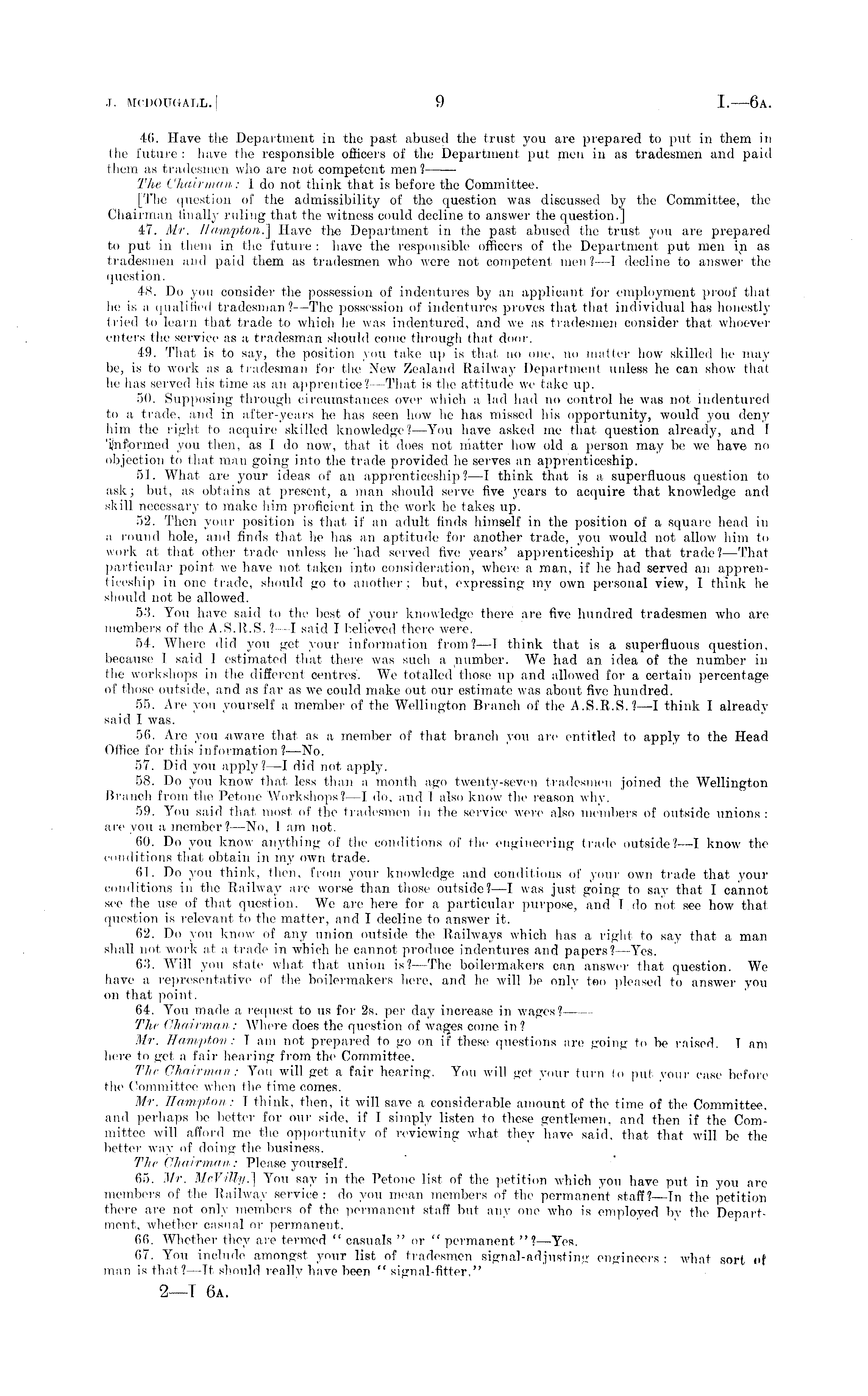 46. Have the Department in the past abused the trust you are prepared to put in them in the future: have the responsible officers of the Department put men in as tradesmen and paid them as tradesmen who are not competent men ? The Chairman: Ido not think that is before the Committee. [The question of the admissibility of the question was discussed by the Committee, the Chairman finally ruling that the witness could decline to answer the question.] 4-7. Mr. Hampton.] Have the Department in the past abused the trust you are prepared to put in them in the future : have the responsible officers of the Department put men in as tradesmen and paid them as tradesmen who were not competent men ?—I decline to answer the question. 48. Do you consider the possession of indentures by an applicant for employment proof that he is a qualified tradesman? —The possession of indentures proves that that individual has honestly tried to learn that trade to which he was indentured, and we as tradesmen consider that whoever enters the service as a tradesman should come through that door. 49. That is to say, the position you take up is that no one, no matter how skilled he may be, is to work as a tradesman for the New Zealand Railway Department unless he can show that he has served his time as an apprentice? —That is the attitude we take up. 50. Supposing through circumstances over which a lad had no control he was not indentured to a trade, and in after-years he has seen how he has missed his opportunity, woulcT you deny him the right to acquire skilled knowledge? —You have asked me that question already, and 1 'informed you then, as I do now, that it does not matter how old a person may be we have no objection to that man going into the trade provided he serves an apprenticeship. 51. What are your ideas of an apprenticeship?—l think that is a superfluous question to ask; but, as obtains at present, a man should serve five years to acquire that knowledge and skill necessary to make him proficient in the work he takes up. 52. Then your position is that if an adult finds himself in the position of a square head in a round hole, and finds that he has an aptitude for another trade, you would not allow him to work at that other trade unless he "had served five years' apprenticeship at that trade? —That particular point we have not taken into consideration, where a man, if he had served an apprenticeship in one trade, should go to another; but, expressing my own personal view, 1 think he should not be allowed. 53. You have said to the best of your knowledge there are five hundred tradesmen who are members of the A.S.R.S. ? —I said I believed there were. 54. Where did you get your information from?—l think that is a superfluous question, because 1 said I estimated that there was such a number. We had an idea of the number in the workshops in the different centres. We totalled those up and allowed for a certain percentage of those outside, and as far as we could make out our estimate was about five hundred. 55. Are you yourself a member of the Wellington Branch of the A.S.R.S.?—I think I already said I was. 56. Are you aware that as a member of that branch you are entitled to apply to the Head Office for this information ?—No. 57. Did you apply?—l did not apply. 58. Do you know that less than a month ago twenty-seven tradesmen joined the Wellington Branch from the Petone Workshops?—l do, and I also know the reason why. 59. You said that most of the tradesmen in the service were also members of outside unions : are you a member?—No, 1 am not. 60. Do you know anything of the conditions of the engineering trade outside?—l know the conditions that obtain in my own trade. 61. Do you think, then, from your knowledge and conditions of your own trade that your conditions in the Railway are worse than those outside?—l was just going to say that I cannot see the use of that question. We are here for a particular purpose, and [ do not see how that question is relevant to the matter, and I decline to answer it. 62. Do you know of any union outside the Railways which has a right to say that a man shall not work at a trade in which he cannot produce indentures and papers?— Yes. 63. Will you state what that union is? —The boilermakers can answer that question. We have a representative of the boilermakers here, and he will be only teo pleased to answer you on that point. 64. You made a request to us for 2s. per day increase in wages? The Chairman: Where does the question of wages come in ? Mr. Hamilton: lam not prepared to go on if these questions are going to be raised. 1 am here to get a fair hearing from the Committee. The Chairman: You will get a fair hearing. You will get your turn to put your case before the Committee when the time comes. Mr. Hampton: I think, then, it will save a considerable amount of the time of the Committee, and perhaps be better for our side, if I simply listen to these gentlemen, and then if the Committee will afford me the opportunity of reviewing what they have said, that that will be the better way of doing the business. The Chairman: Please yourself. 65. Mr. McVitty.~\ You say in the Petone list of the petition which you have put in you are members of the Railway service: do you mean members of the permanent staff?—ln the petition there are not only members of the permanent staff but any one who is employed by the Department, whether casual or permanent. 66. Whether they are termed " casuals " or " permanent "? —Yes. 67. You include amongst your list of tradesmen signal-adjusting engineers ; what sort of man is that? —It should really have been " signal-fitter."