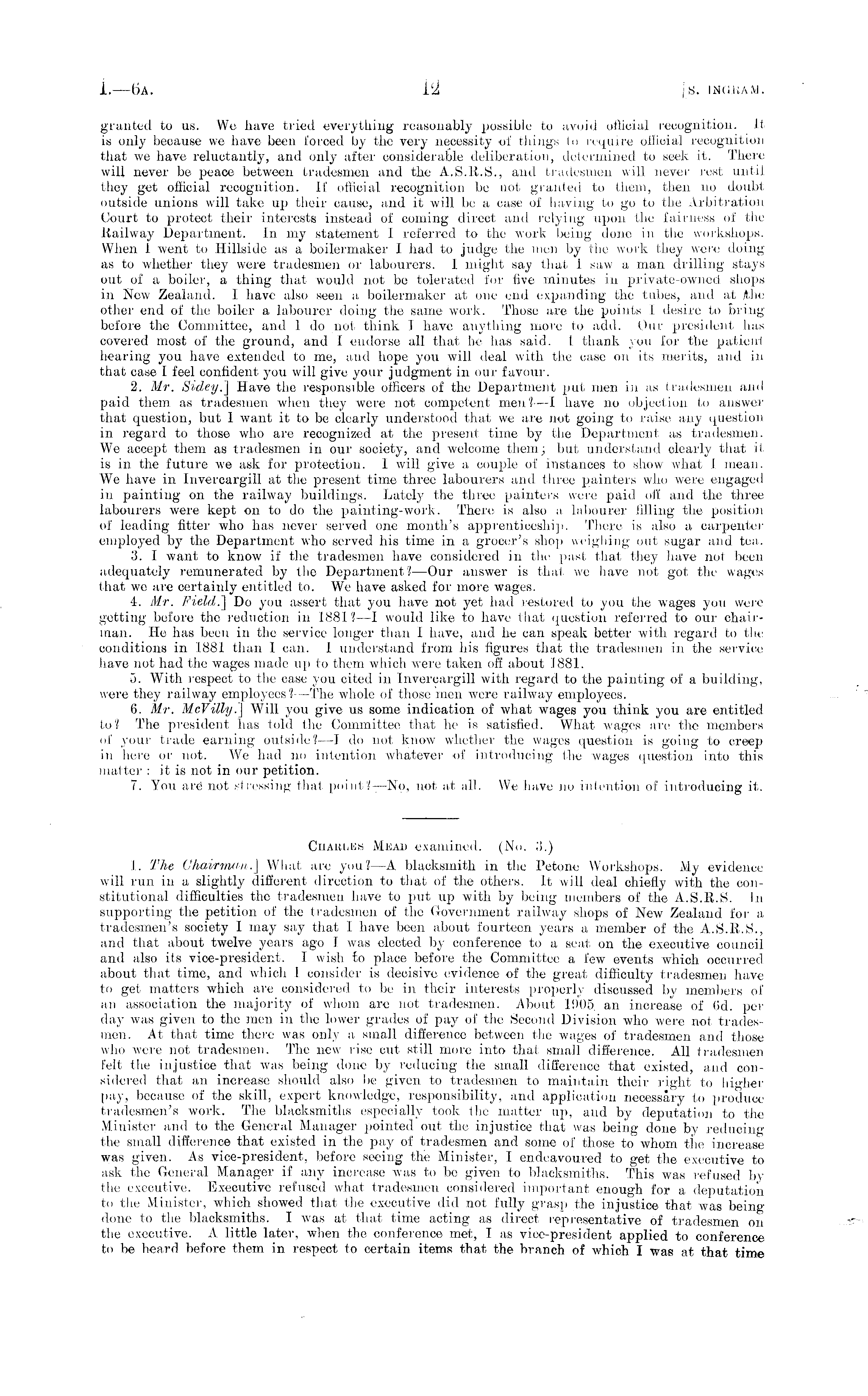 granted to us. We have tried everything reasonably possible to avoid official recognition. It is only because we have been forced by the very necessity of things to require official recognition that we have reluctantly, and only after considerable deliberation, determined to seek it. There will never be peace between tradesmen and the A.S.R.S., and tradesmen will never rest until they get official recognition. If official recognition be not granted to them, then no doubt outside unions will take up their cause, and it will be a case of having to go to the Arbitration Court to protect their interests instead of coming direct and relying upon the fairness of the Railway Department. In my statement 1 referred to the work being done in the workshops. When 1 went to Hillside as a boilermaker 1 had to judge the men by the work they were doing as to whether they were tradesmen or labourers. I might say that 1 saw a man drilling stays out of a boiler, a thing that would not be tolerated for five minutes in private-owned shops in New Zealand. I have also seen a boilermaker at one end expanding the tubes, and at /the other end of the boiler a labourer doing the same work. Those are the points 1 desire to bring before the Committee, and I do not think I have anything more to add. Our president has covered most of the ground, and I endorse all that he has said. L thank you for the patient hearing you have extended to me, and hope you will deal with the case on its merits, and in that case I feel confident you will give your judgment in our favour. 2. Mr. Sidey.] Have the responsible officers of the Department put men in as tradesmen and paid them as tradesmen when they were not competent men?—l have no objection to answer that question, but 1 want it to be clearly understood that we are not going to raise any question in regard to those who are recognized at the present time by the Department as tradesmen. We accept them as tradesmen in our society, and welcome them; but understand clearly that it is in the future we ask for protection. 1 will give a couple of instances to show what 1 mean. We have in Invercargill at the present time three labourers and three painters who were engaged in painting on the railway buildings. Lately the three painters were paid off and the three labourers were kept on to do the painting-work. There is also a labourer filling the position of leading fitter who has never served one month's apprenticeship. There is also a carpenter employed by the Department who served his time in a grocer's shop weighing out sugar and tea. 3. 1 want to know if the tradesmen have considered in the past that they have not been adequately remunerated by the Department?— Our answer is that we have not got the wages that we are certainly entitled to. We have asked for more wages. 4. Mr. Field.~\ Do you assert that you have not yet had restored to you the wages you were getting before the reduction in 1881? —I would like to have that question referred to our chairman. He has been in the service longer than I have, and he can speak better with regard to the conditions in 1881 than I can. J understand from his figures that the tradesmen in the service have not had the wages made up to them which were taken off about 1881. 0. With respect to the case you cited in Invercargill with regard to the painting of a building, were they railway employees? —The whole of those men were railway employees. 6. Mr. McVilly.] Will you give us some indication of what wages you think you are entitled to? The president has told the Committee that he is satisfied. What wages are the members of your trade earning outside? —I do not know whether the wages question is going to creep in here or not. We had no intention whatever of introducing the wages question into this matter : it is not in our petition. 7. You art not stressing that point?—No, not at all. We have no intention of introducing it. Chaklks Mead examined. (No. 3.) 1. The Chairnum.] What are you?—A blacksmith in the Petone Workshops. My evidence will run in a slightly different direction to that of the others. It will deal chiefly with the constitutional difficulties the tradesmen have to put up with by being members of the A.S.R.S. In supporting the petition of the tradesmen of the Government railway shops of New Zealand for a tradesmen's society I may say that I have been about fourteen years a member of the A.S.R.S., and that about twelve years ago I was elected by conference to a seat on the executive council and also its vice-president. 1 wish to place before the Committee a few events which occurred about that time, and which I consider is decisive evidence of the great difficulty tradesmen have to get matters which are considered to be in their interests properly discussed by members of an association the majority of whom are not tradesmen. About 1905 an increase of Gd. per day was given to the men in the lower grades of pay of the Second Division who were not tradesmen. At that time there was only a small difference between the wages of tradesmen and those who were not tradesmen. The new rise cut still more into that small difference. All tradesmen felt the injustice that was being done by reducing the small difference that existed, and considered that an increase should also be given to tradesmen to maintain their right to higher pay, because of the skill, expert knowledge, responsibility, and application necessary to produce tradesmen's work. The blacksmiths especially took the matter up, and by deputation to the Minister and to the General Manager pointed out the injustice that was being done by reducing the small difference that existed in the pay of tradesmen and some of those to whom the increase was given. As vice-president, before seeing the Minister, I endeavoured to get the executive to ask the General Manager if any increase was to be given to blacksmiths. This was refused by the executive. Executive refused what tradesmen c