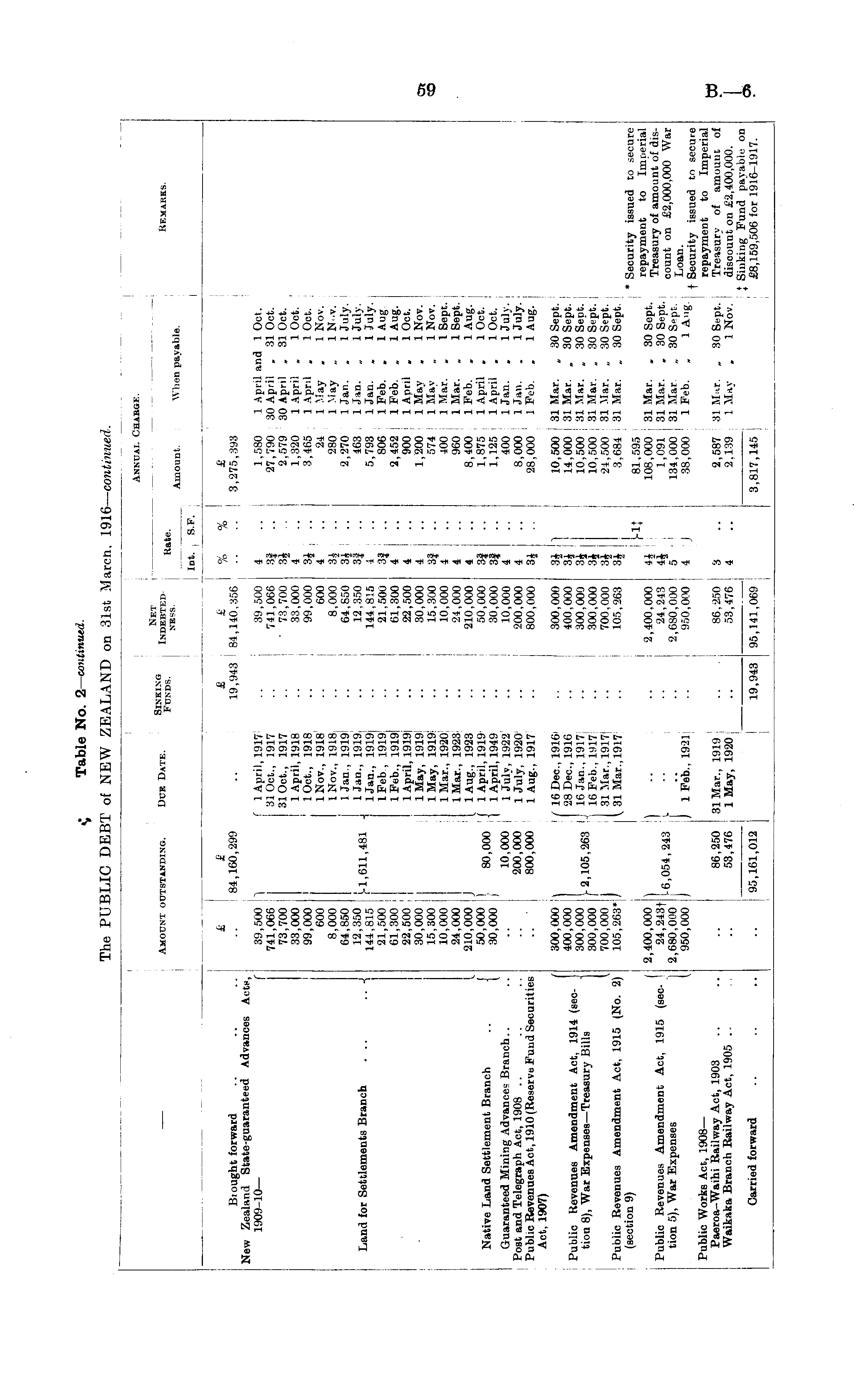 Annual Charge. Amount outstanding. Duit Date. Sinking Funds. Net Indebted NESS. i Kate. Int. I S.F. Amount. When payable. Remarks. Bi ought forward New Zealand State-guaranteed Advances Acts, 1909-10— f £ £ 84,160,299 £ 14,160,299 £ £ 19,943 84,140,356 % % £ 3,275,393 Land for Settlements Branch ... .. -{ 39,500 741,066 73,700 33,000 , 99,000 600 8,000 64,850 12,350 144,815 I 21,500 61,300 22,500 30,000 15,300 : 10,000 24,000 210,000 50,000 30,000 1 f 1 April, 1917 31 Oct., 1917 31 Oct., 1917 1 April, 1918 lOct., 1918 INov., 1918 1 Nov., 1918 1 Jan., 1919 I, .,, in, 1 Jan., 1919 -1,611,481 H 1Jan _. igl9 lFeb , 1919 lFeb., 1919 1 1 April, 1919i IMay, 19191 1 May, 1919: 1 Mar., 1920 IMar., 1923 J (_ lAug., 1923 1 80 000 ' 1 April, 1919 I BU ' UUU ■ 1 April, 1949 10,000 1 Julv, 1922 200,000 1 July, 1920 800,000 1 Aug., 1917 1,611,481 39,500 741,066 ' 73,700 33,000 99,000 600 8,000 64,850 12.350 144,815 21,500 61,300 22,500 30,000 15,300 10,000 24,000 210,000 50,000 30,000 10,000 200,000 800,000 4 4 4 4 4 4 4 4 4 4 4 4 8* 1,580 1 April and 1 Oct. 27,790 30 April . 31 Oct. 2,579 30 April . 31 Oct. 1,320 1 April . 1 Oct. 3,465 1 April . 1 Oct. 24 1 May . 1 Nov. 280 1 May „ 1 N.v. 2,270 1 Jan. , 1 July. 463 1 Jan. „ 1 Julv. 5,793 1 Jan. , 1 Julv. 806 1 Feb. . 1 Aug 2,452 1 Feb. „ 1 Aug. 900 1 April „ 1 Oct. 1,200 IMay . 1 Nov. 574 1 Mav „ 1 Nov. 400 1 Mar. » I Sept. 960 1 Mar. , 1 Sept. 8,400 1 Feb. . 1 Aug. 1,875 1 April . 1 Oct. 1,125 1 April . 1 Oct. 400 1 Jan. . 1 Julv. 8,000 1 Jan. . 1 July. 28,000 1 Feb. . 1 Aug. Native Land Settlement Branch .. j Guaranteed Mining Advance; Branch.. Post and Telegraph Act, 1908 Public Revenues Act, 1910 (Reserve Fund Securities Act, 1907) ■- •• Public Revenues Amendment Act, 1914 (sec- j tion 8), War Expenses —Treasury Bills Public Revenues Amendment Act, 1915 (No. 2) (section 9) 300,000 400,000 300,000 300,000 700,000 : 105,263* \ / 16 Dec.,1916 28 Dec, 1916 9 105 9fiq _, 16 Jan., 1917 f 2,100,263 . 16Pebil917 I 31 Mar., 1917 / v 31 Mar., 1917 300,000 400,000 300,000 300,000 700,000 105,263 3| 3J ] - J -It I 10,500 31 Mar. „ 30 Sept. 14,000 31 Mar. „ 30 Sept. 10,500 31 Mar. . 30 Sent. 10,500 31 Mar. „ 30 Sept. 24.500 31 Mar. „ 30 Sept. 3,684 31 Mar. „ 30 Sept. ftl _». * Security issued to secure lOsioOO 31 Mar. . 30 Sept. to Imperial 1091 31 Mar. . 30 Sept. 7 JZ^Lxv"' 134!000 31 Mar „ 30 Sept. °° unt on £2,000,000 War 38,000 1 Feb. . 1 Aug. , q":, , , ° f Security issued to secure repayment to Imperial 2,587 31 M.r. „ 30 Sspt. Treasurv of amount of 2,139 ! May . 1 Nov. discount on £2,400,000. I Sinking Fund pavable on 3,817,145 | £8,159,506 for 1916-1917. i Public Revenues Amendment Act, 1915 (section 5), War Expenses 2,400,000 24,243f 2,680,000 950,000 -6,054,243 j. j j 1 Feb., 1921 2,400,000 24,243 2,680,000 950,000 5 4 i J Public Works Act, 1908— Paeroa-Waihi Railway Act, 1903 Waikaka Branch Railway Act, 1905 86,250 i 31 Mar., 1919 53,476 , IMay, 1920 86,250 53,476 3 4 Carried forward 95,161,012 19,943 95,141,069 19,943 95,141,069 I